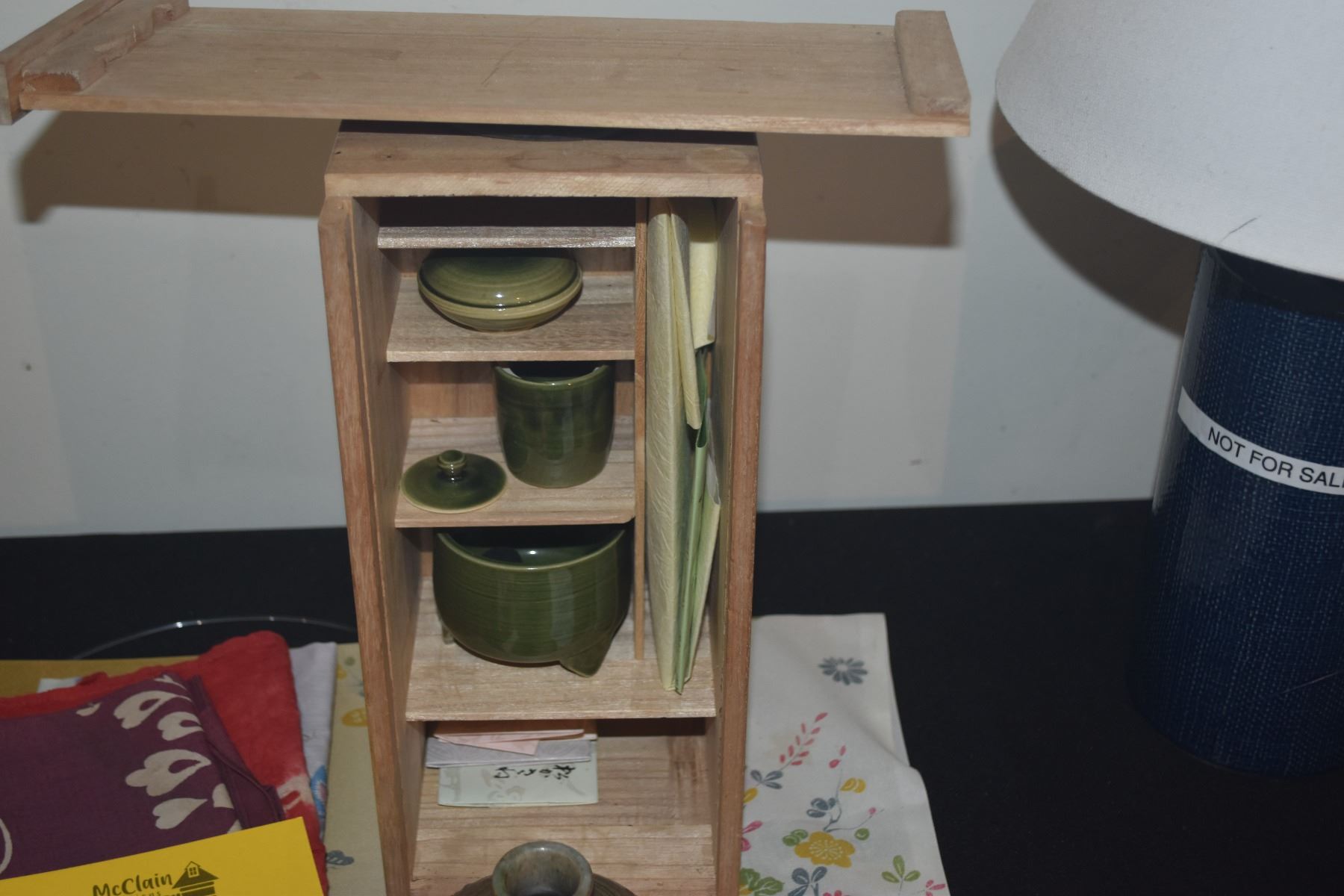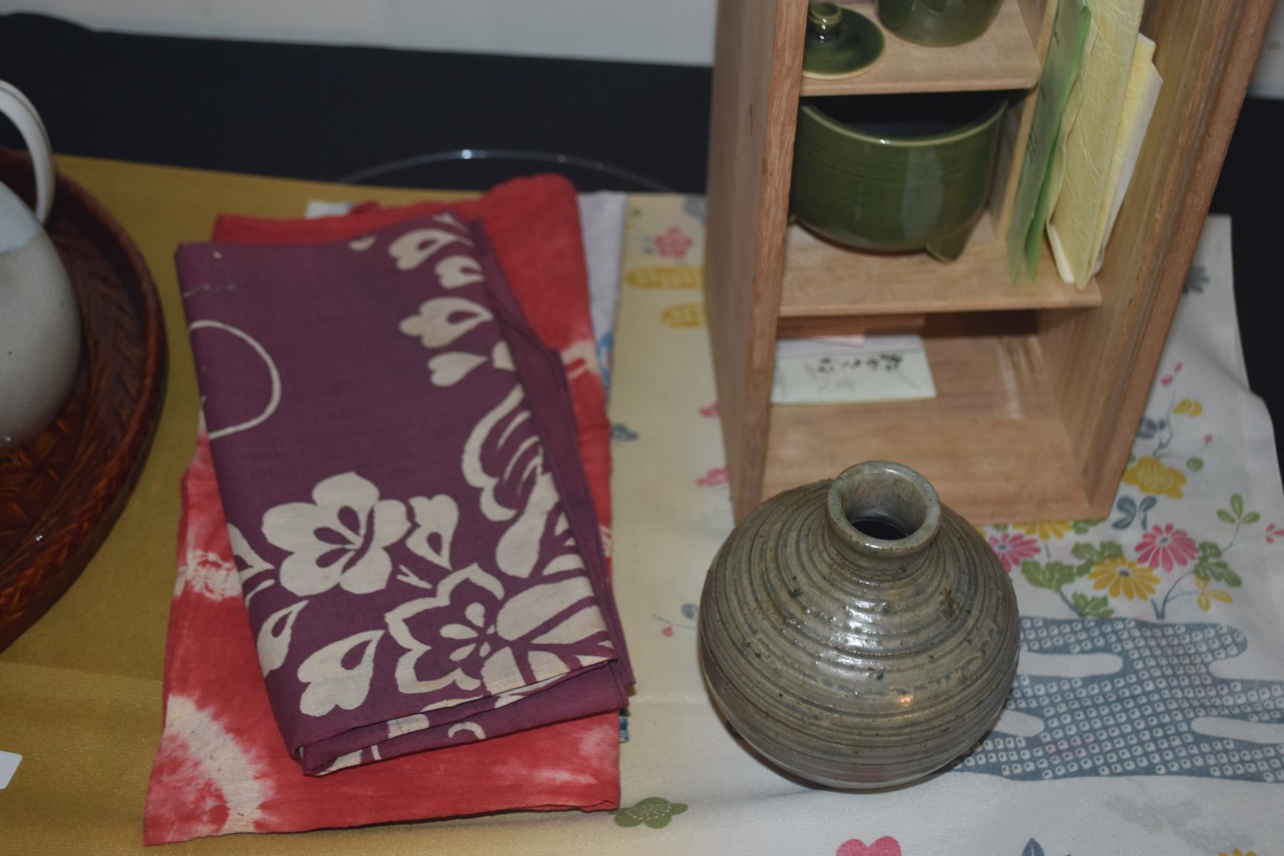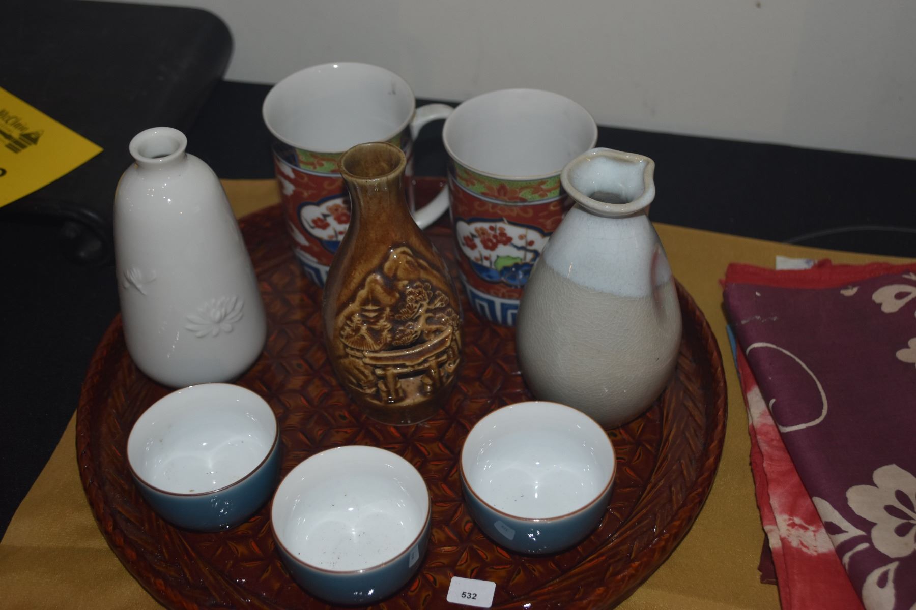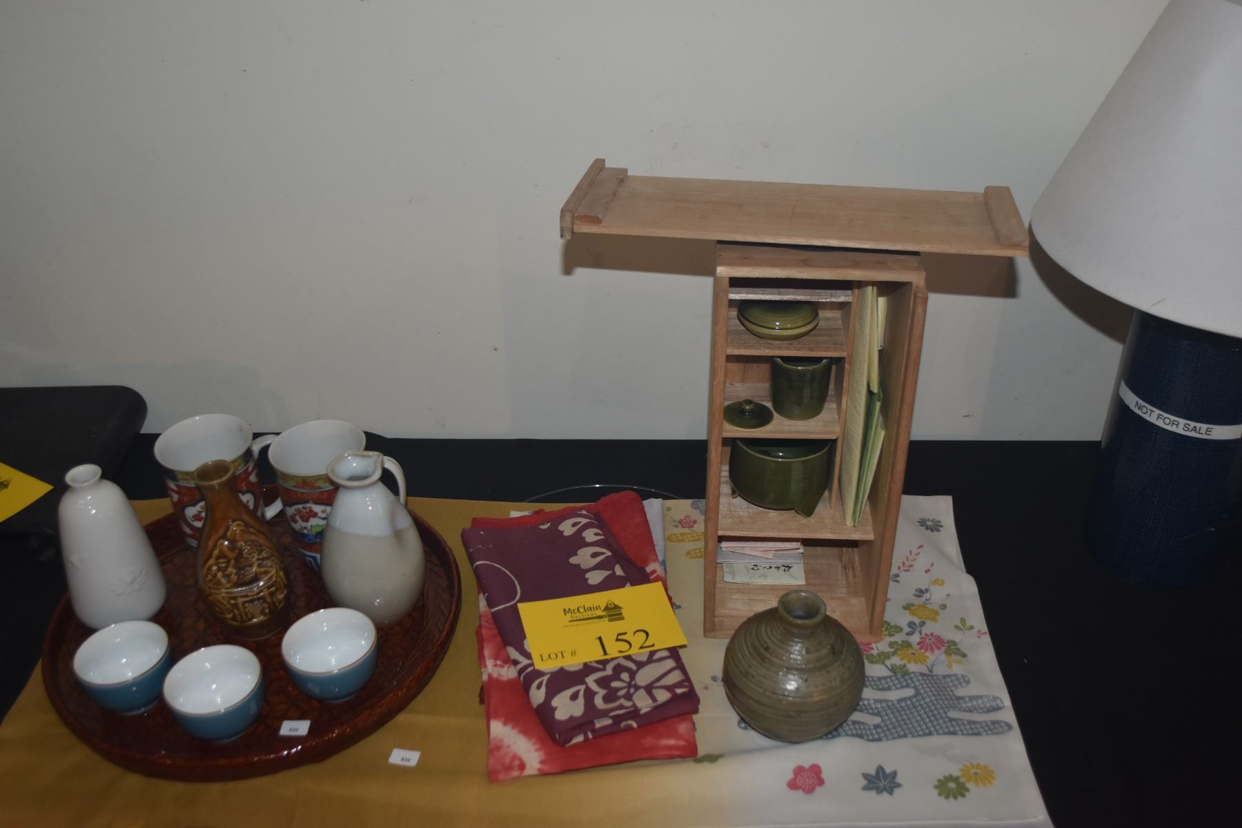 JAPANESE COLLECTION OF ASSORTED SAKI CUPS & BOTTLES, INCENSE SET, TRAY, VASE & FABRIC (21 PCS)