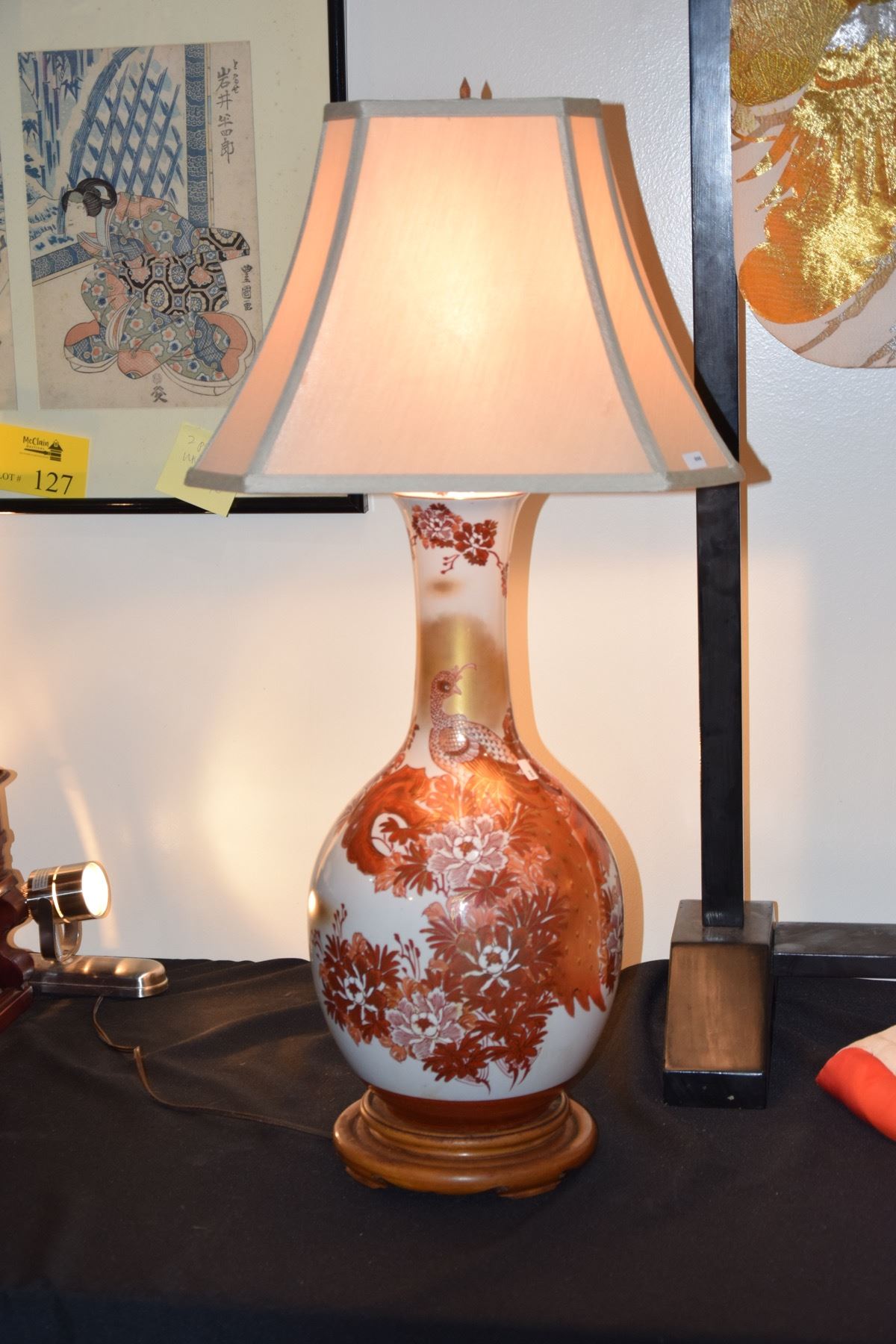 JAPANESE KUTANI LAMPS W/FLORAL & BIRD MOTIF W/SHADE (33 1/2  TALL W/SHADE) (PAIR)