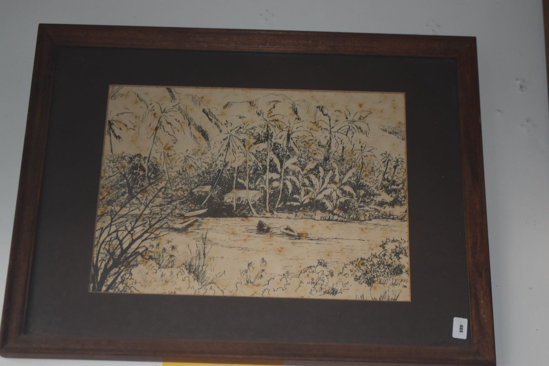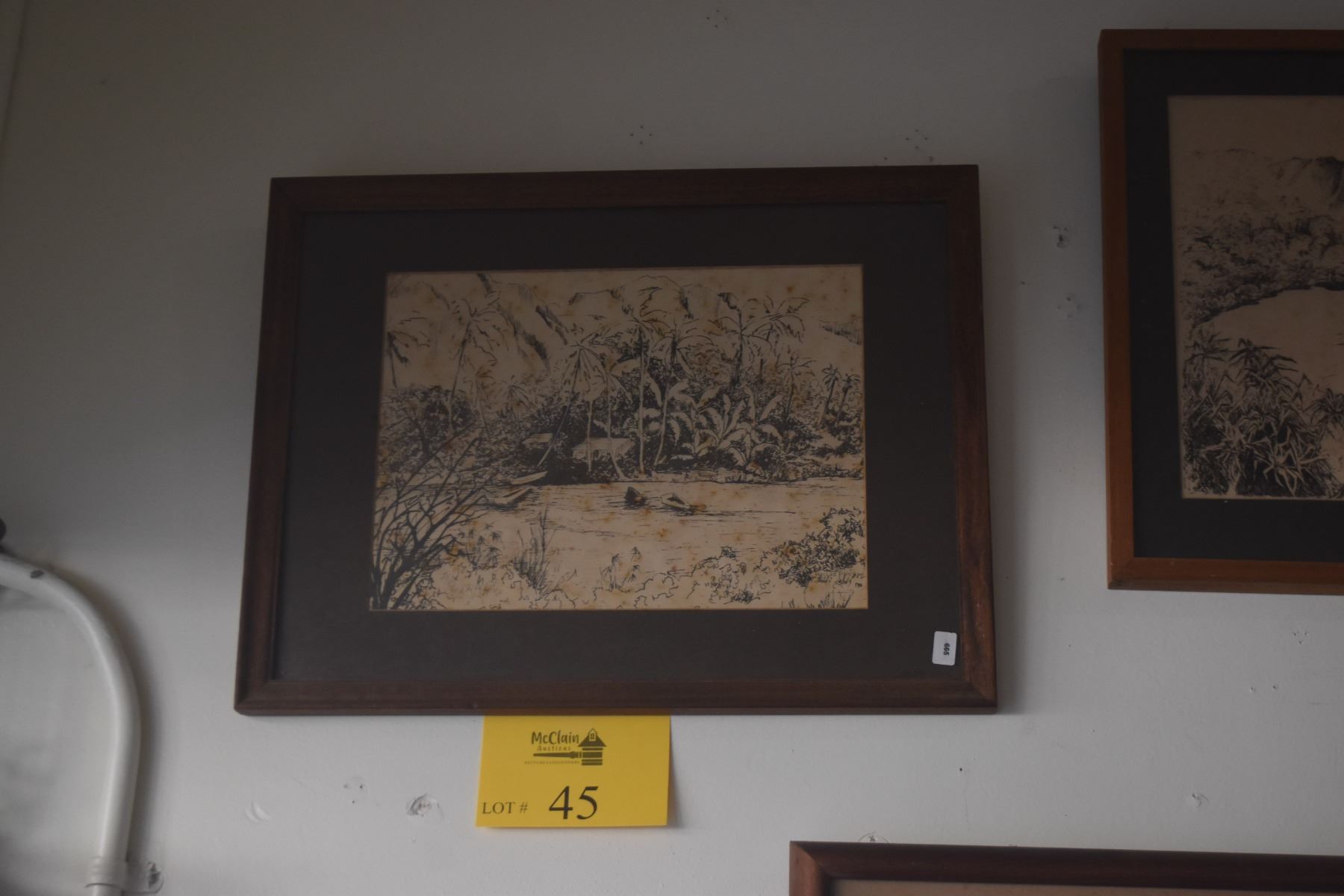 KOA FRAMED BLOCK PRINT, "HUILUA FISH POND"; SIGNED TEDDI SCHOLZ 40/50 (17 1/4" X 13 1/4")
