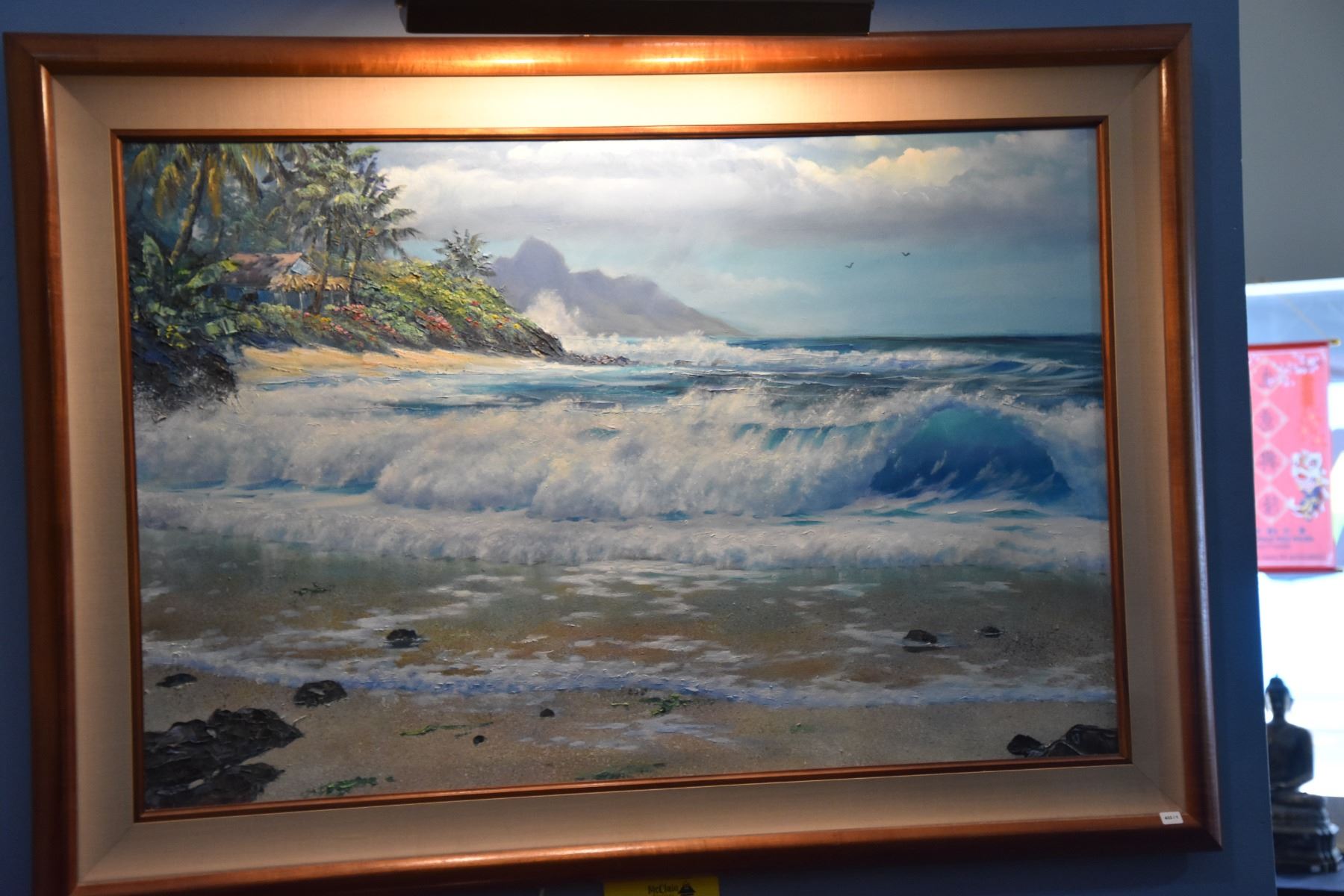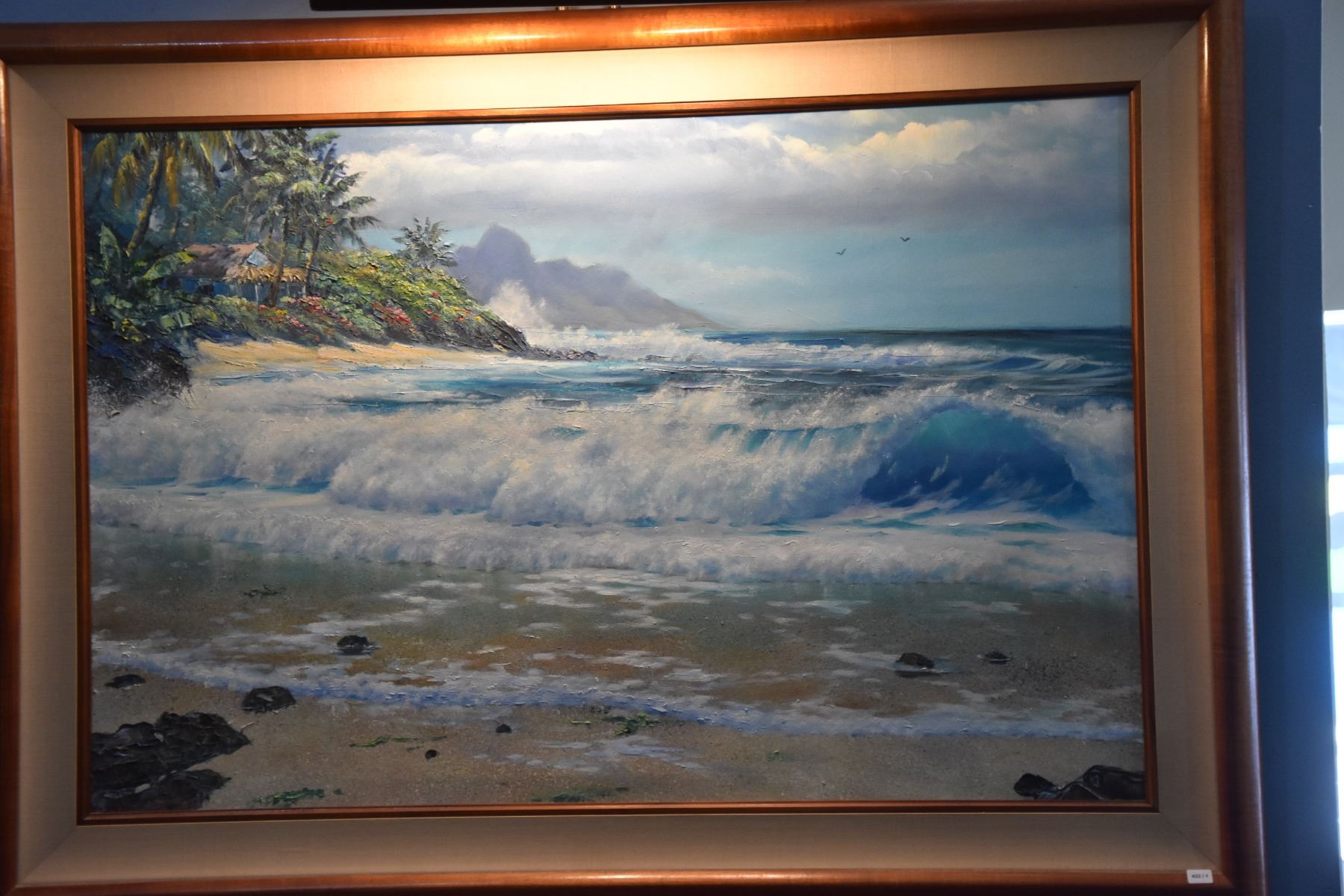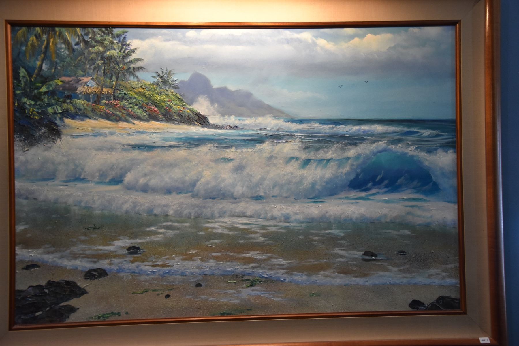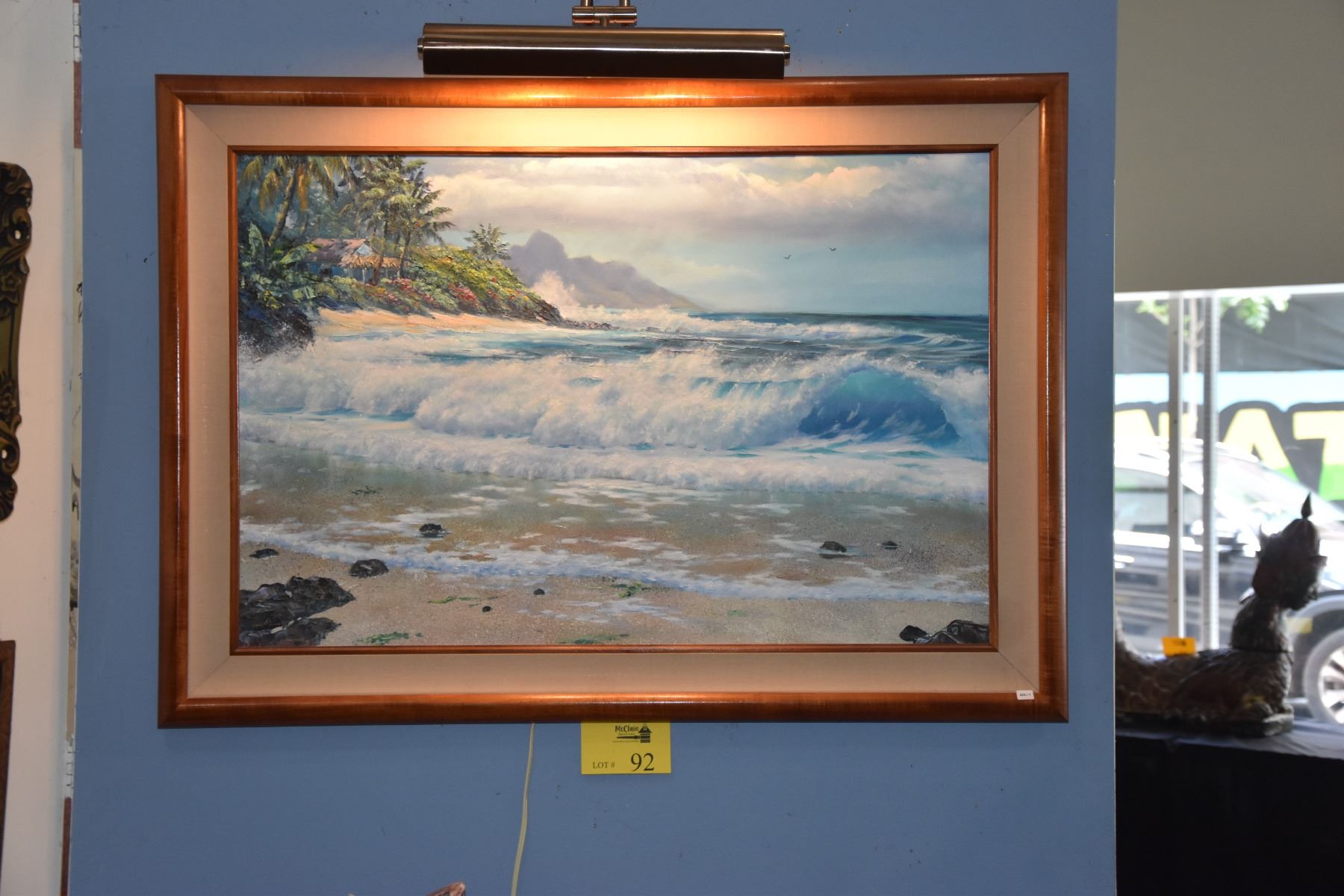 KOA FRAMED HAWAIIAN SEASCAPE; SIGNED STEPHEN SANDS, 1996 W/MOUNTED PICTURE LIGHT (42" X 30")