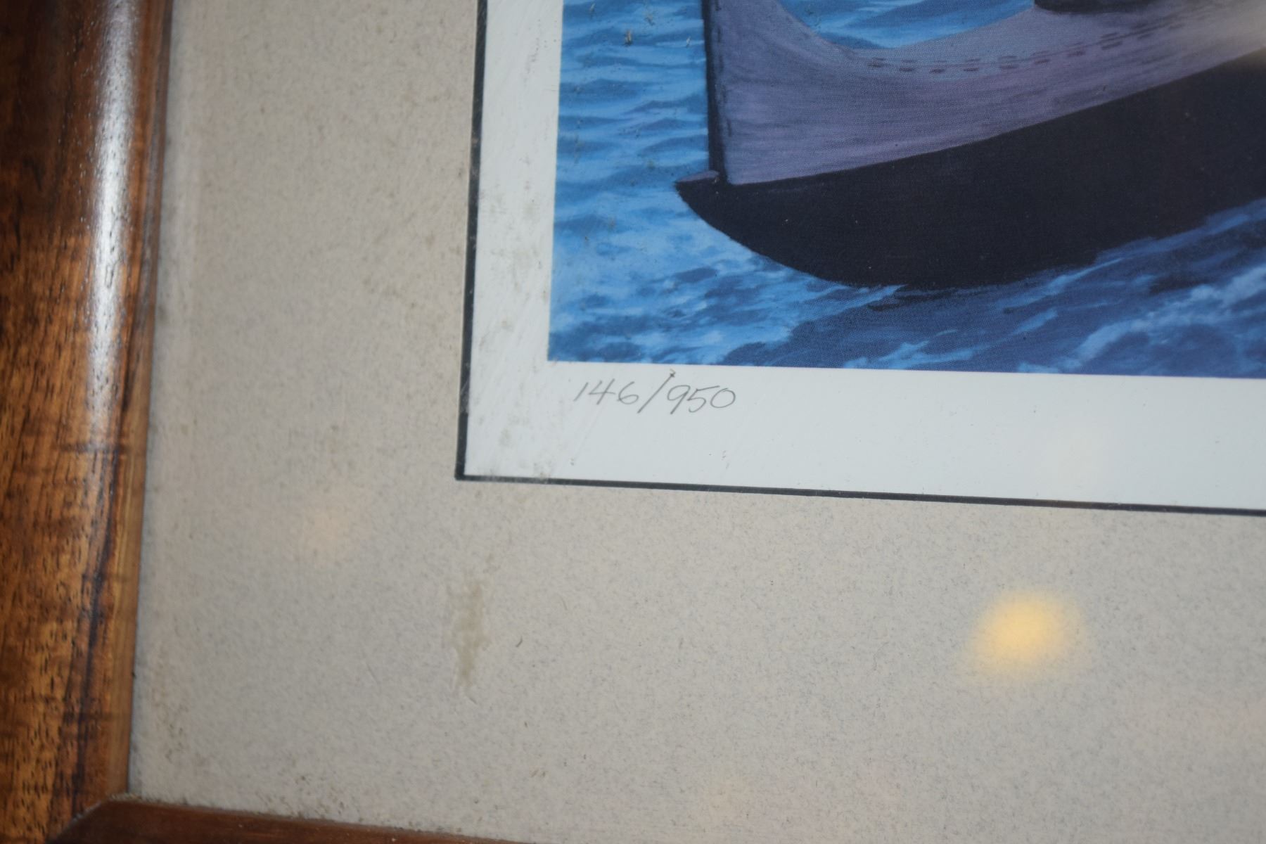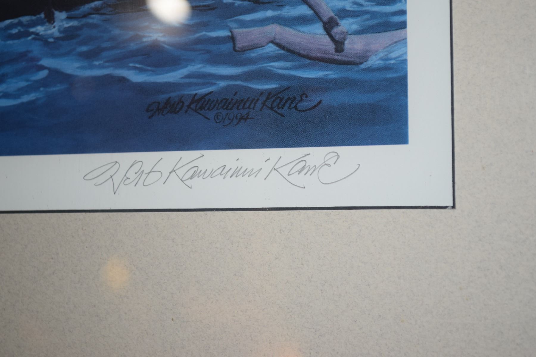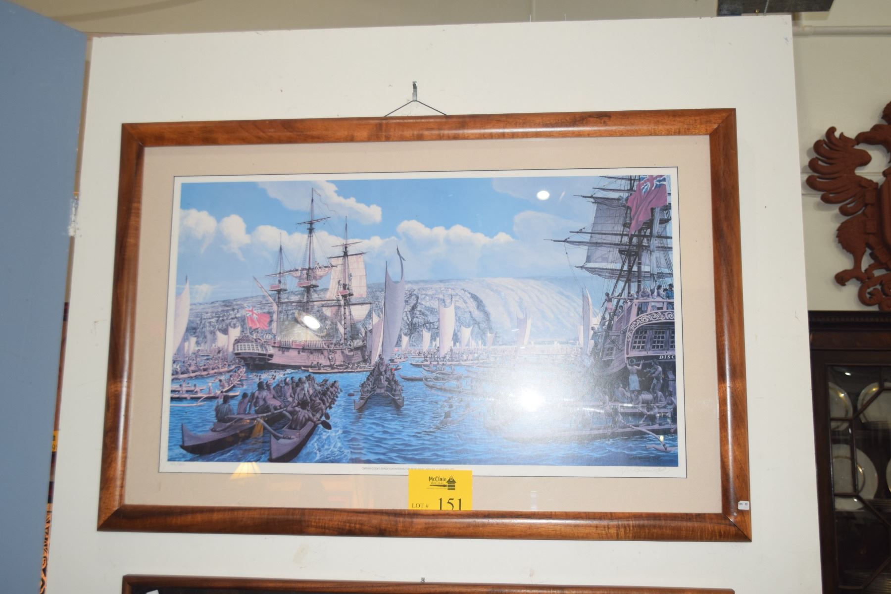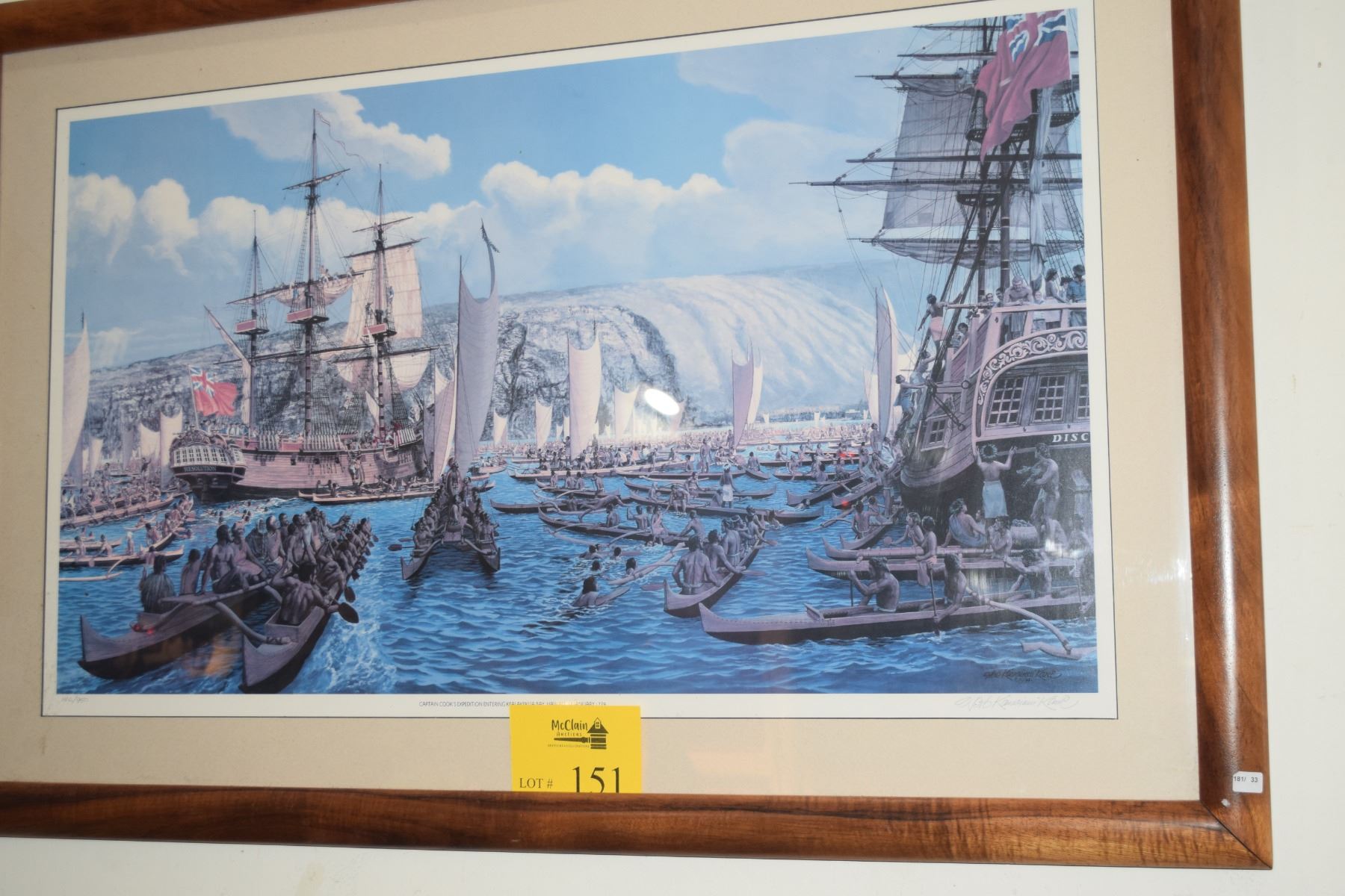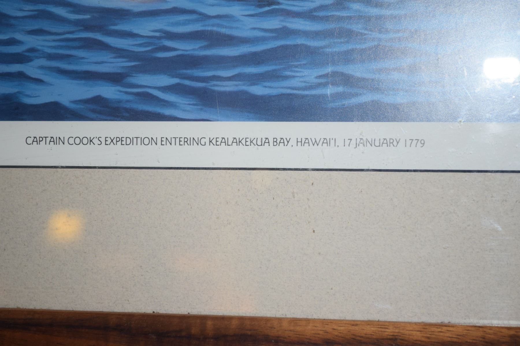 KOA FRAMED PRINT, "CAPTAIN COOK'S EXPEDITION ENTERING KEALAKEHUA BAY"; HERB KANE (32" X 18")