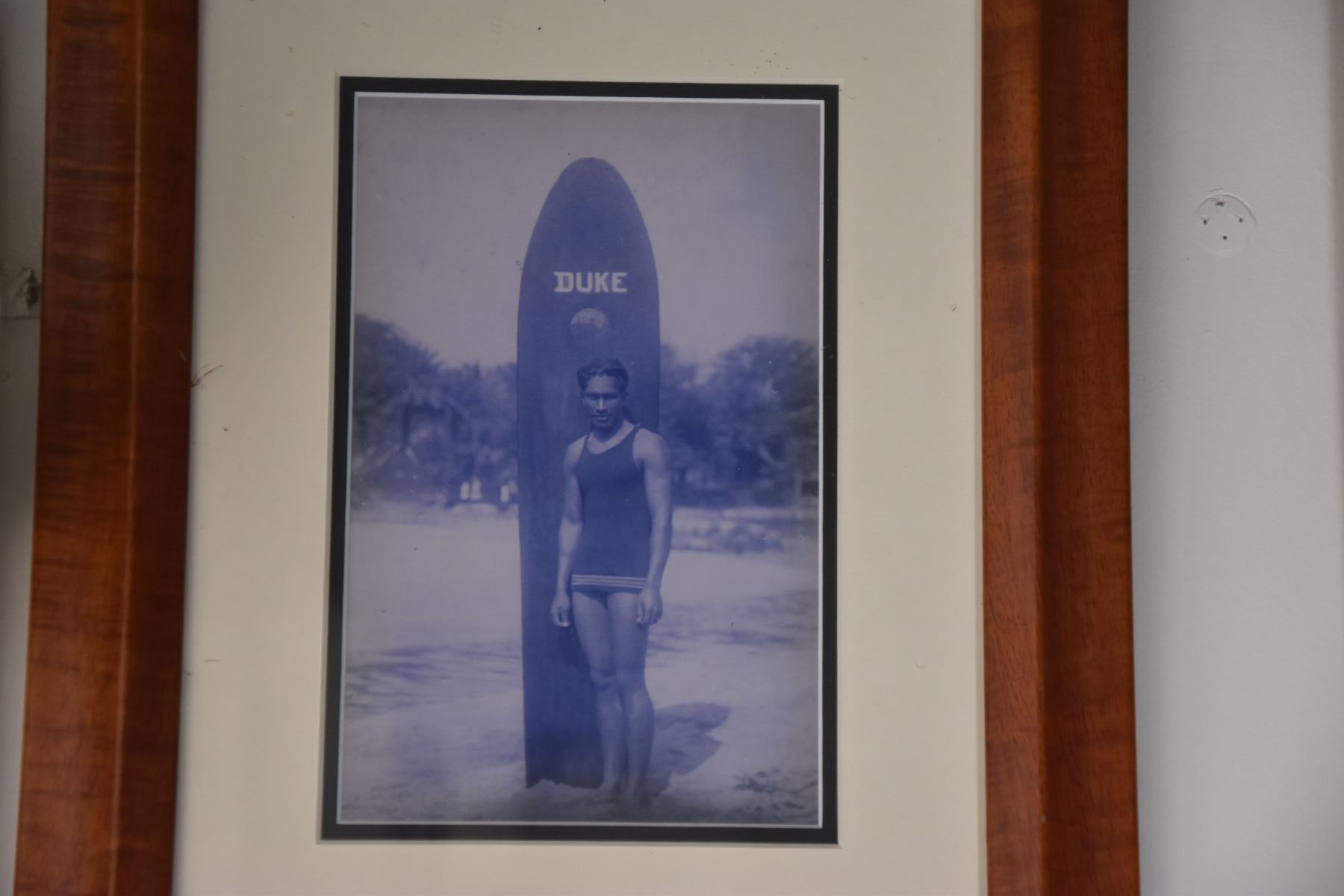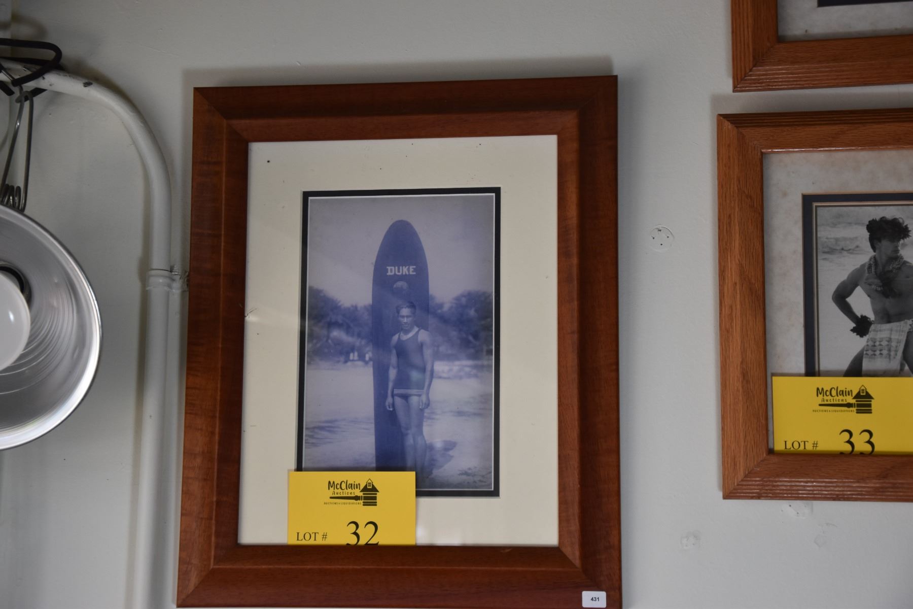 KOA FRAMED REPRODUCTION PHOTOGRAPH FROM BISHOP MUSEUM ARCHIVES, DUKE KAHANAMOKU STANDING IN FRONT OF HIS SURF BOARD ON WAIKIKI BEACH, CA. 1912 (14 1/2" X 17 1/2")