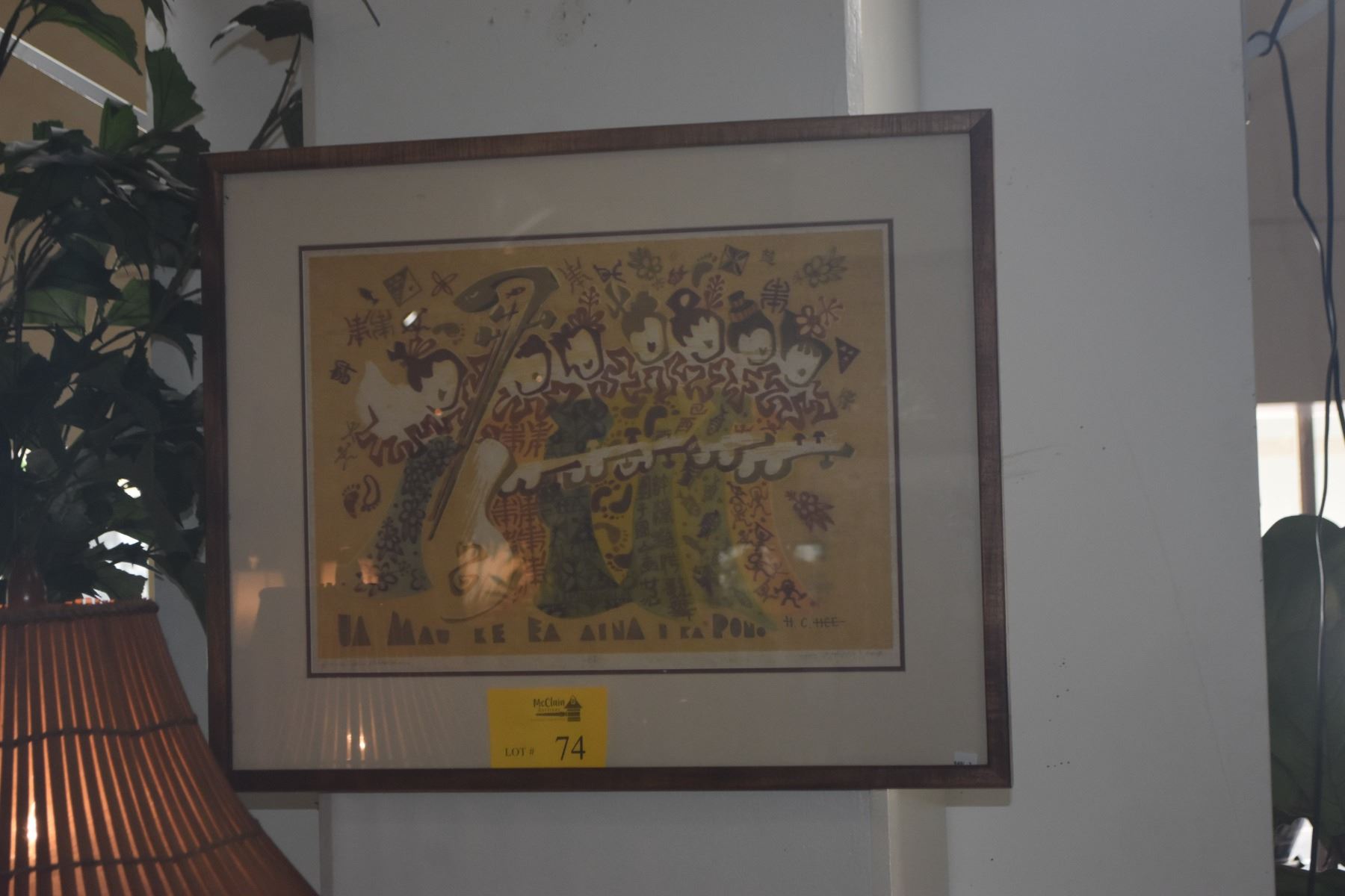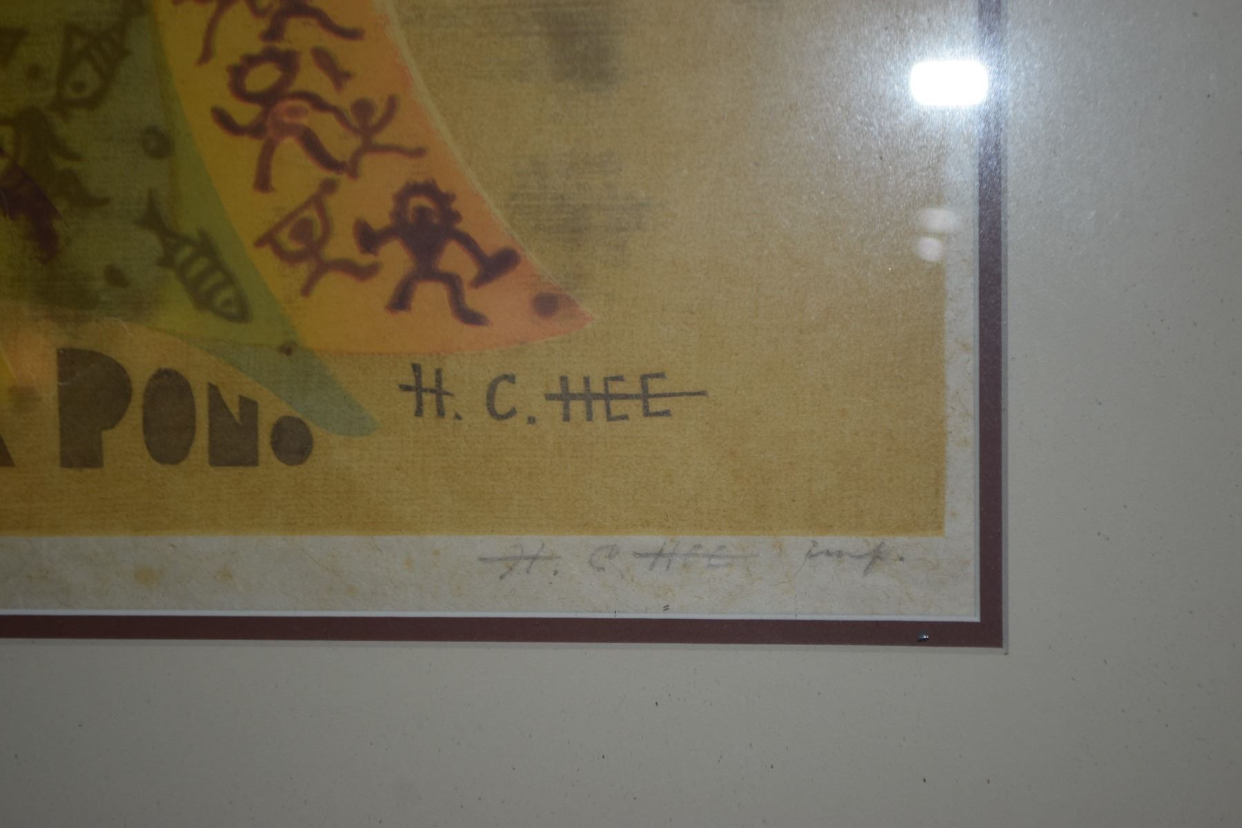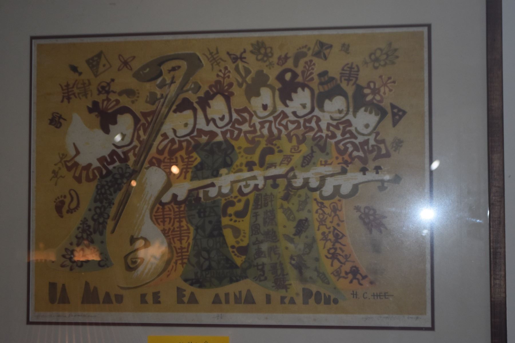 KOA FRAMED WOODBLOCK, HAWAIIAN MUSICIANS; SIGNED HON C. HEE 23/27 (27 1/2" X 22 1/2")
