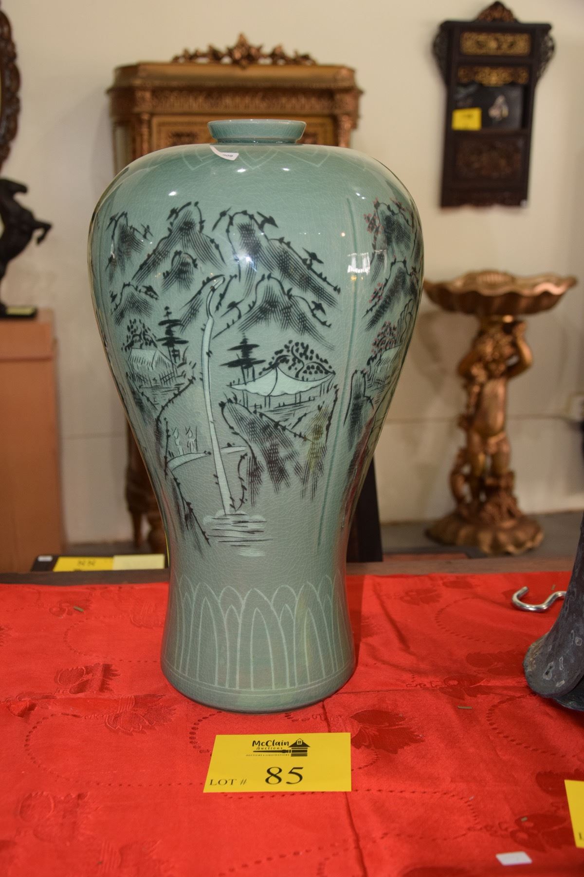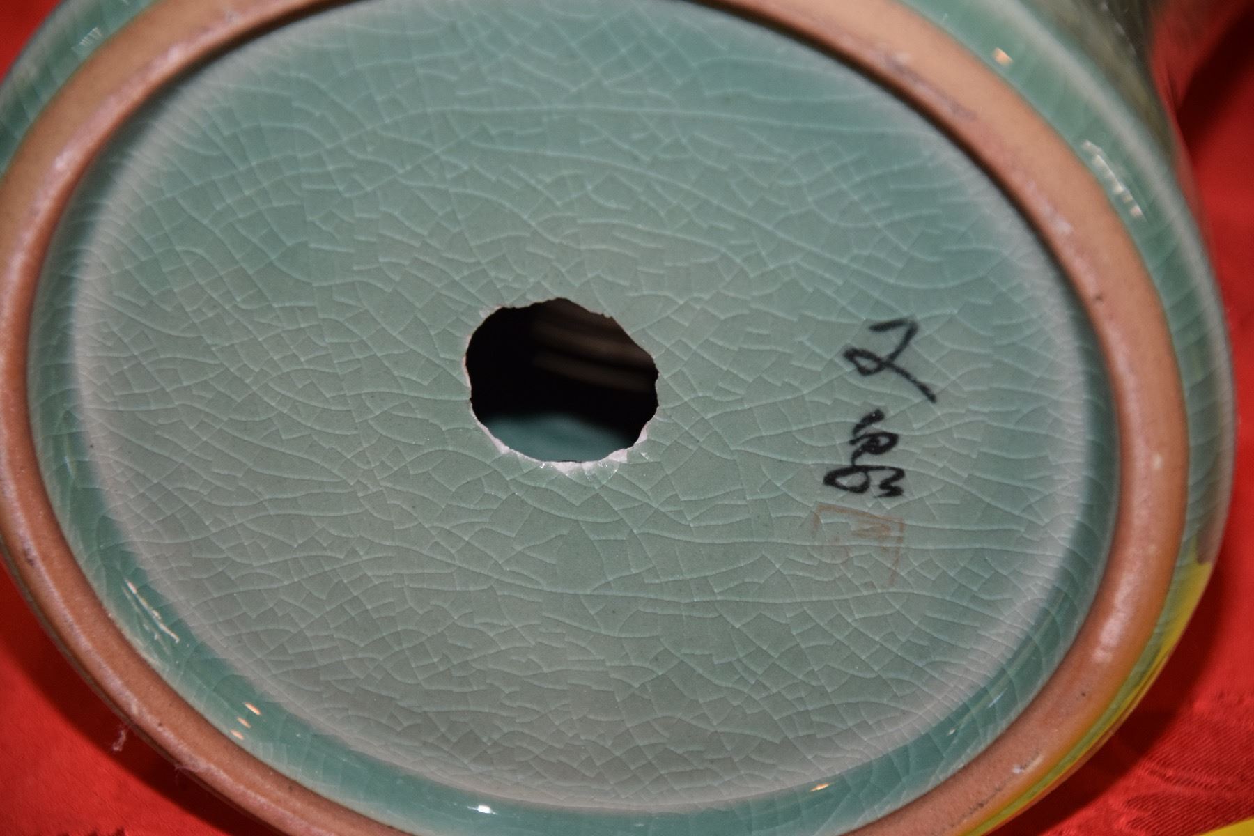 KOREAN CELADON VASE W/DRILLED HOLE IN BOTTOM; SIGNED (17.5")