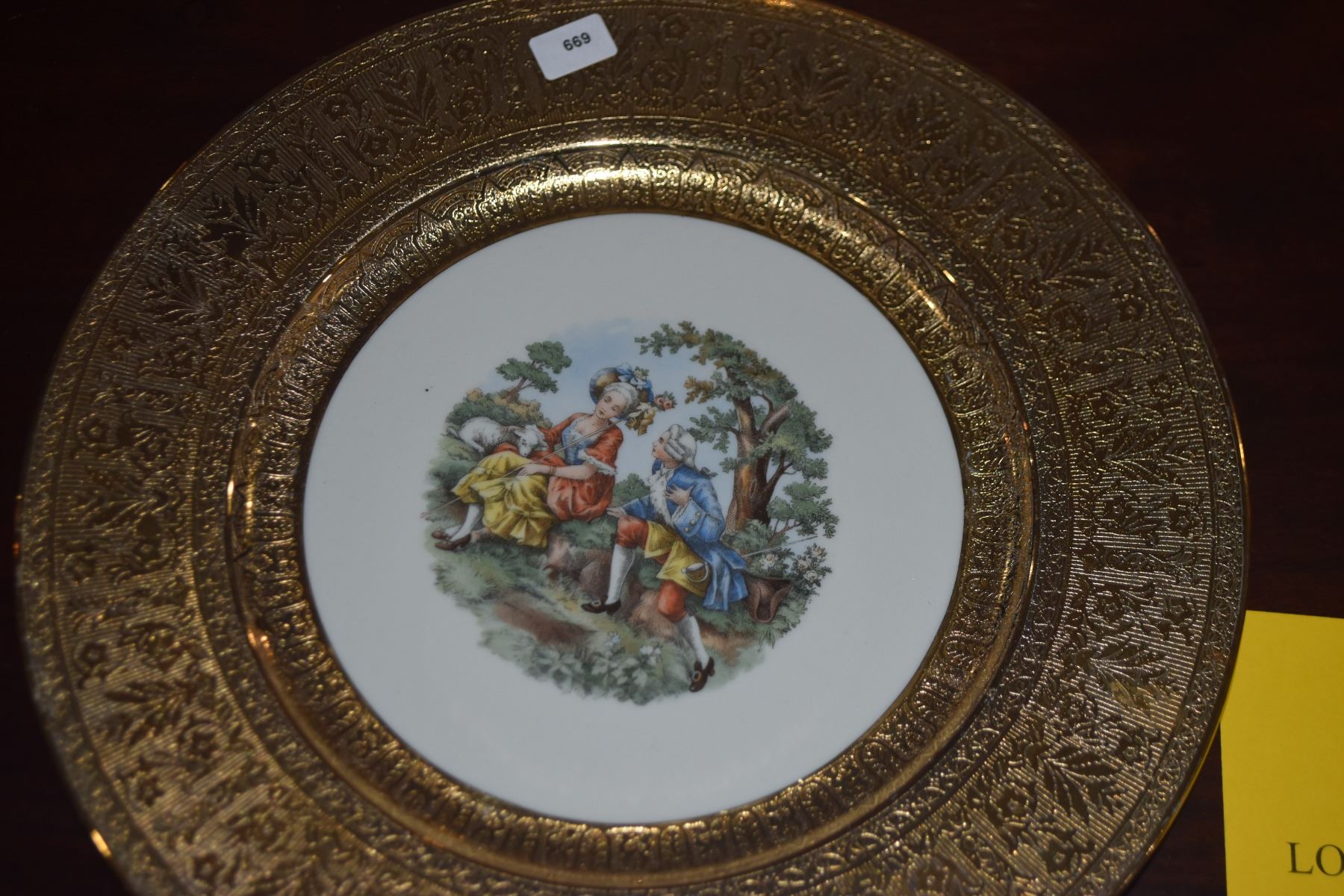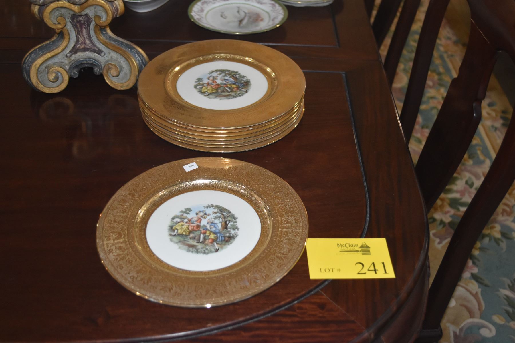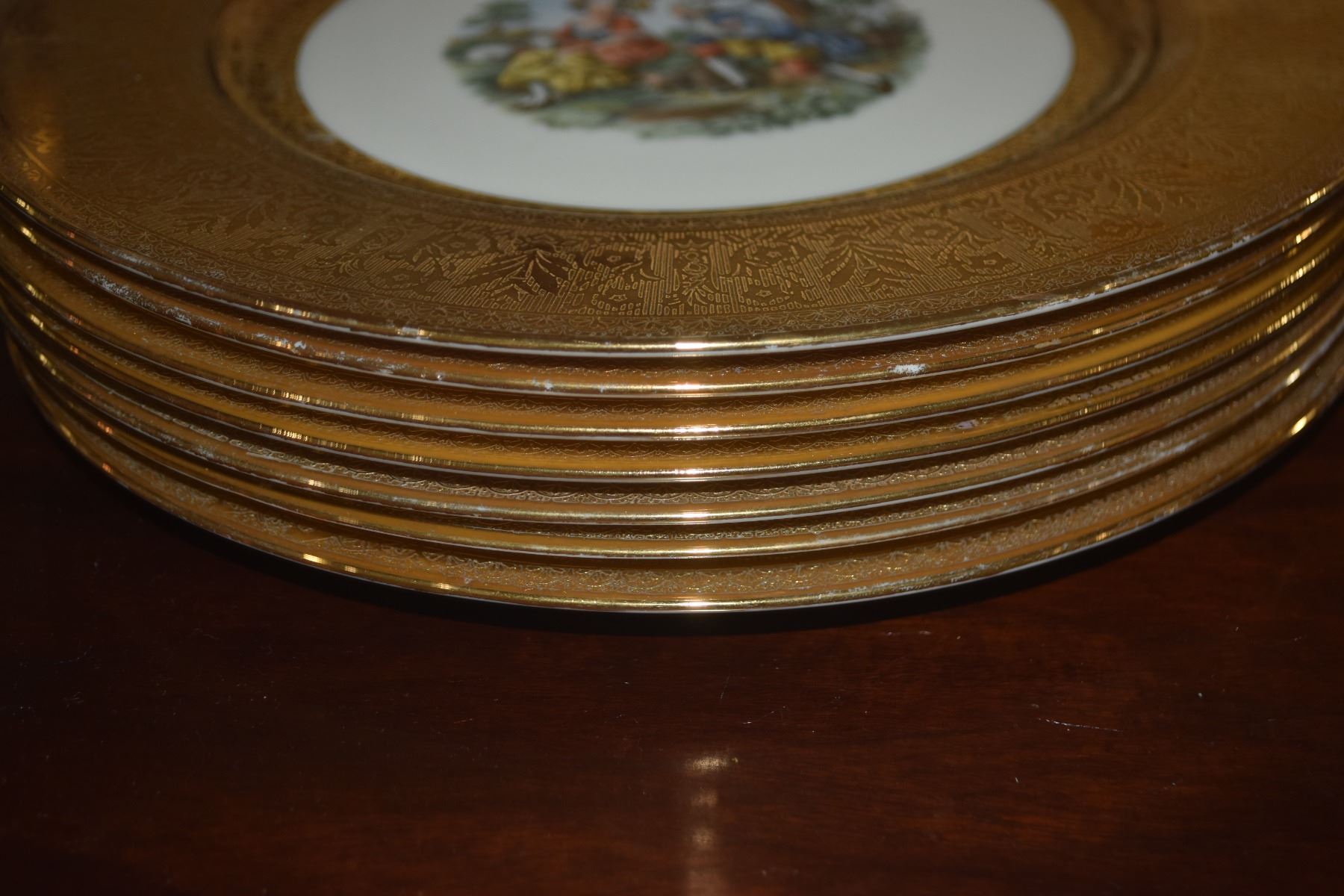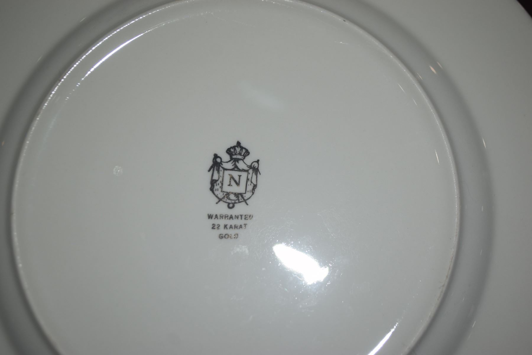 LA PETITE CHINA PLATES, WARRANTED 22 KARAT GOLD FILIGREE RIMS (8 PCS)
