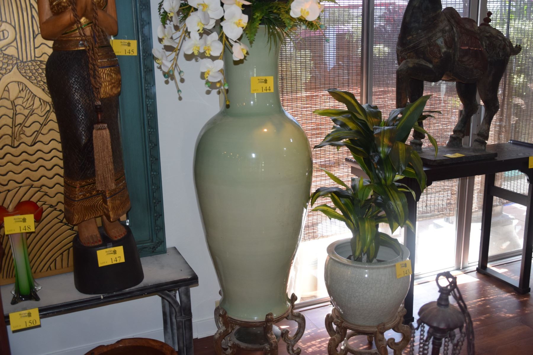 LARGE CERAMIC VASE W/FAUX PLANT & WOOD STAND (50" TALL)