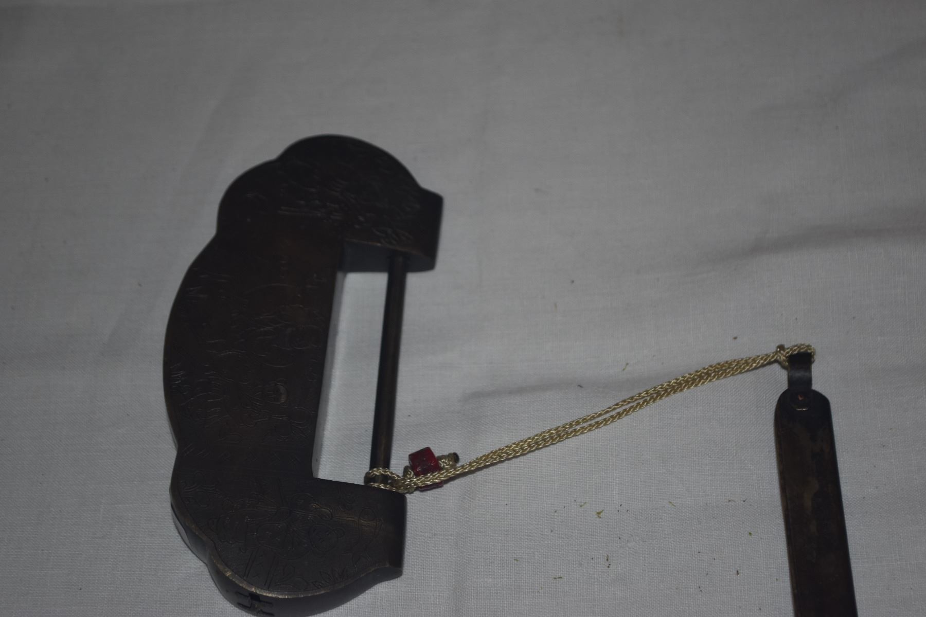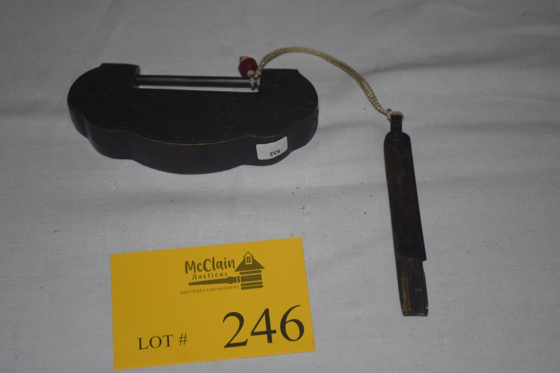 LARGE CHINESE BRASS CABINET LOCK & KEY (5 3/4" OUTSIDE & 3" INSIDE) (DOES NOT INCLUDE STAND)