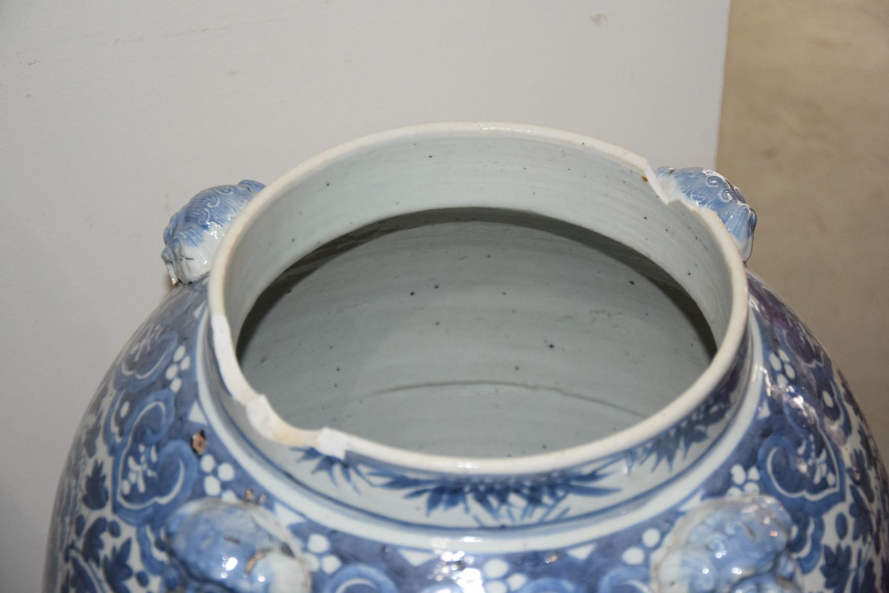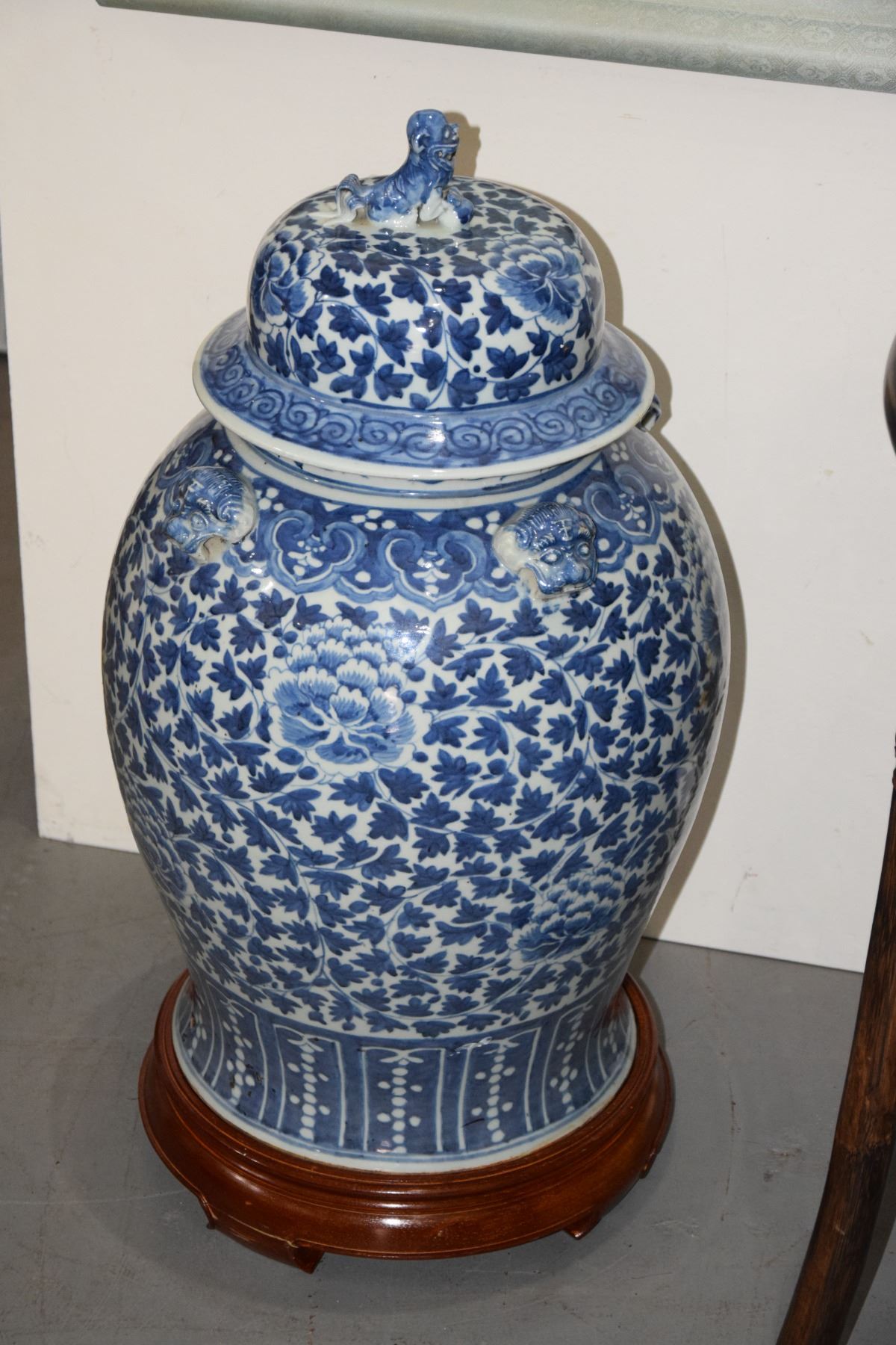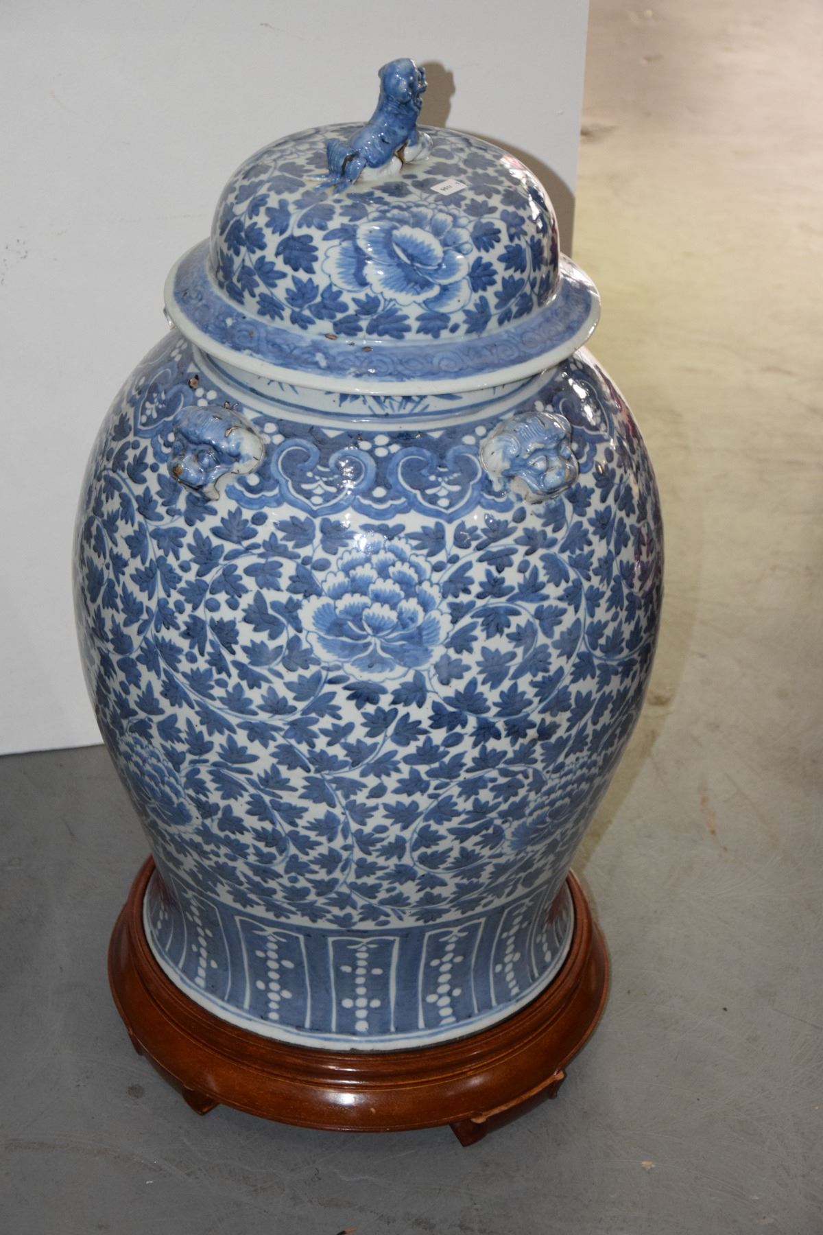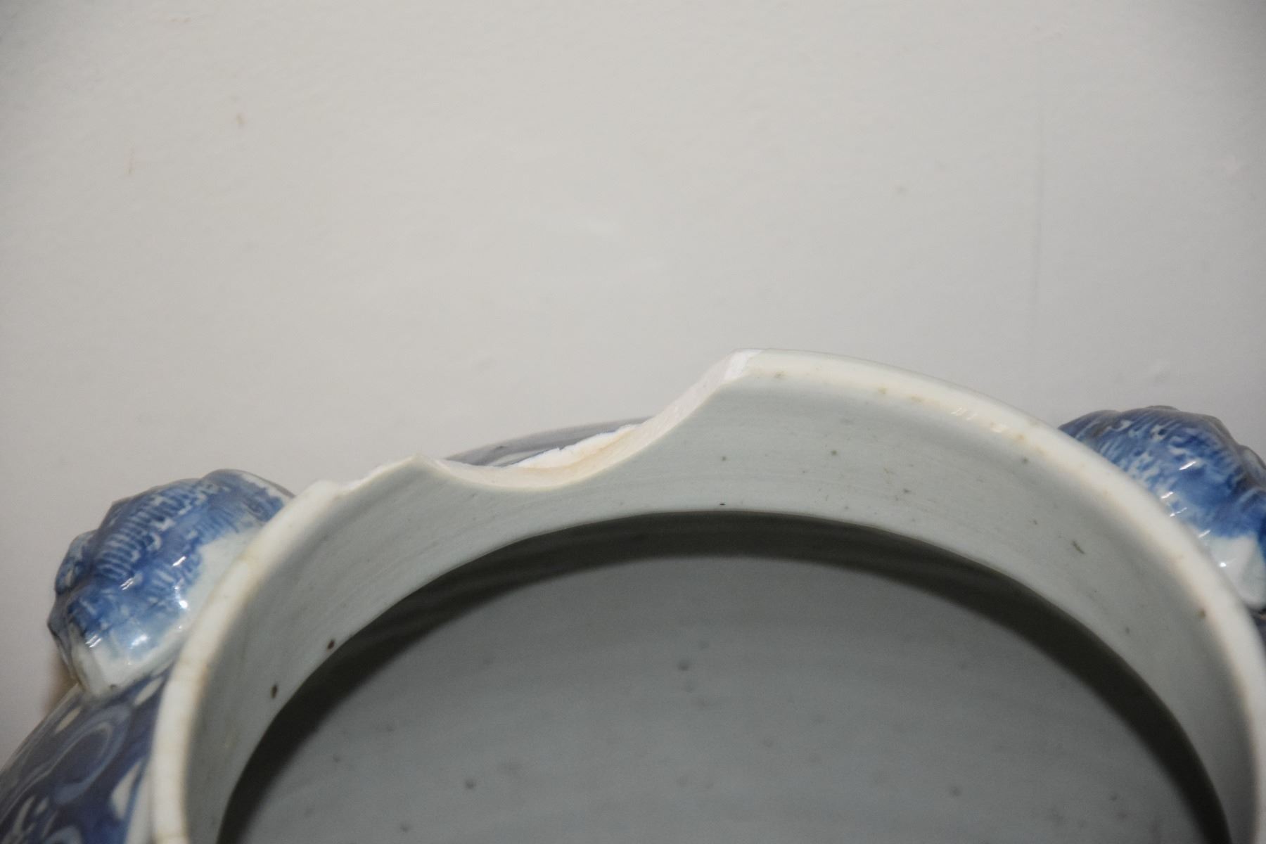 LARGE COVERED BLUE & WHITE JARS WITH STANDS (PAIR) (DAMAGED/CHIPS)