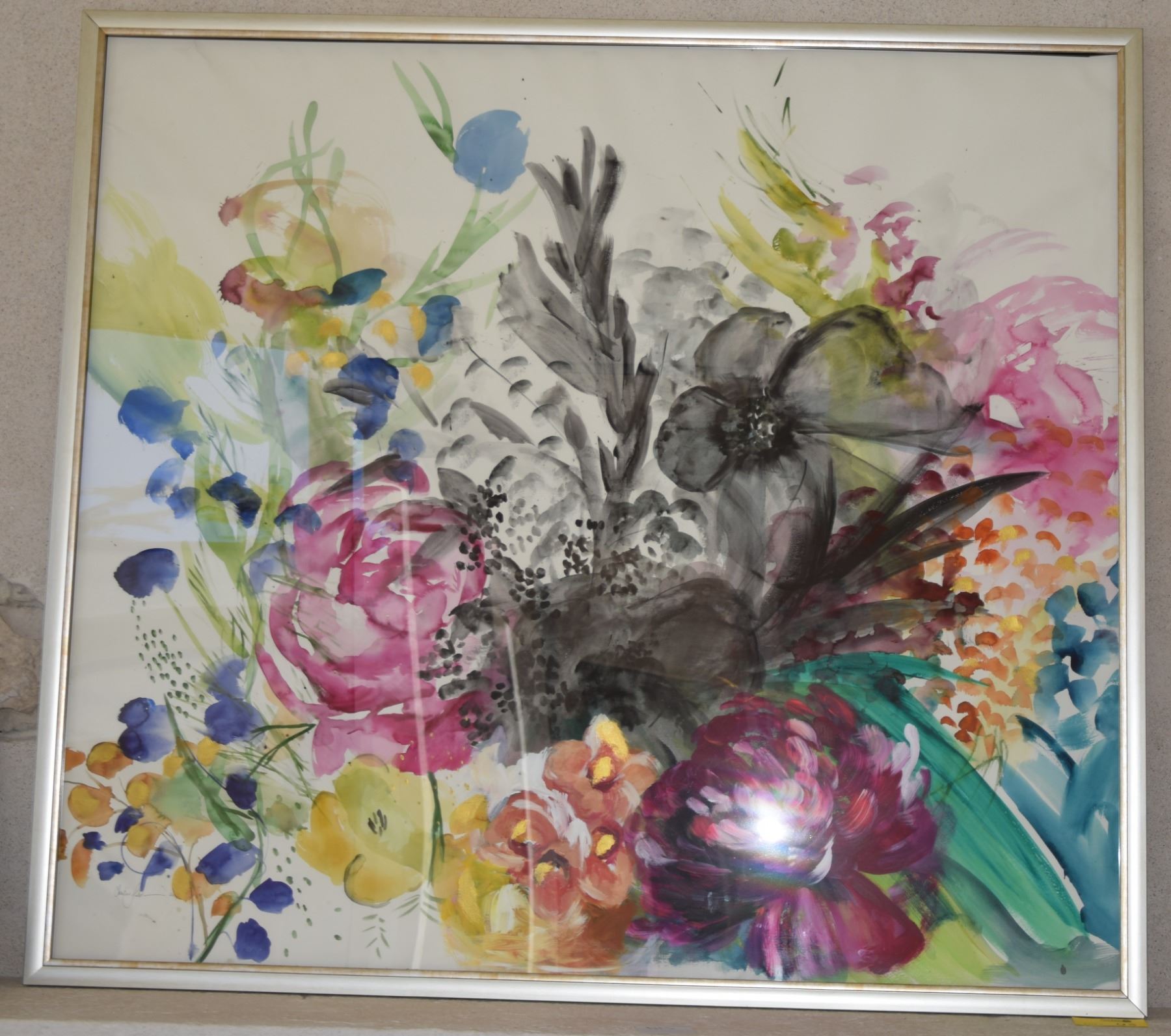 LARGE FRAMED MIXED MEDIA, "FLORAL"; SIGNED (58" W X 63 1/2" H)