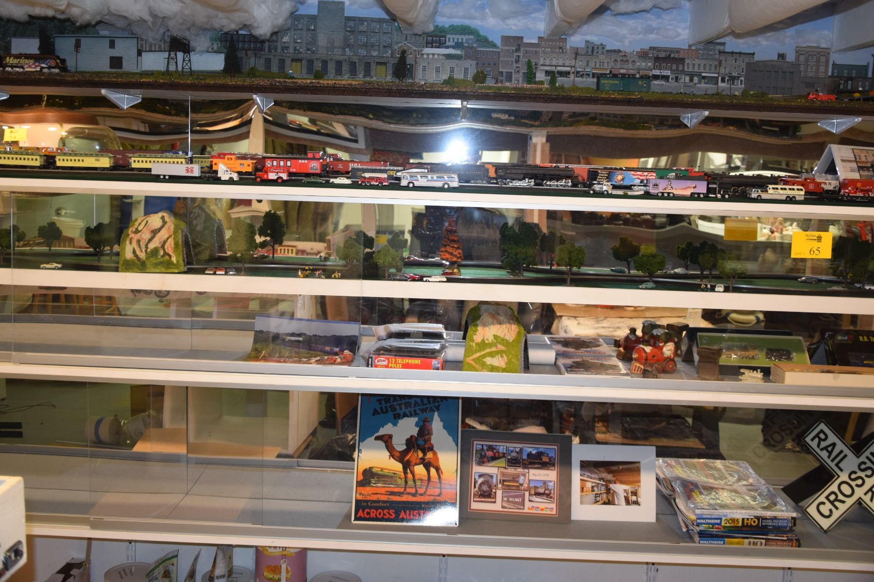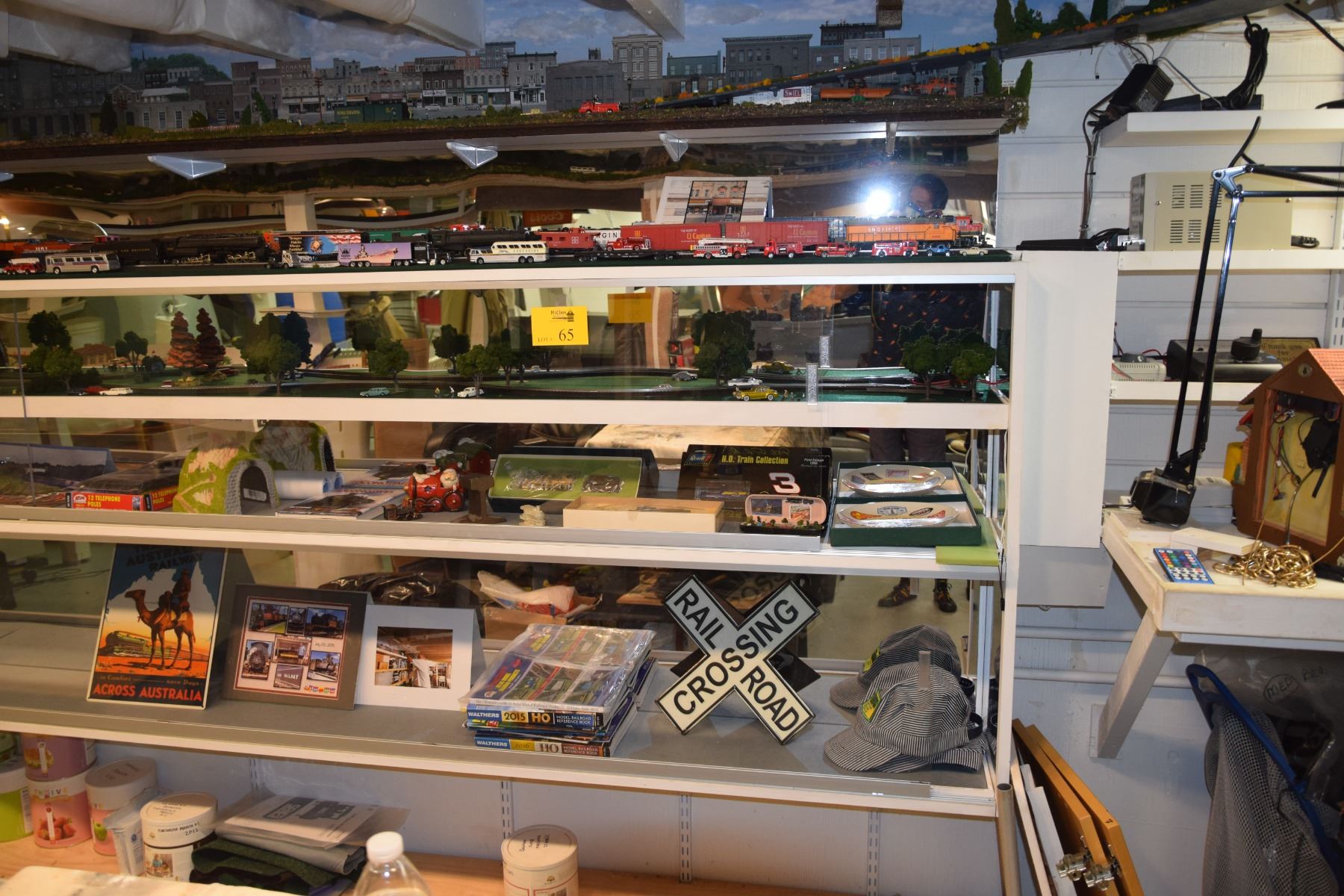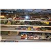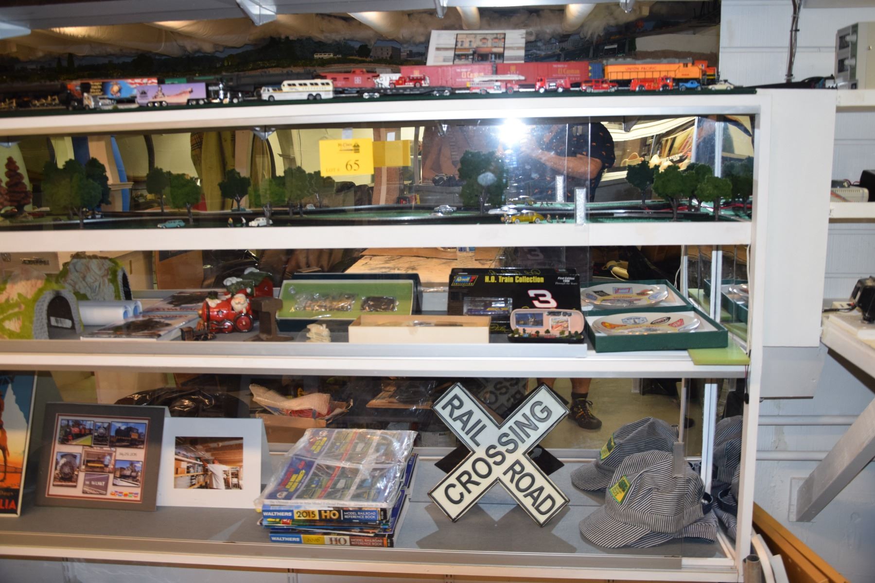 LARGE LOT OF TRAIN SET & ACCESSORIES: CARS (64) SCALE (40) LOCOMOTIVES (4), TREES, CARS, TRUCK, HATS, CROSSING SIGN, ETC.