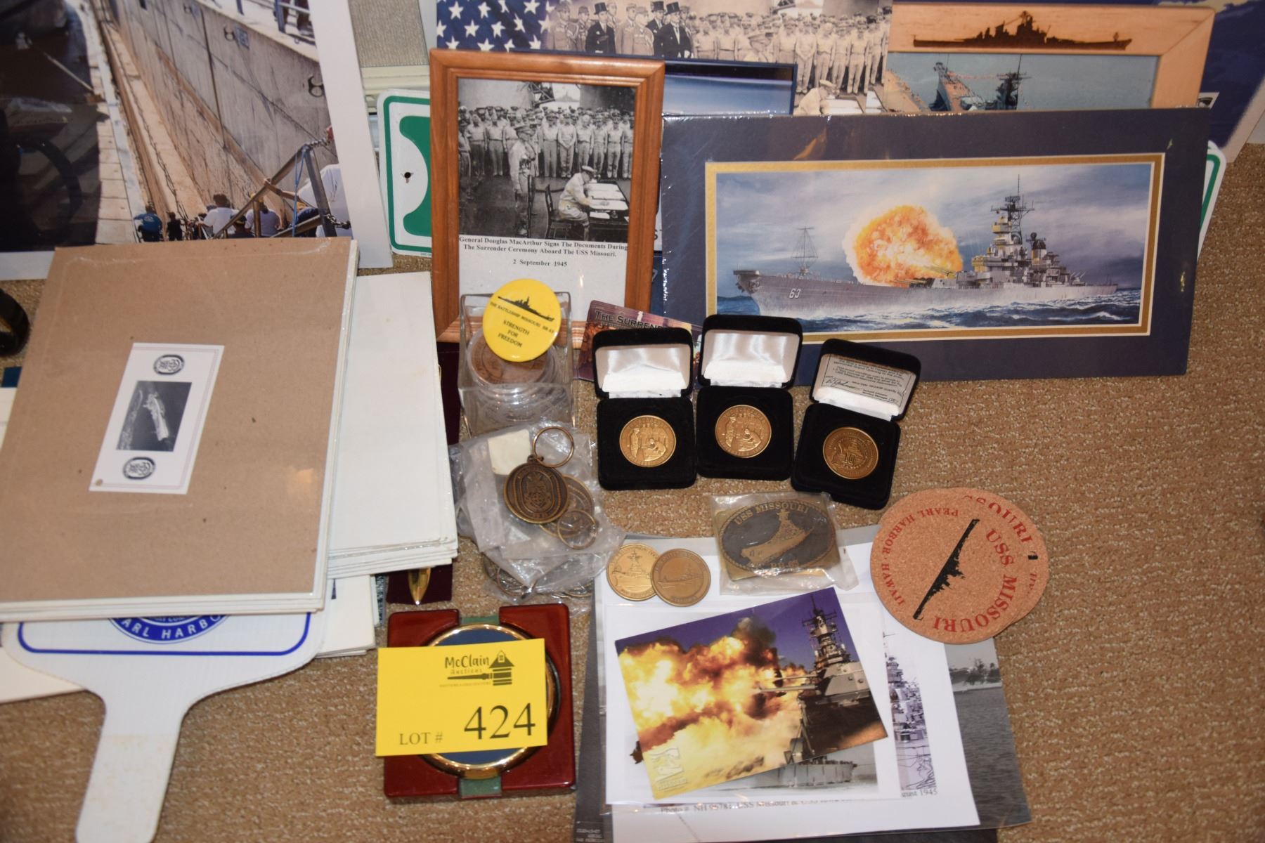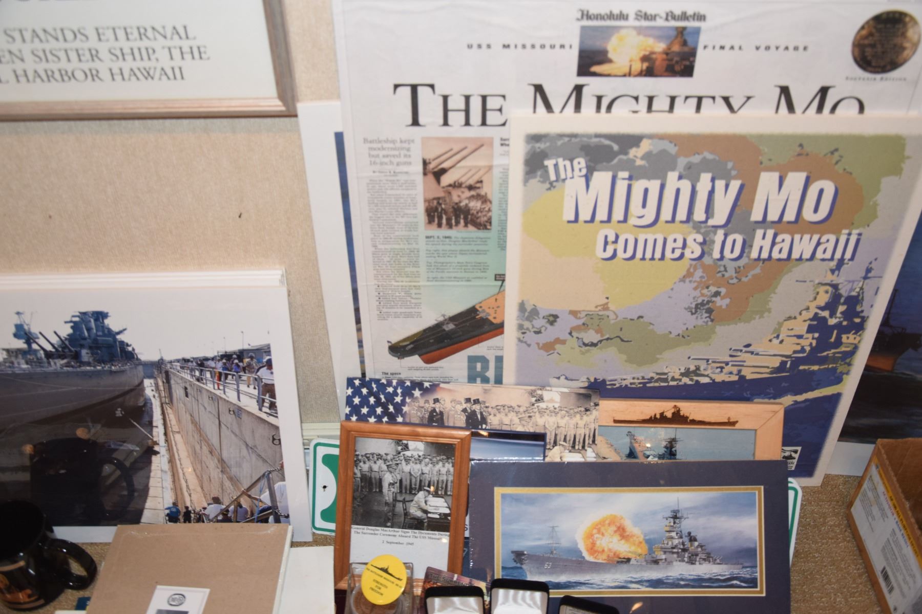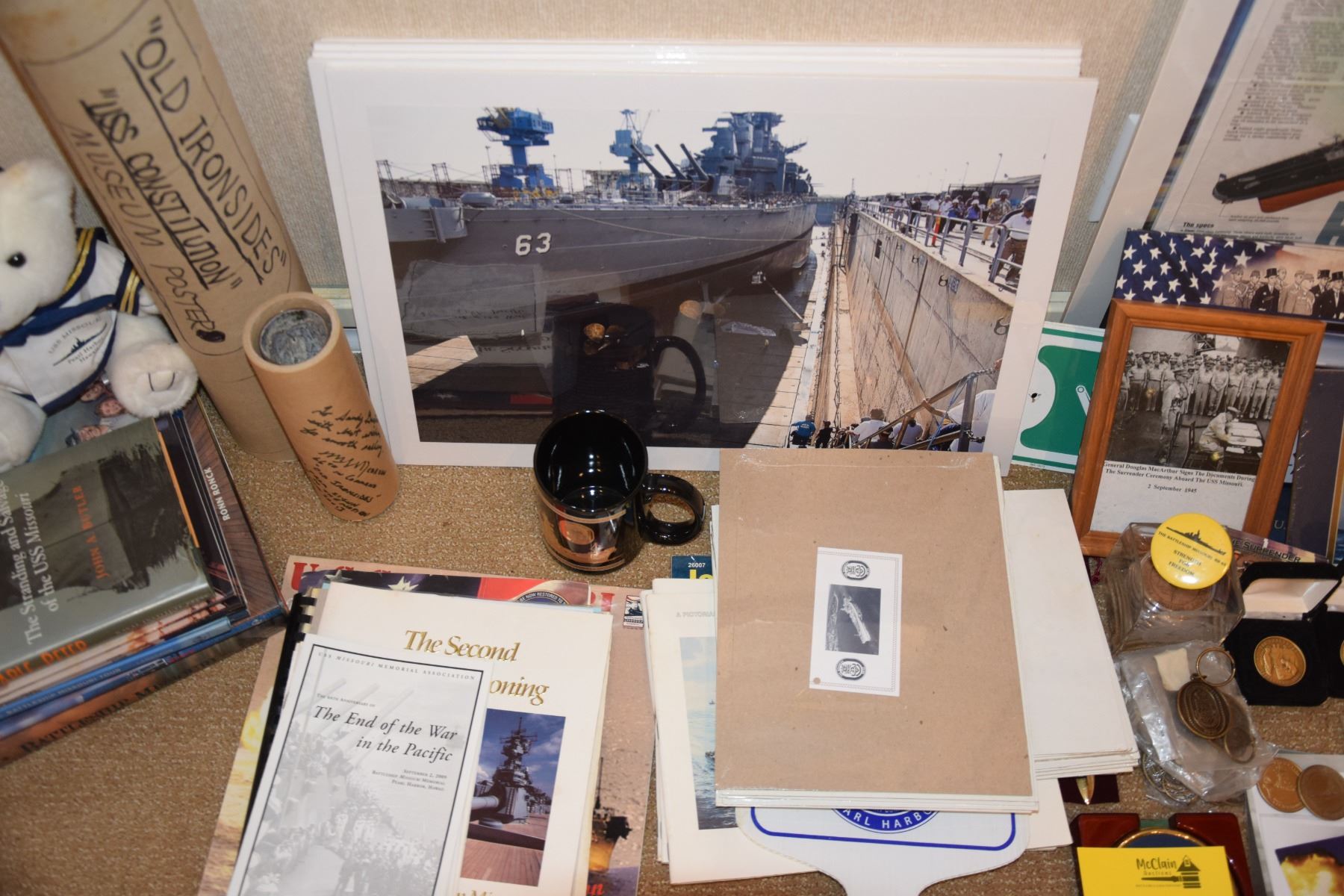 LARGE MIXED LOT: MIGHTY MO COLLECTIBLES, COASTERS, BOOKS, KEY CHAINS, PICTURES, BELT BUCKLE, POSTERS, 21 GUN SALUTE (SHELL) CUP, MEDALLIONS, ETC.