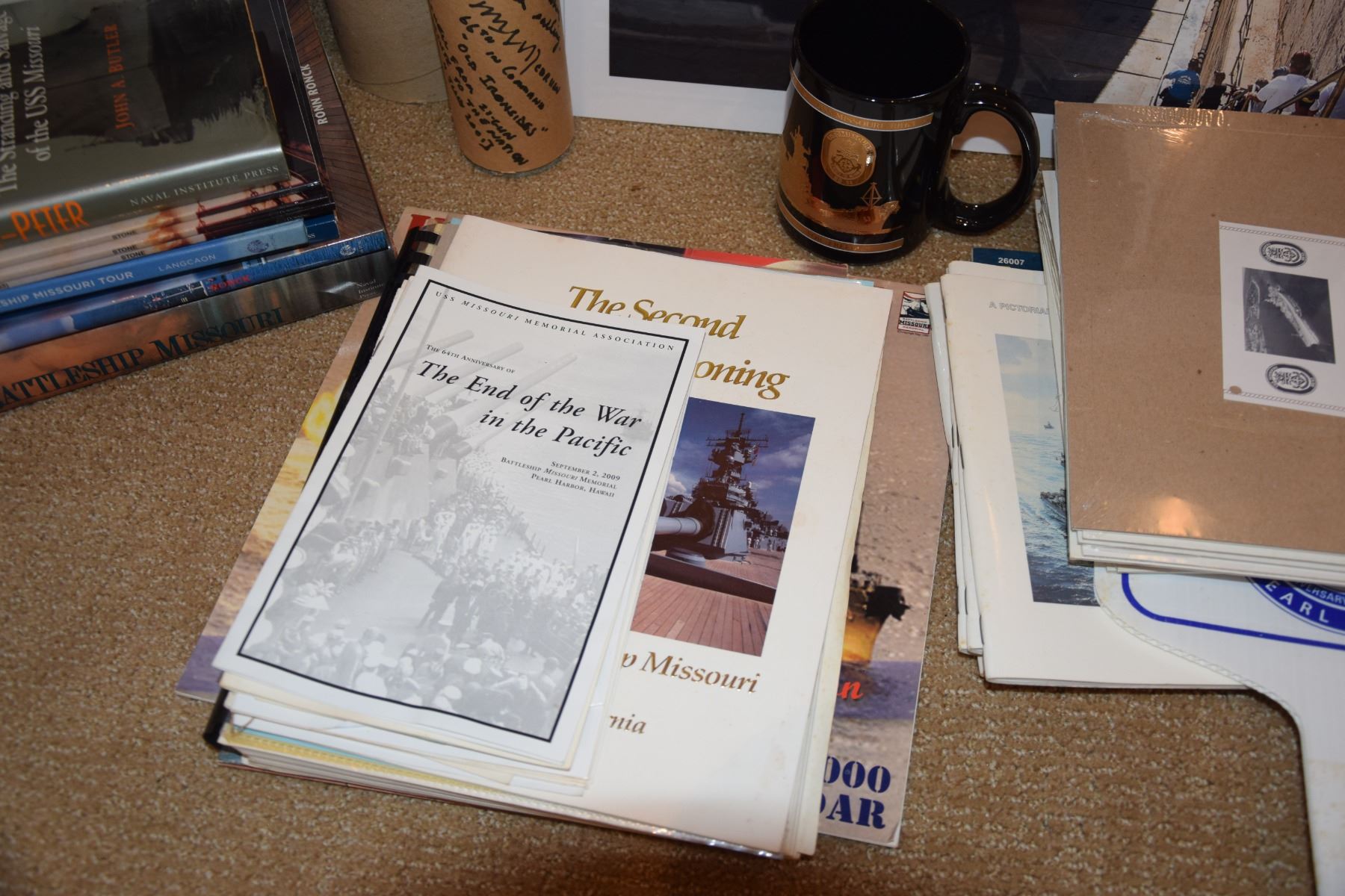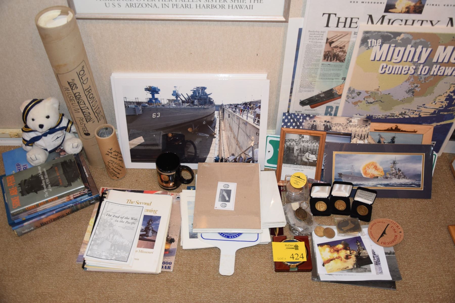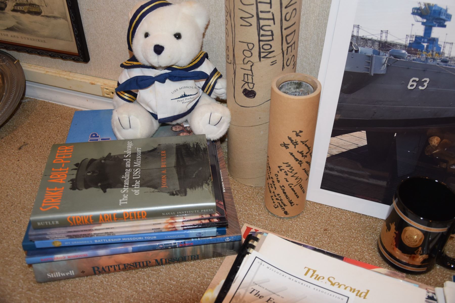 LARGE MIXED LOT: MIGHTY MO COLLECTIBLES, COASTERS, BOOKS, KEY CHAINS, PICTURES, BELT BUCKLE, POSTERS, 21 GUN SALUTE (SHELL) CUP, MEDALLIONS, ETC.