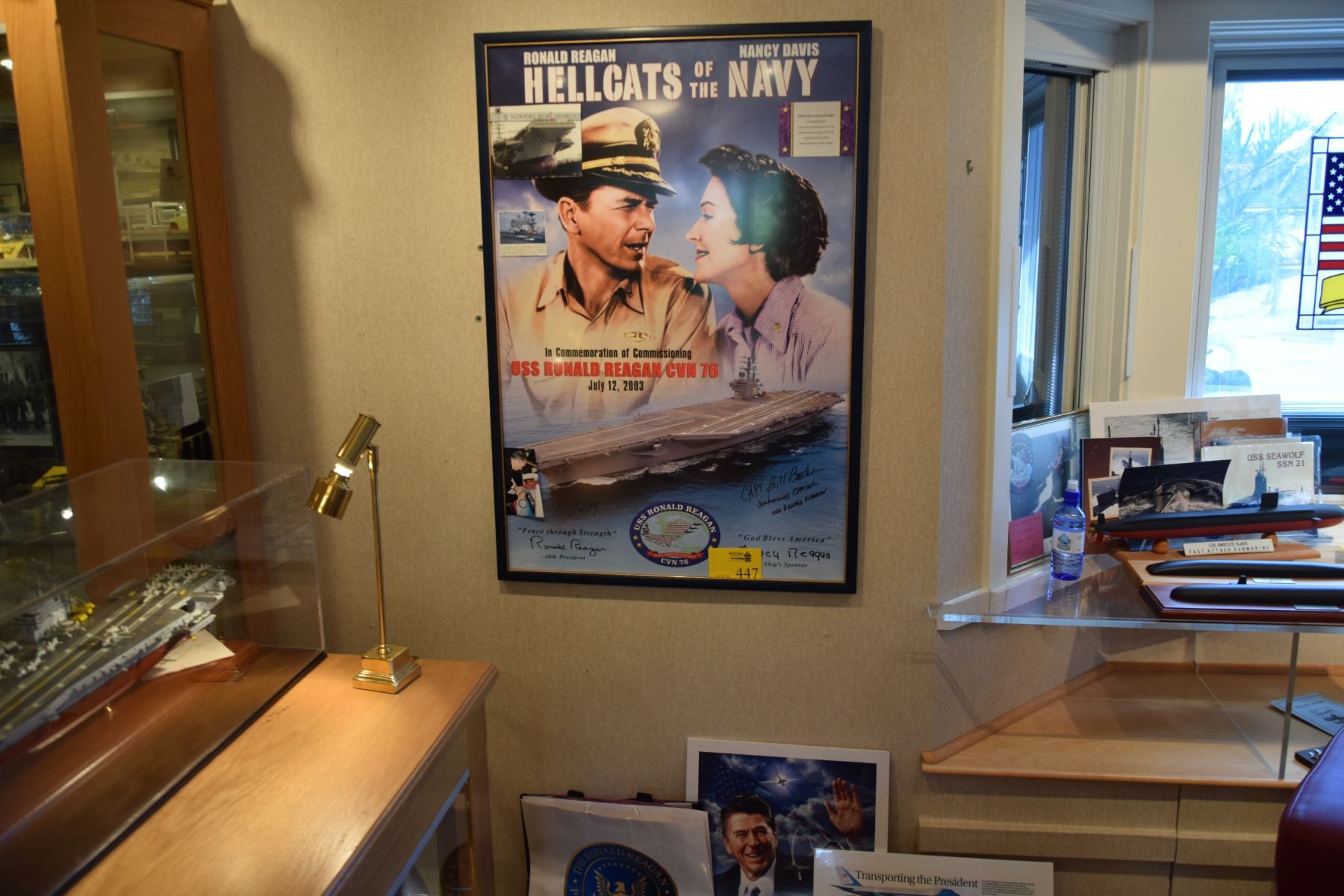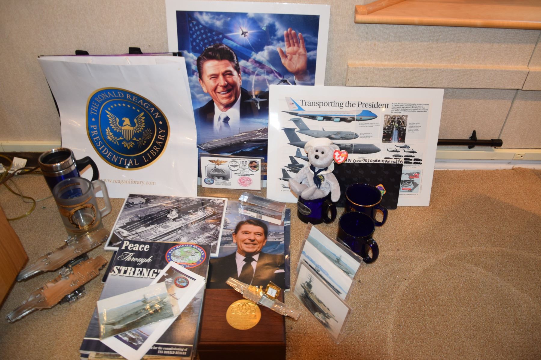 LARGE MIXED LOT: RONALD REGAN CUPS, POSTER, SHIP MODEL W/LIGHTER, SHIP W/CLOCK, MUGS, BOX, BACK, BAN