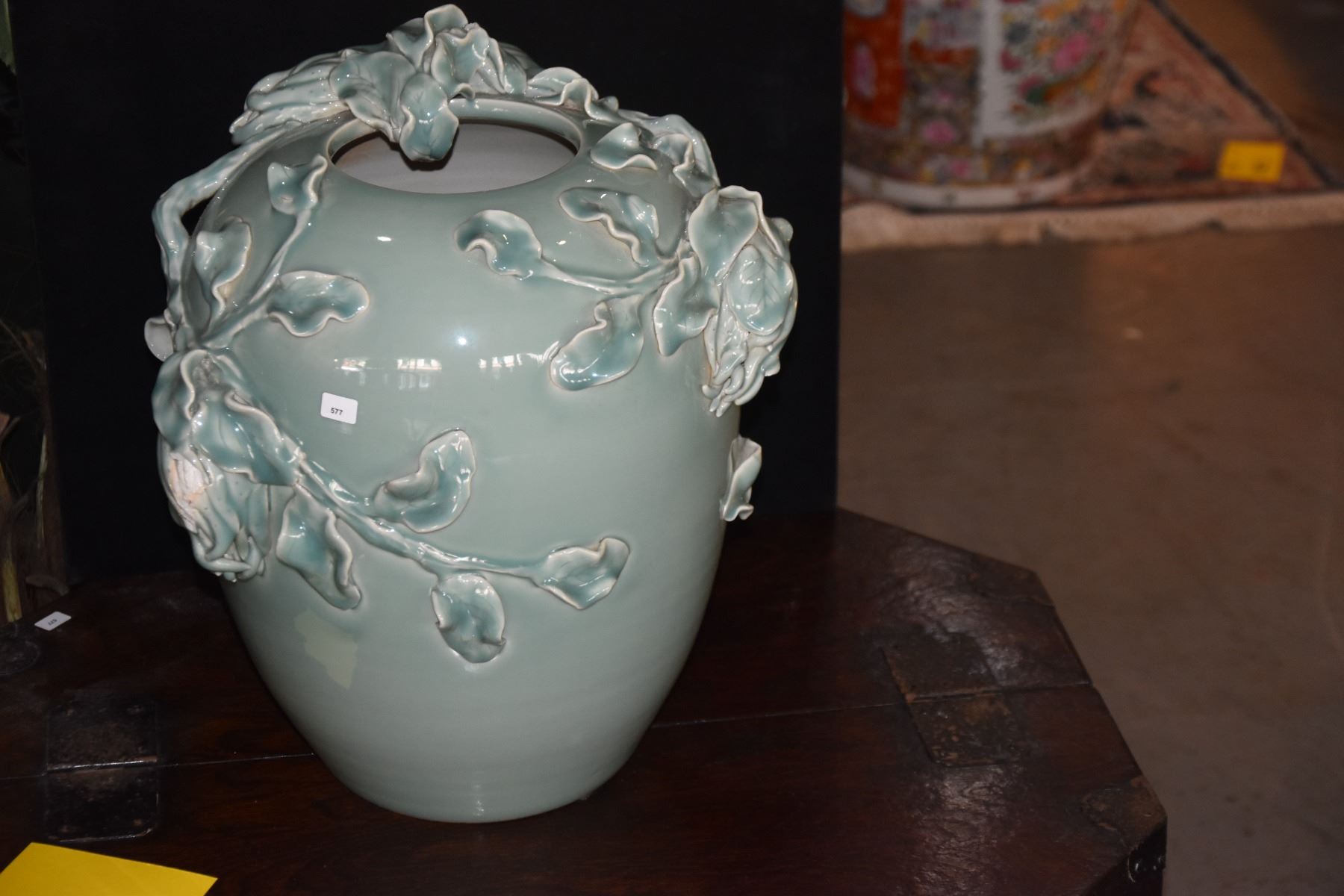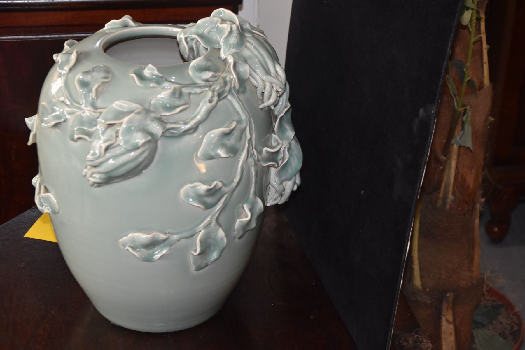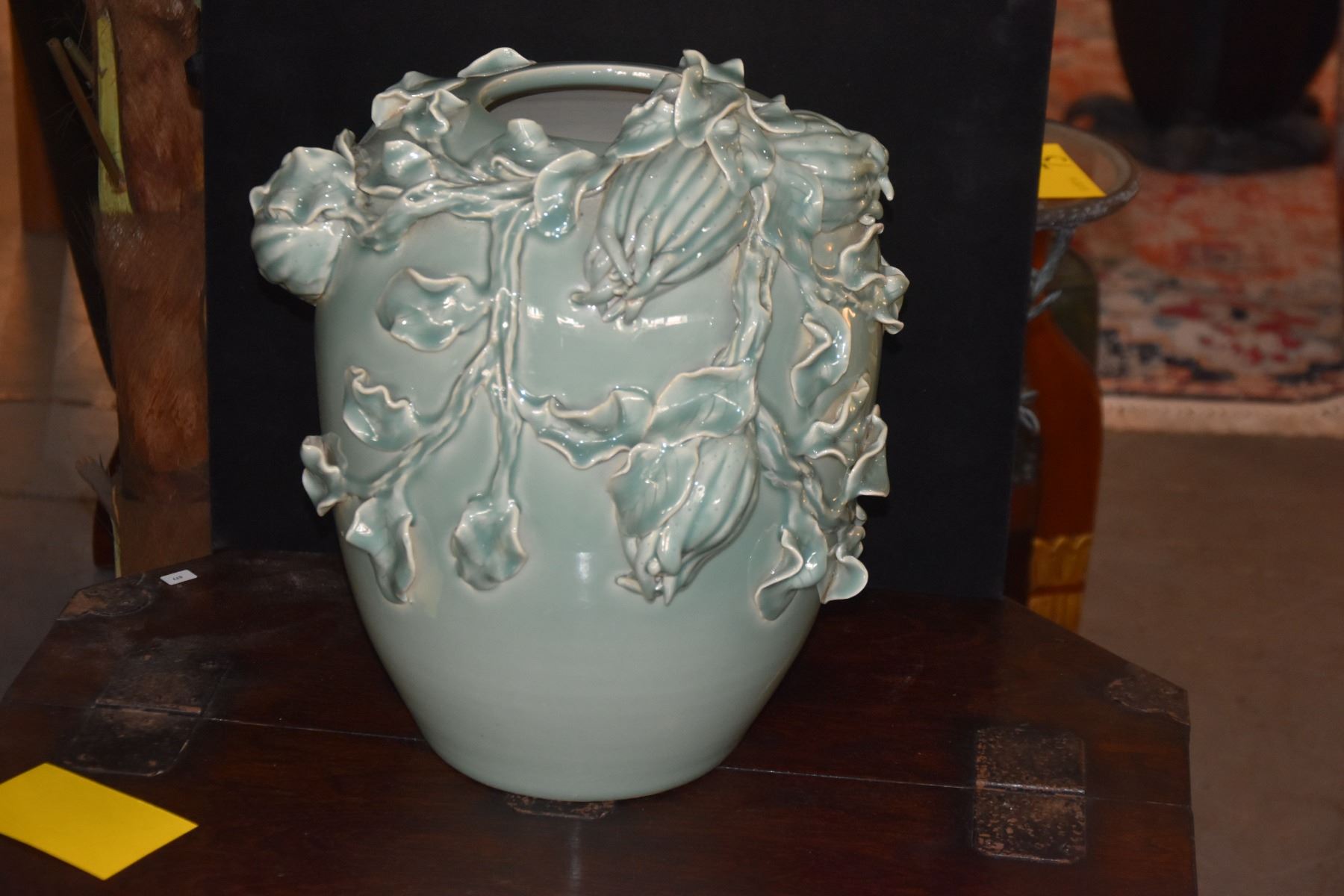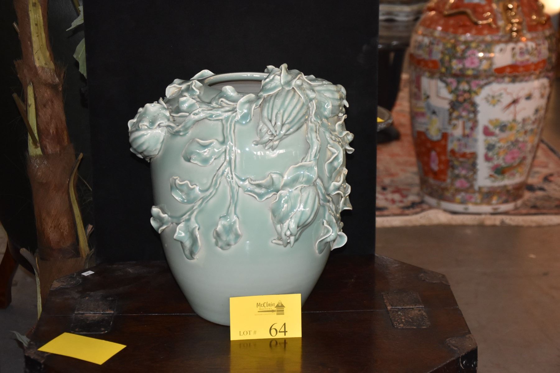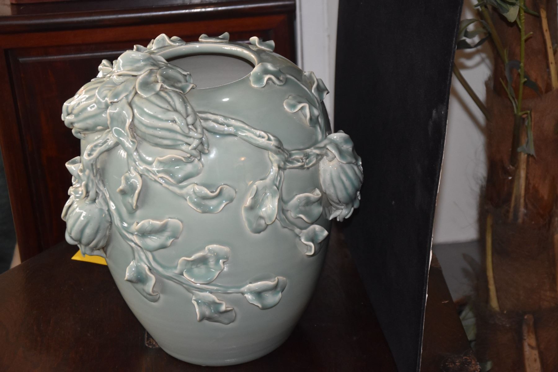 LARGE PORCELAIN CELADON VASE W/BUDDHA HAND FRUIT MOTIF IN HIGH RELIEF (16 1/2" X 30")