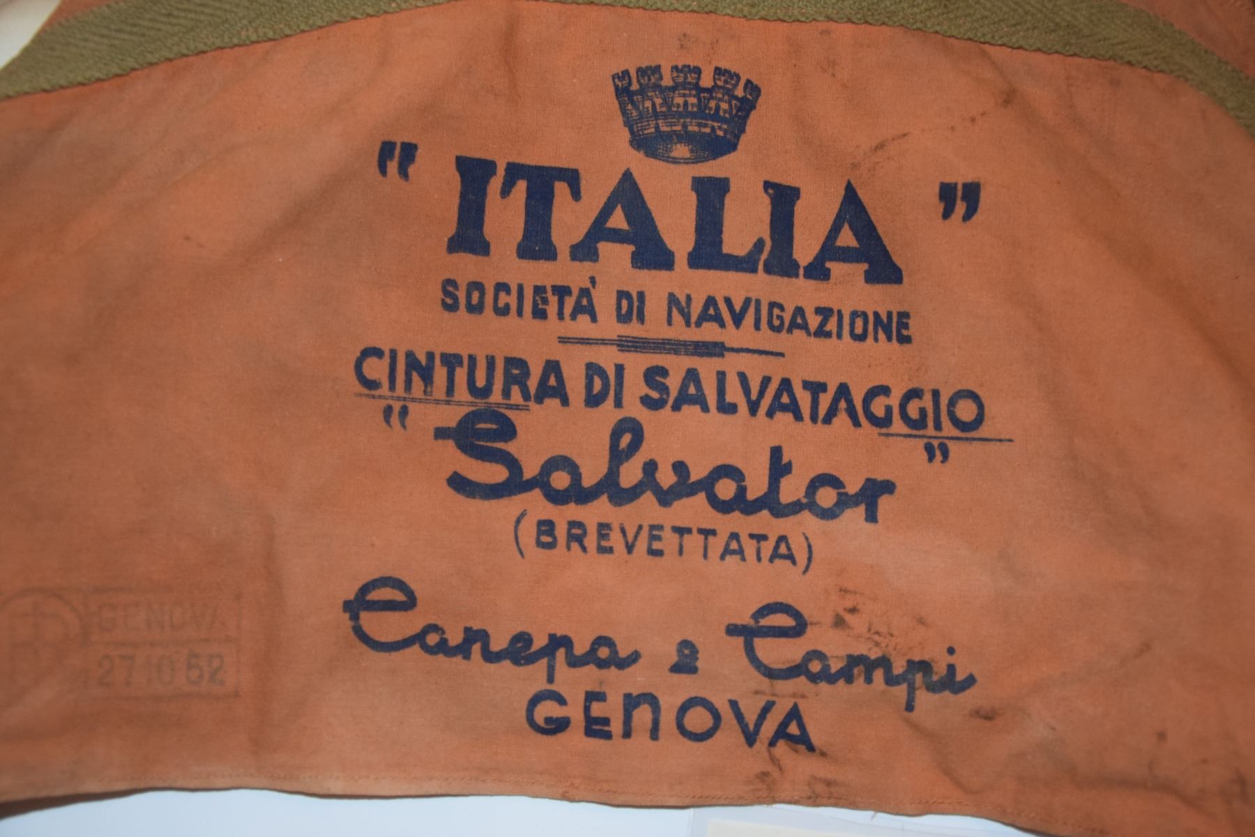 LIFE JACKET FROM "ITALIA-ANDREA DORIA" W/LETTER FROM MARION O'LEARY & FRAMED POST CARD (3 PCS)