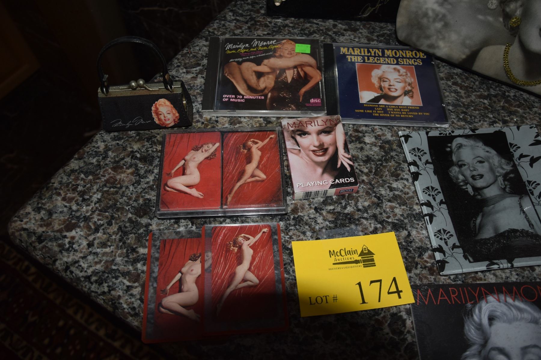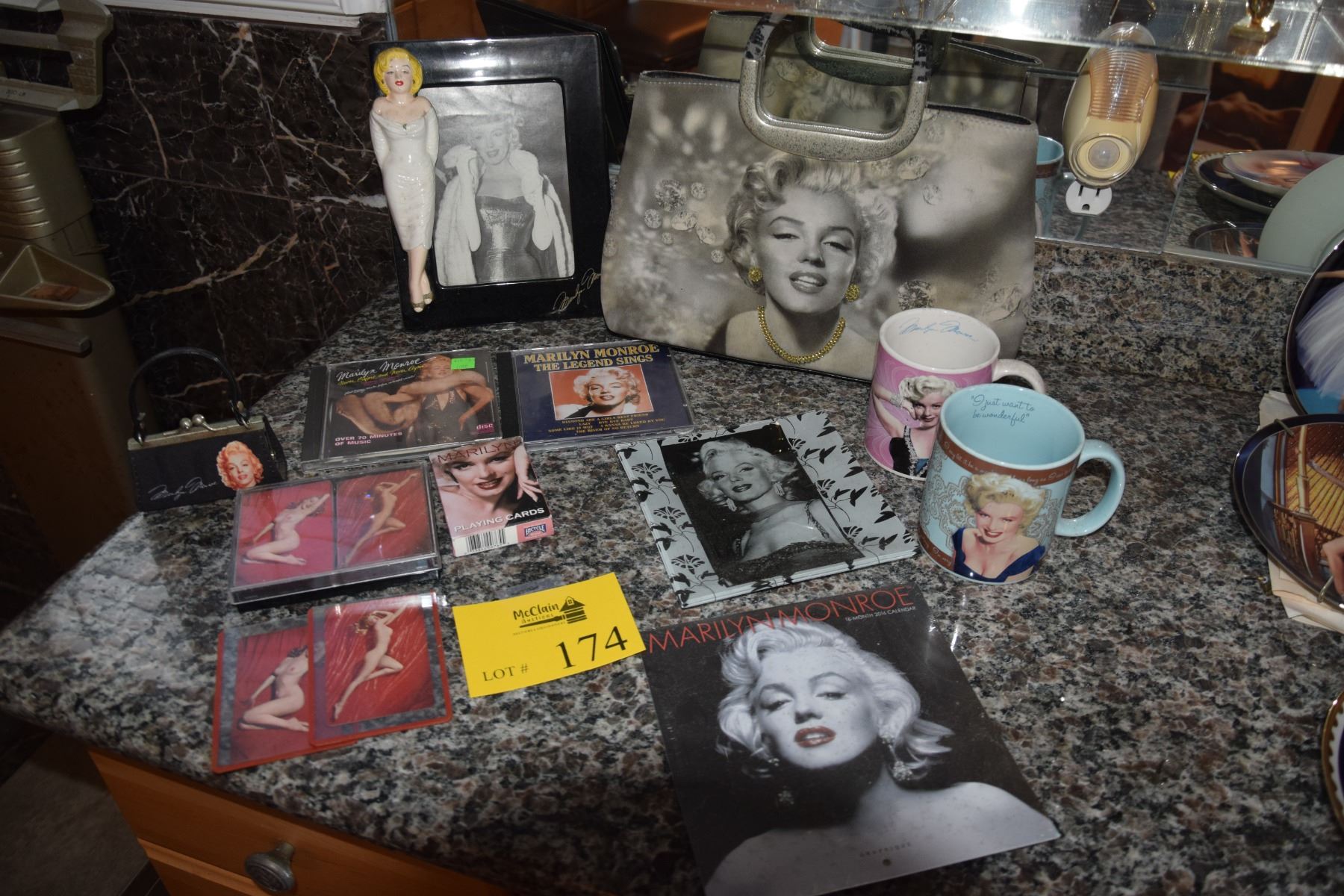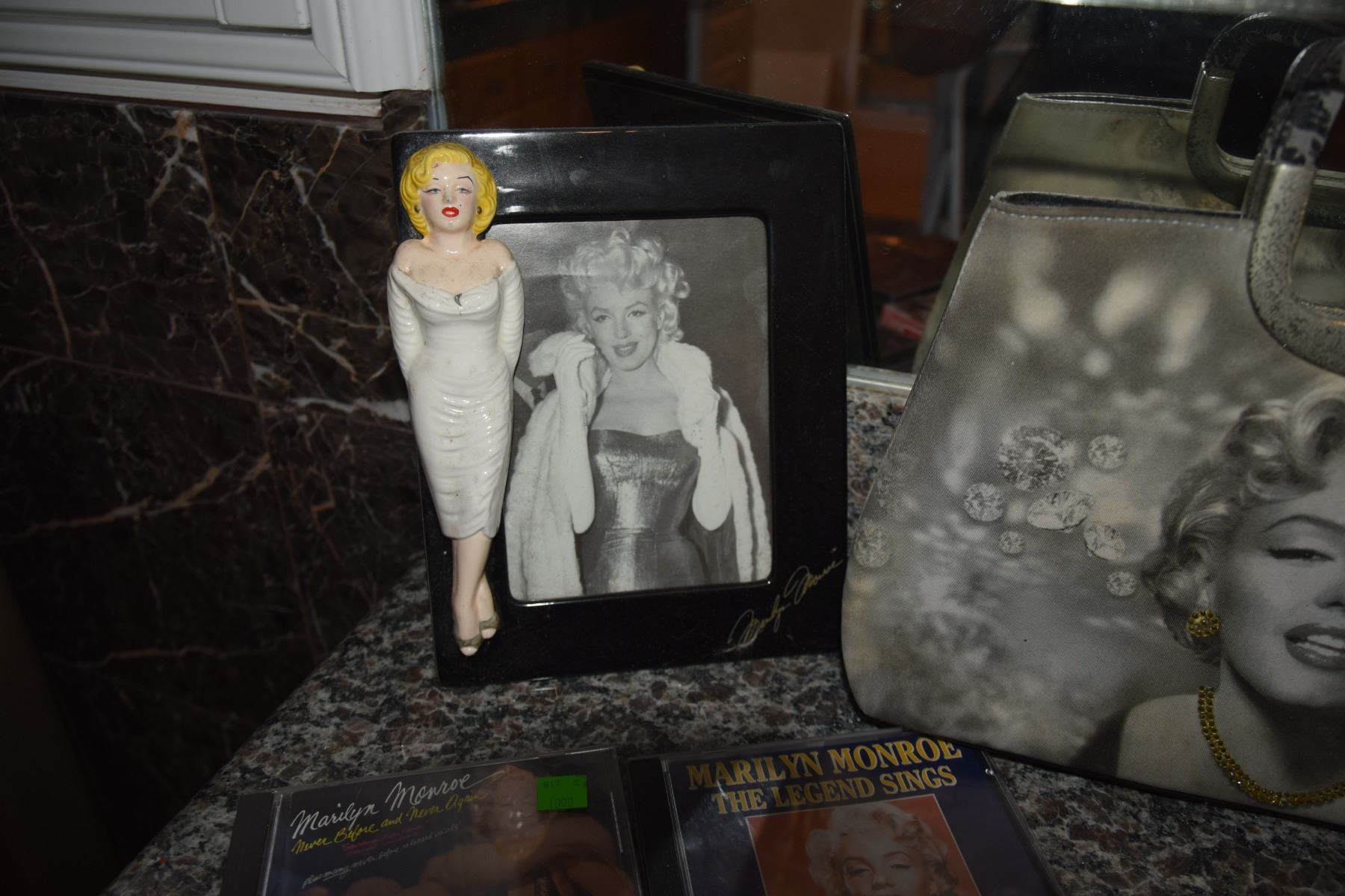 MARILYN MONROE COLLECTIBLES: HAND BAG, COIN PURSE, FRAMED PHOTO, PLAYING CARDS, MUGS, ASHTRAY, CD, C