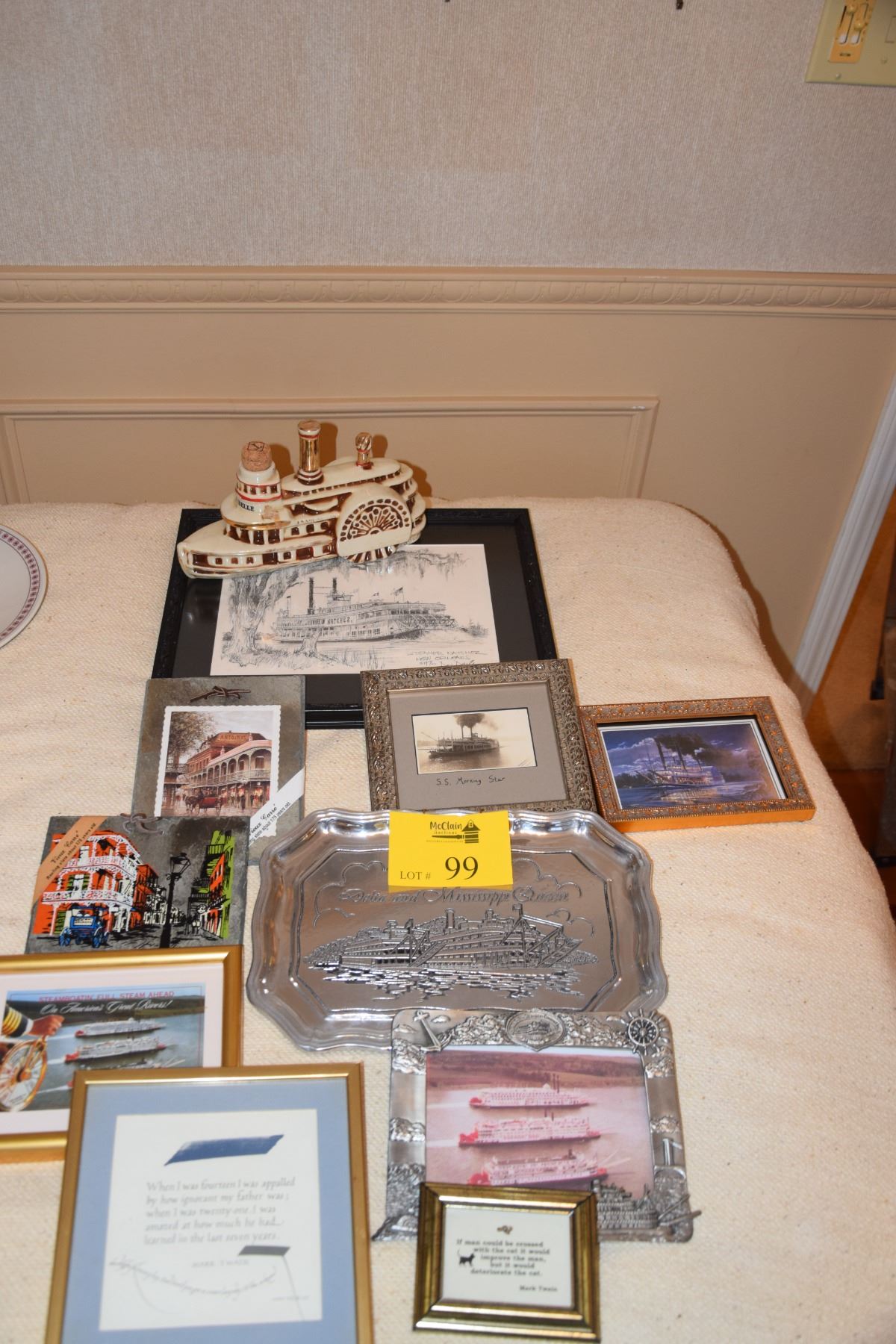 MARK TWAIN MEMORABILIA: LIQUER BOTTLE, PLAQUES, TRAY, FARMED ART (11 PCS)
