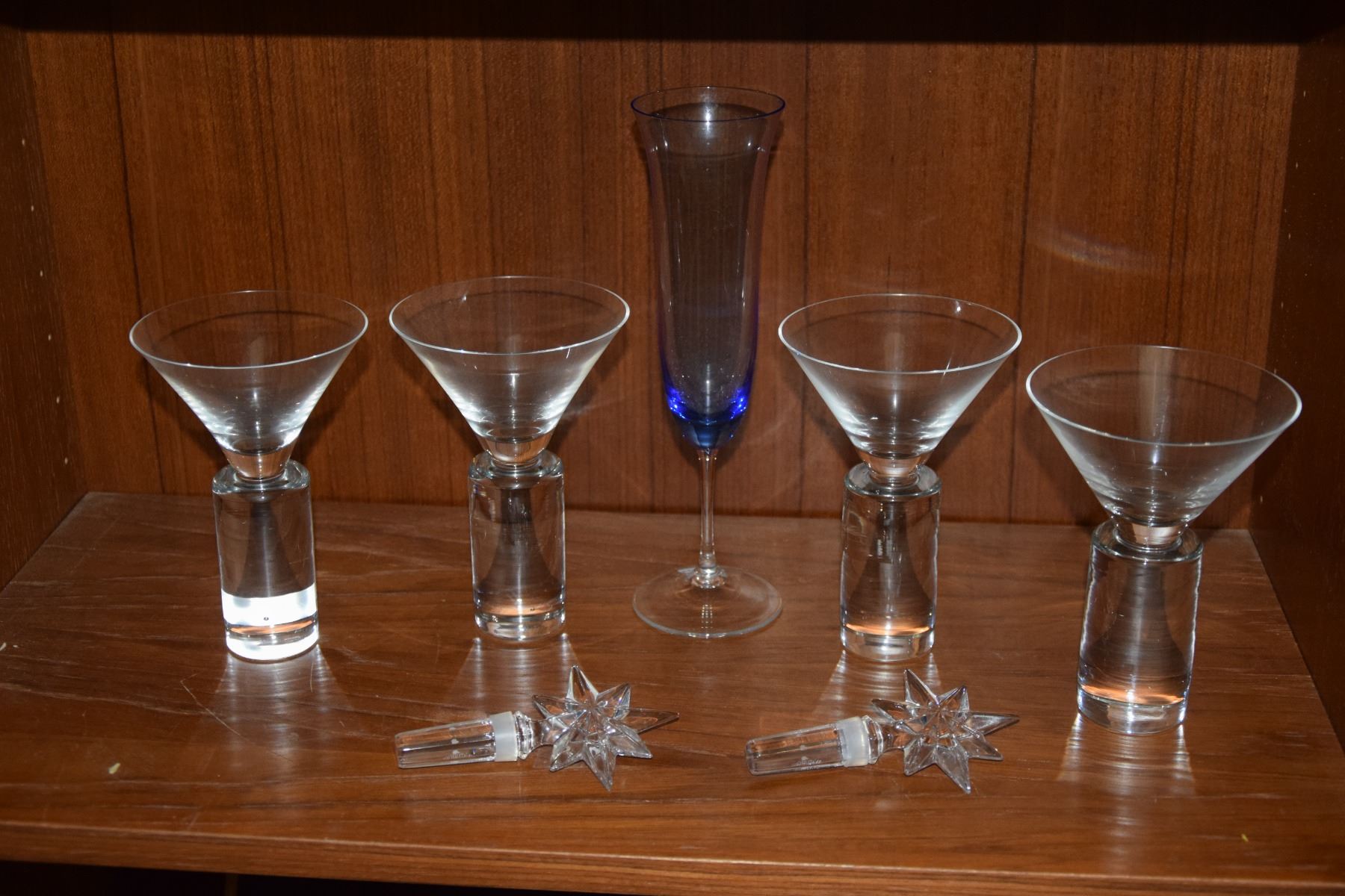 MARTINI GLASSES, BLUE CHAMPAGNE GLASS & WATERFORD STOPPERS (7 PCS)