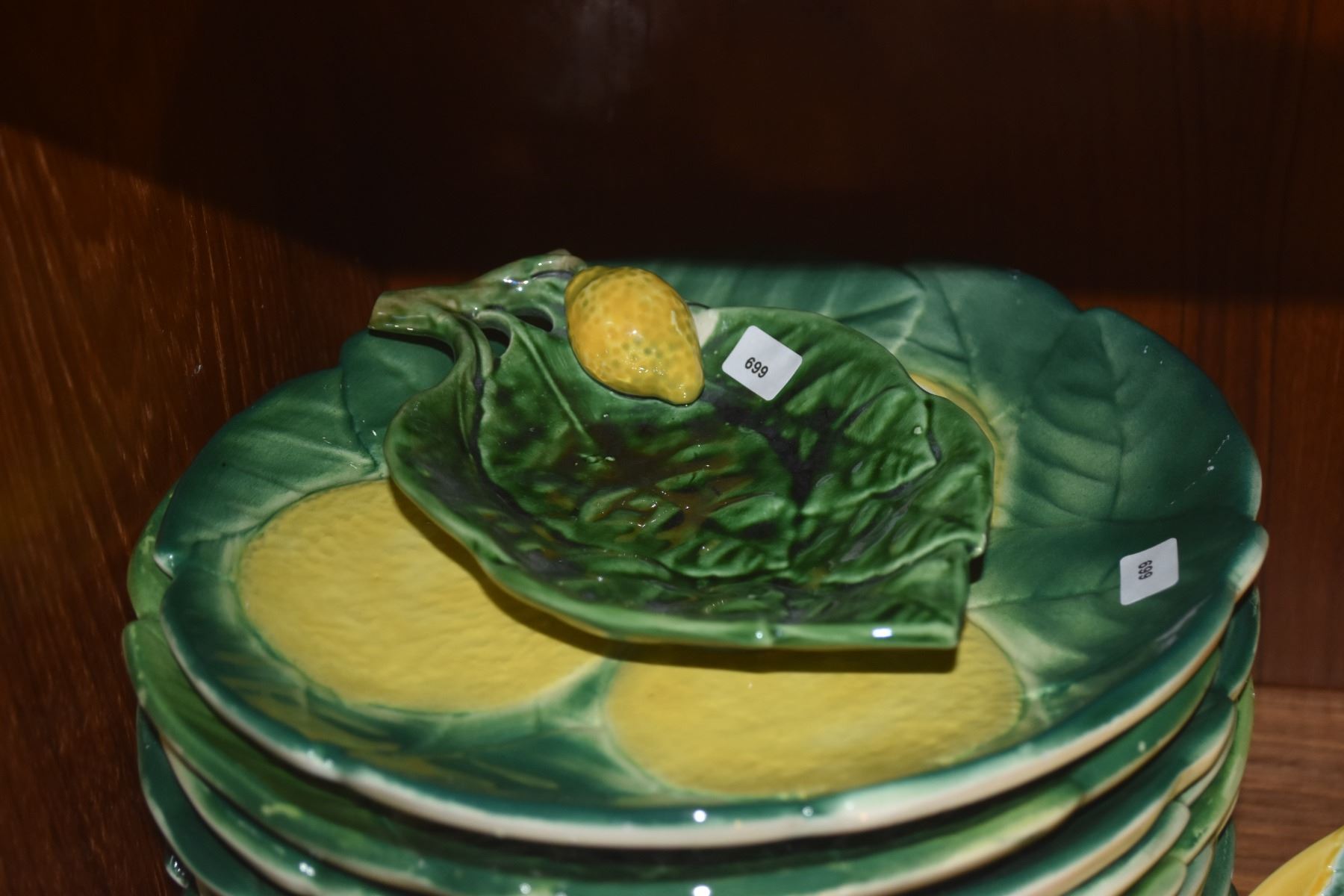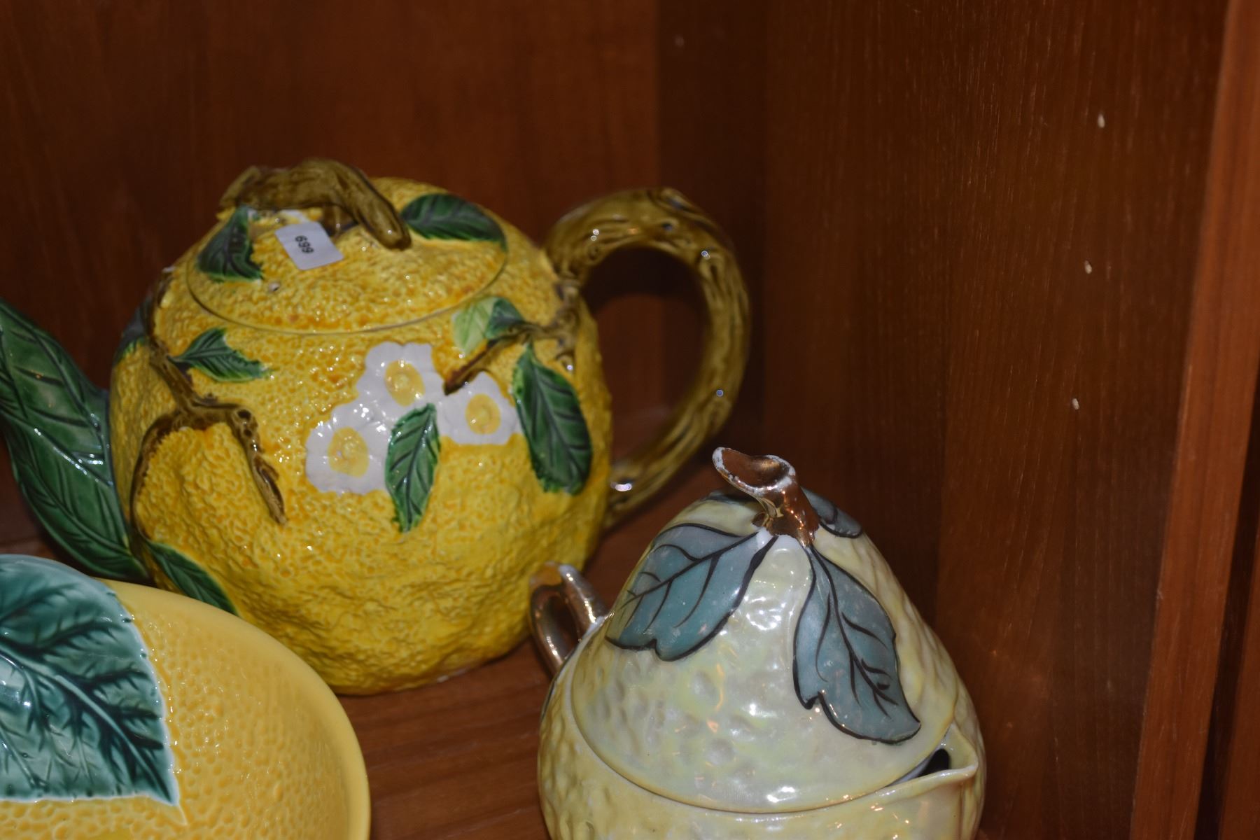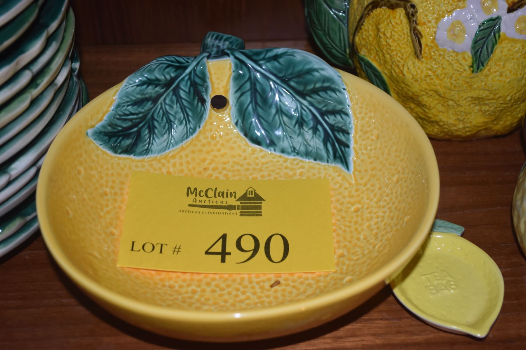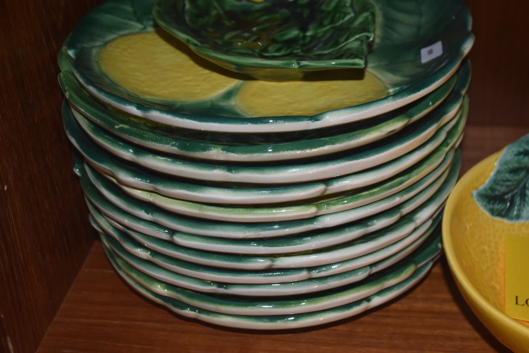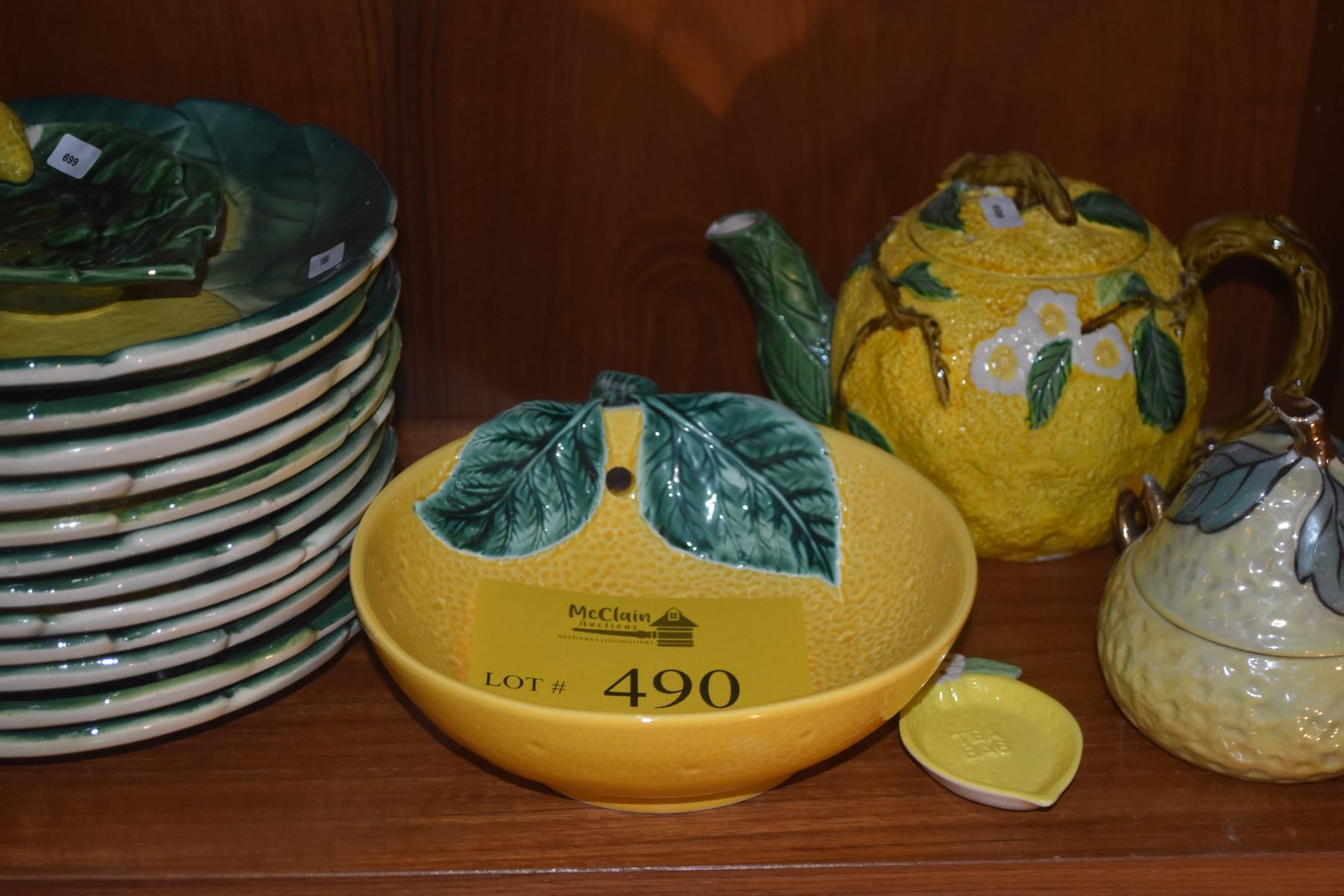 MID CENTURY MODERN ED LANGBEIN ORIGINALS HAND PAINTED MAJOLICA LEMON PLATES, LEMON TEAPOT, BOWL, SPOON REST & TEA BAG HOLDER (17 PCS)