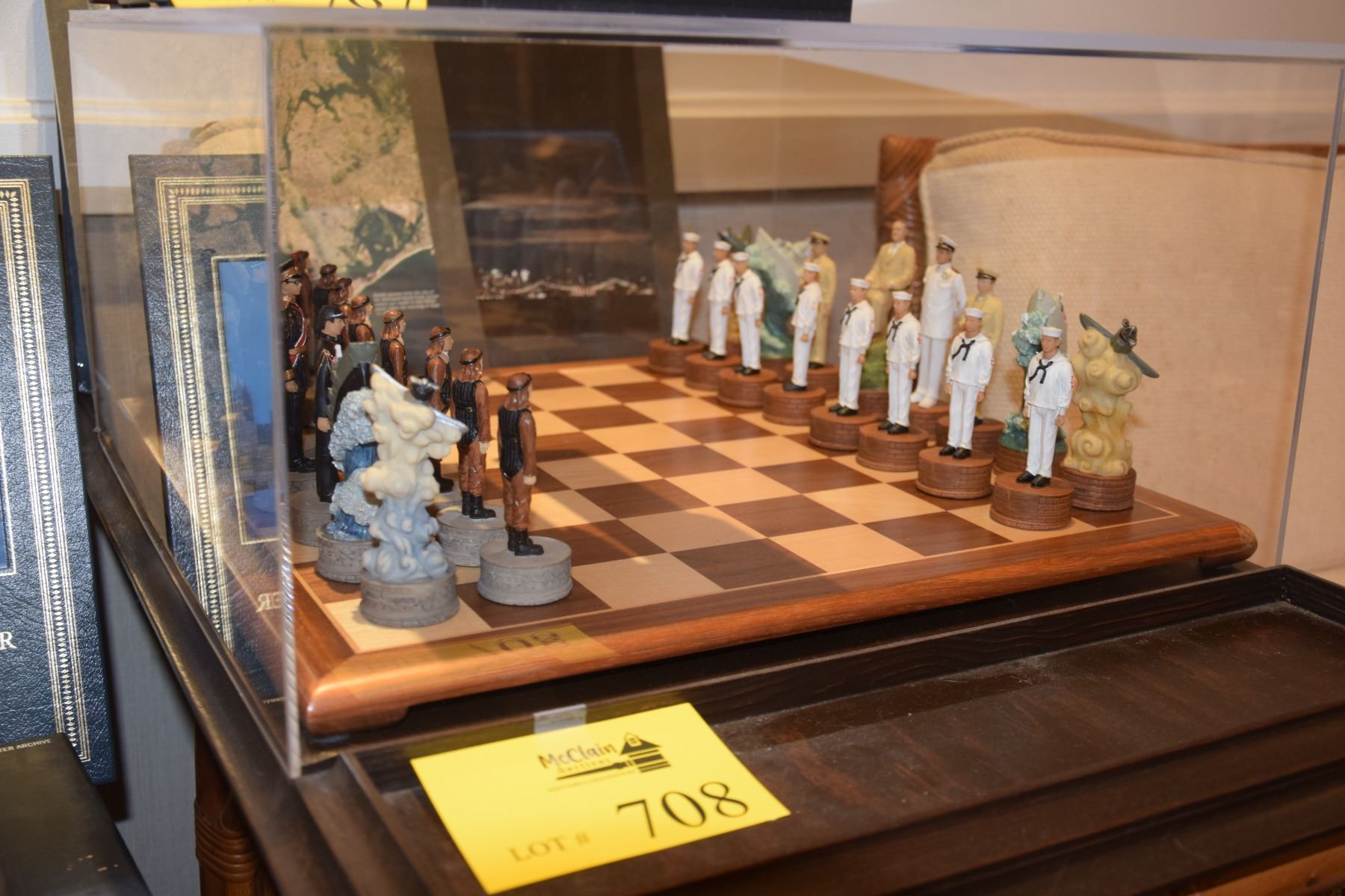 MILITARY MOTIF CHESS BOARD ON CUSTOM BASE W/PLEXIGLASS COVER