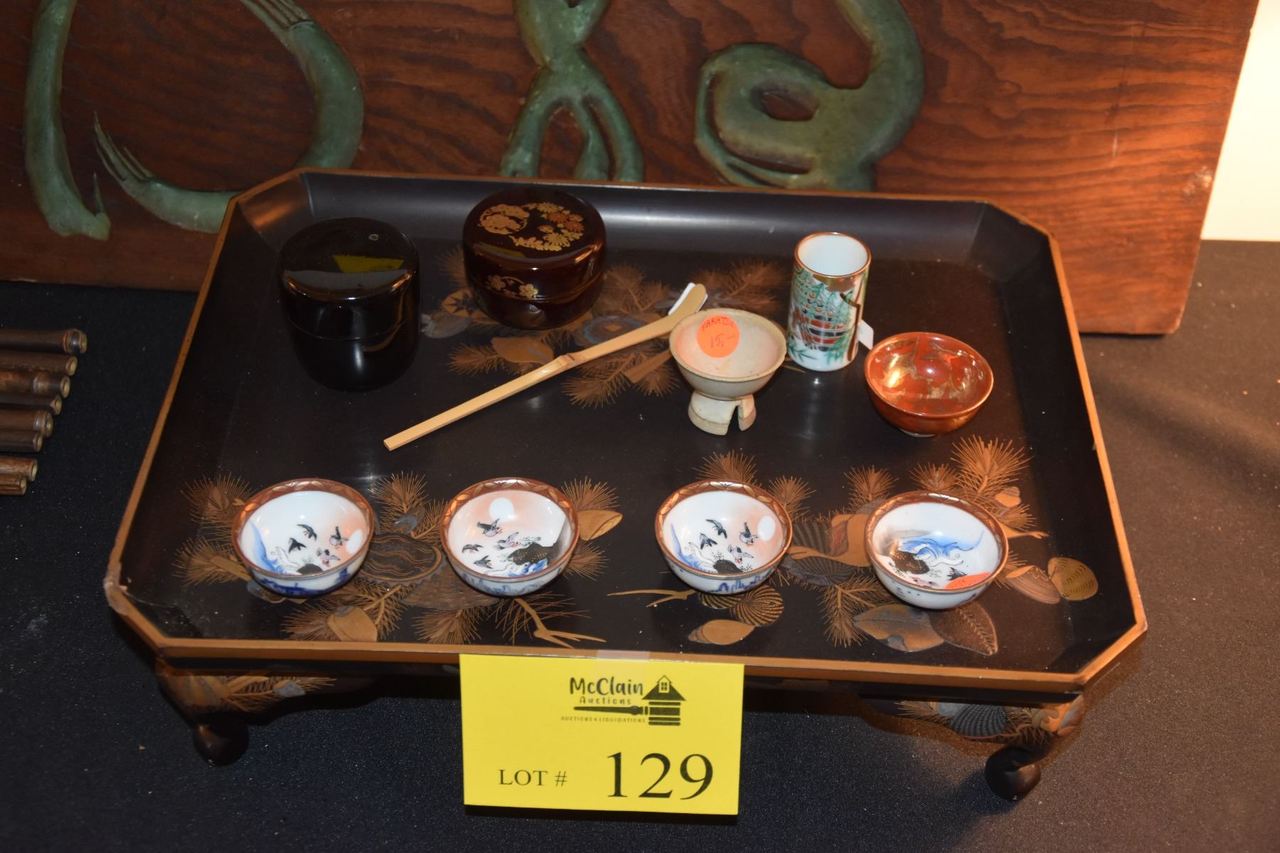 MIXED LACQUER & PORCELAIN LOT: INCENSE & TEA CONTAINERS, MAKI-E TRAY & SMALL PORCELAIN CUPS, TEA SCOOP & SAKE CUPS (11 PCS)