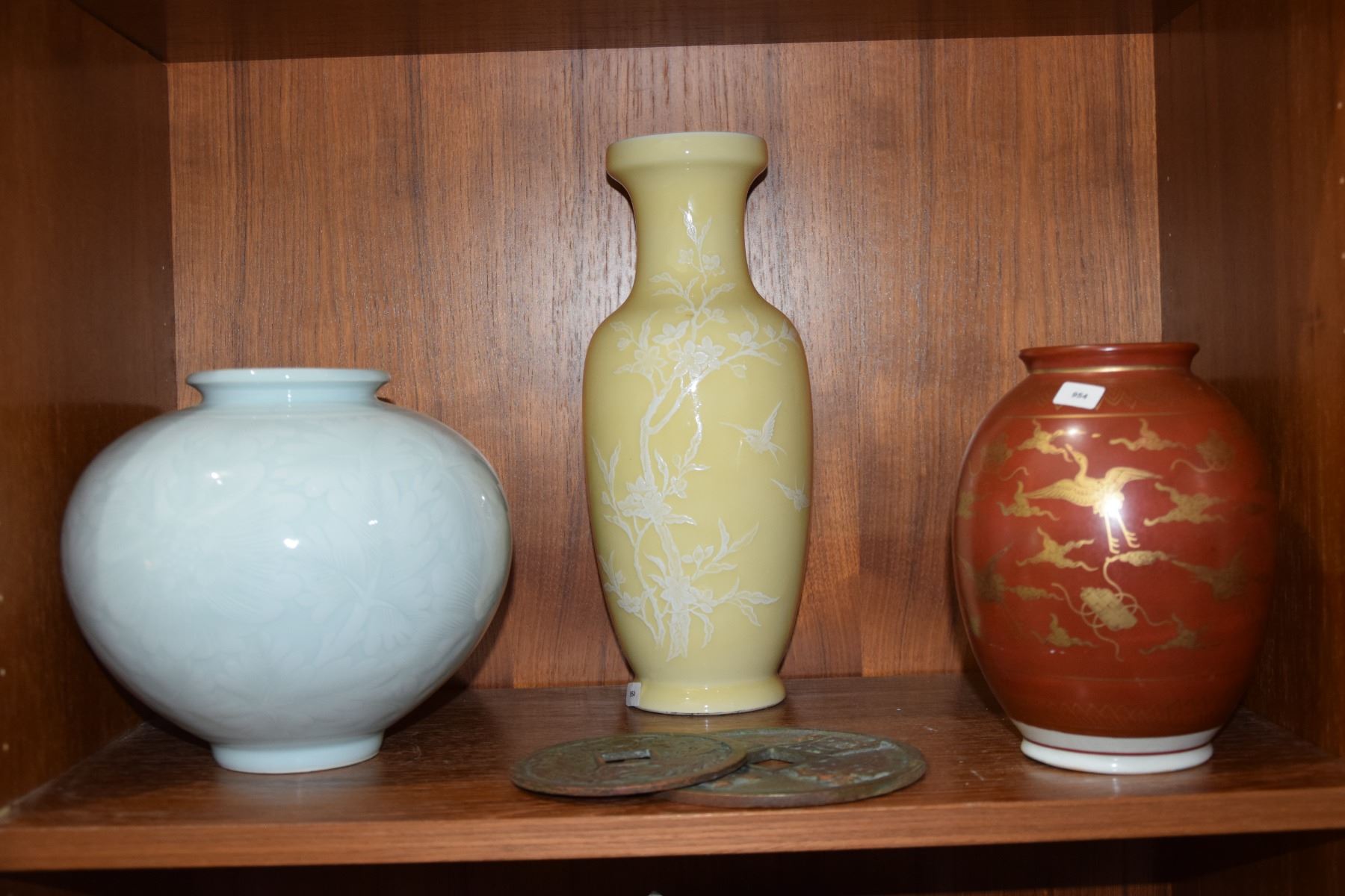 MIXED LOT: 3 PORCELAIN VASES & 2 BRASS ORNAMENTAL COINS (5 PCS)