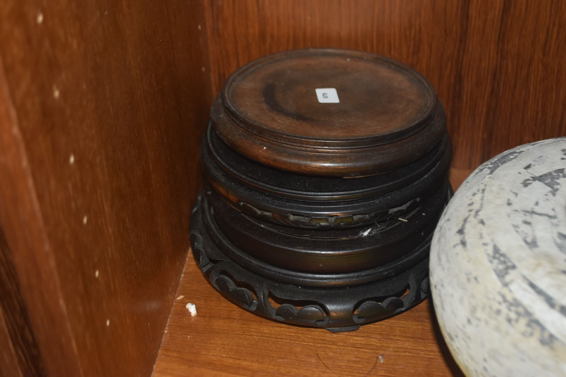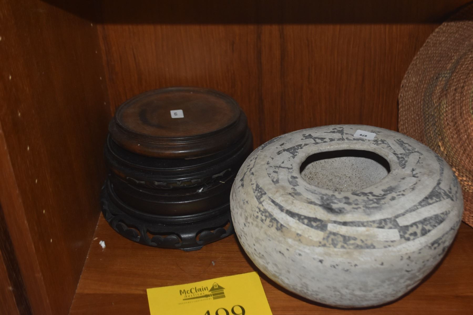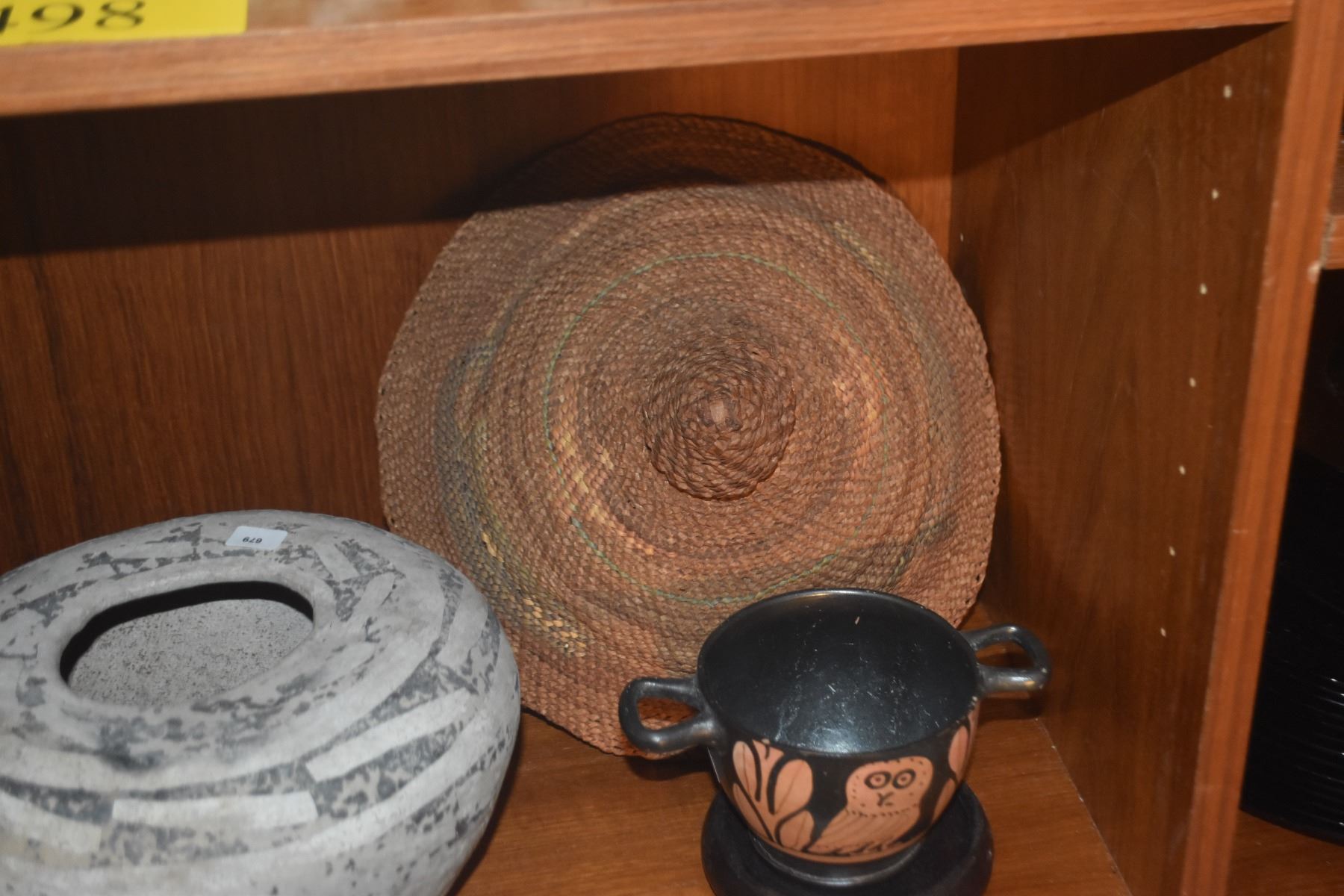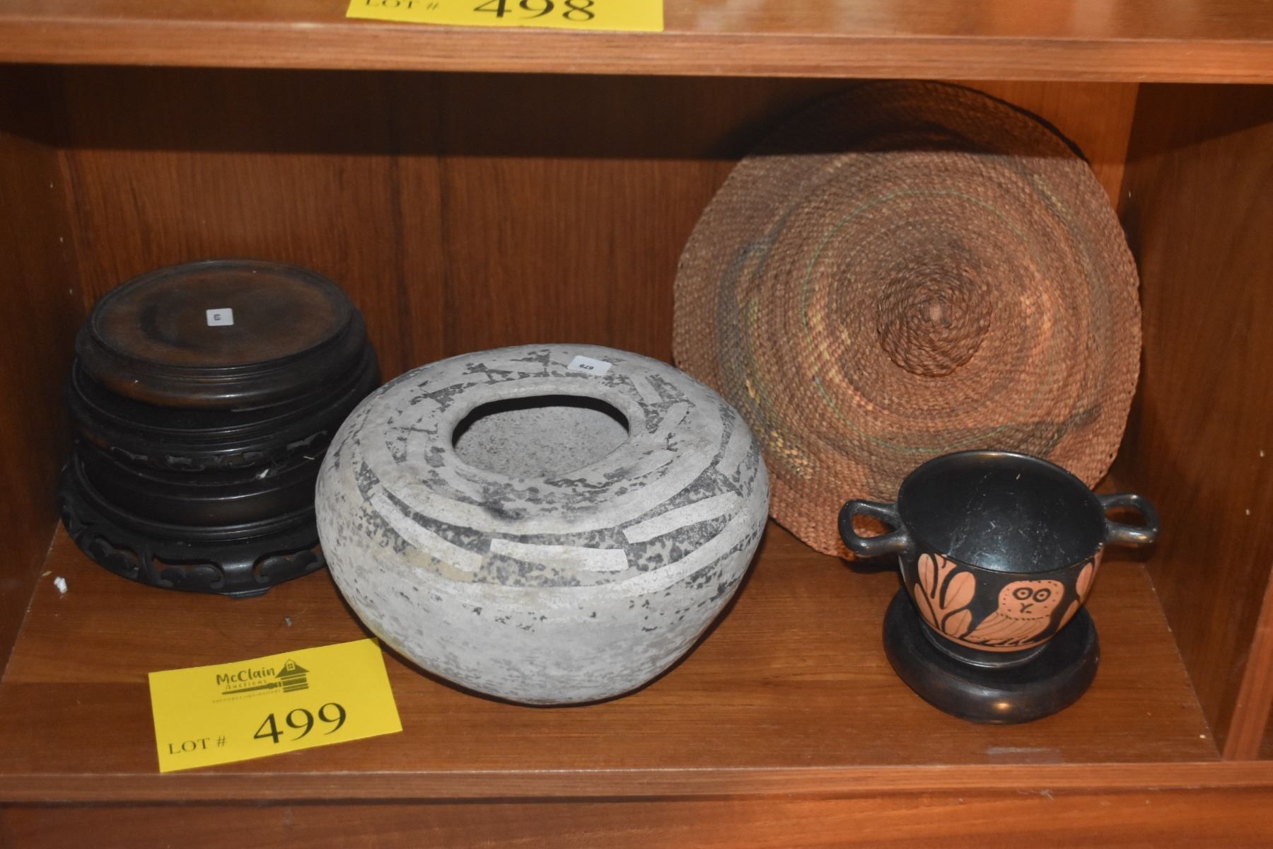 MIXED LOT: A GREEK RED-FIGURE OWL SKYPHOS, EARTHENWARE VESSEL, WOOD STANDS & WOVEN HAT (8 PCS)