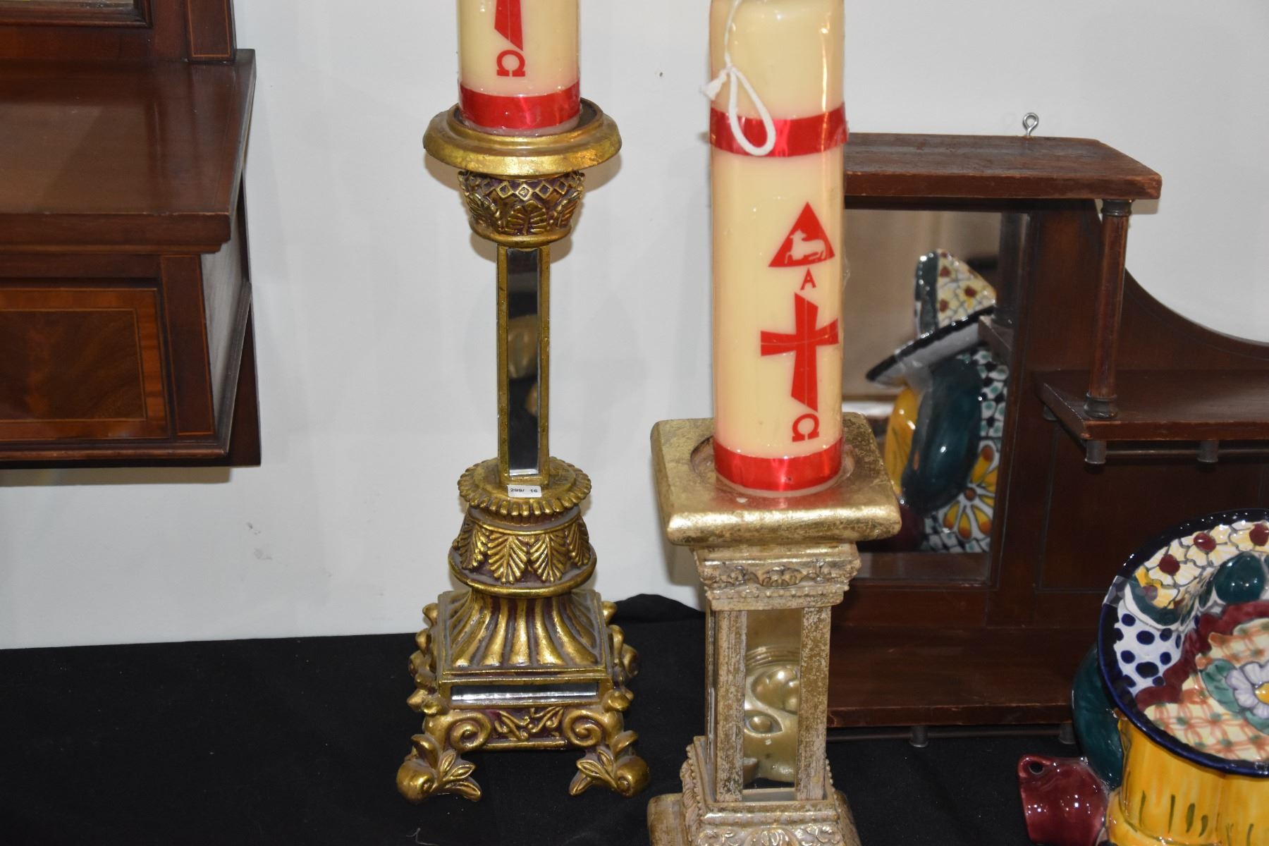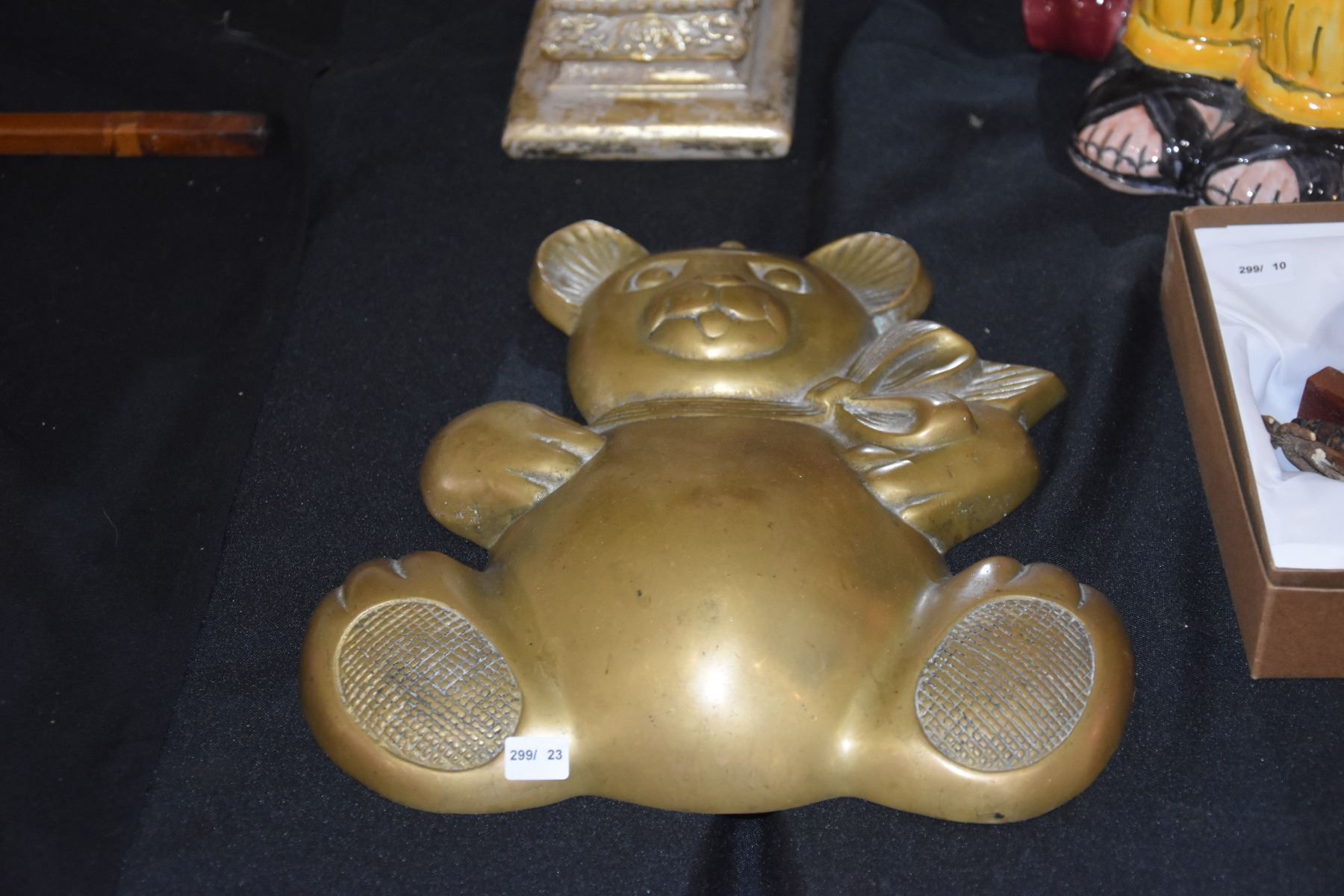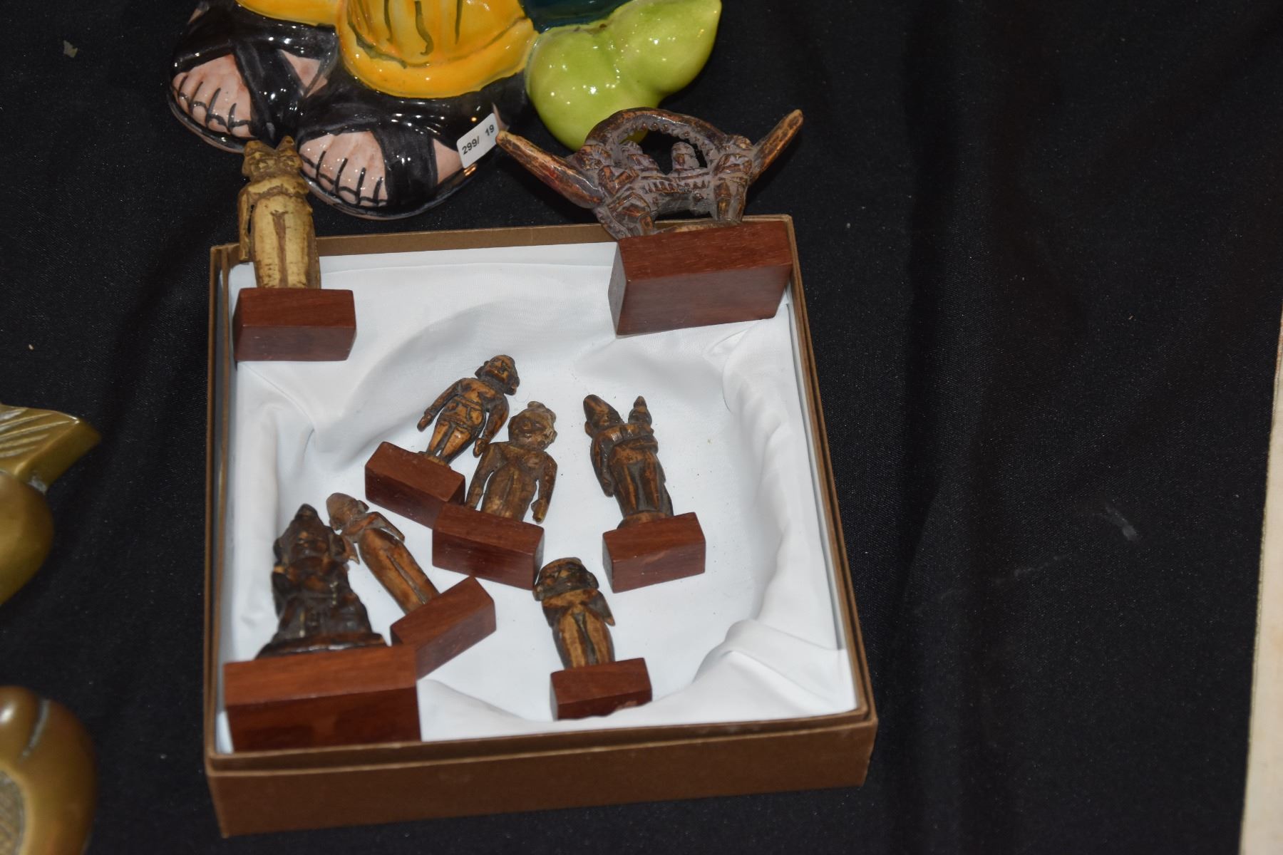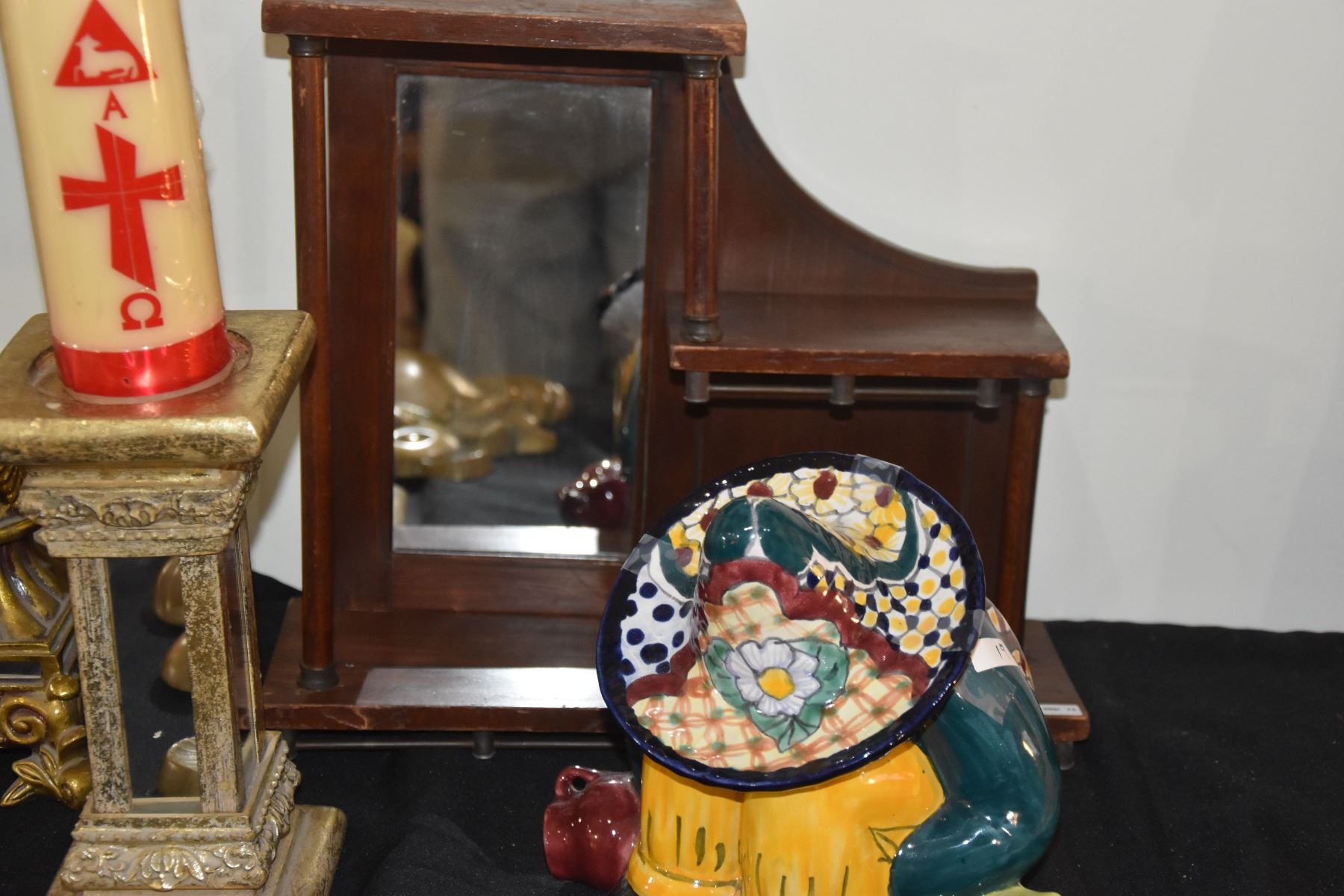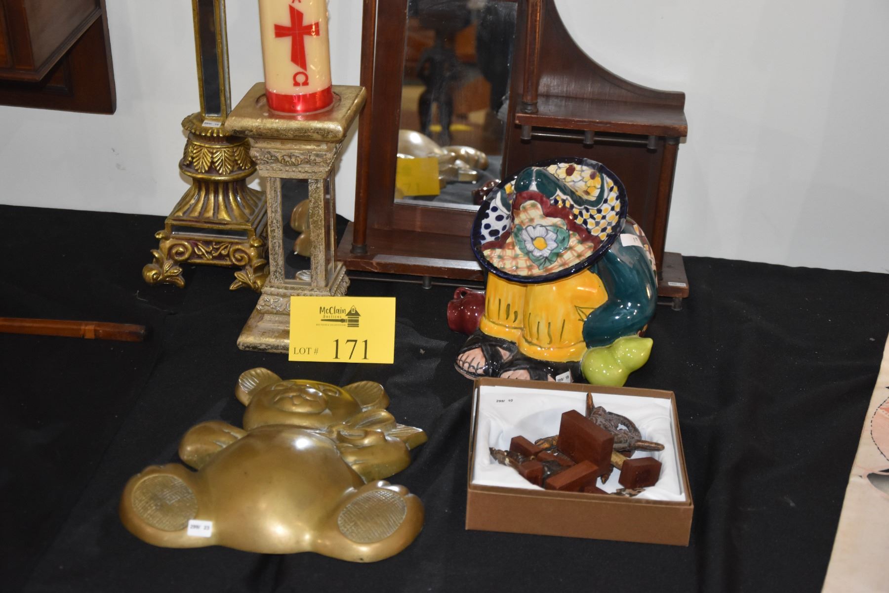 MIXED LOT: BONE HINDU DEITIES, LOVING BRONZE BEAR, SPANISH MIRROR WALL SHELF, SPANISH CANDLE STICKS & MEXICAN COOKIE JAR (6 PCS)