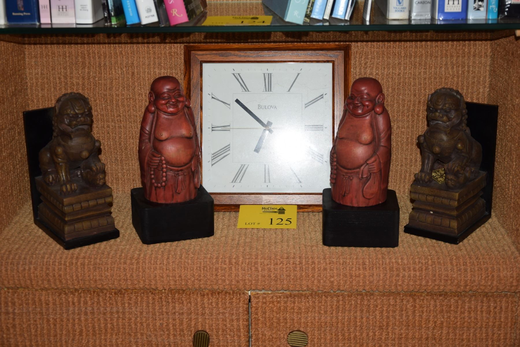 MIXED LOT: BOOK ENDS, STATUARY & WALL CLOCK (5 PCS)