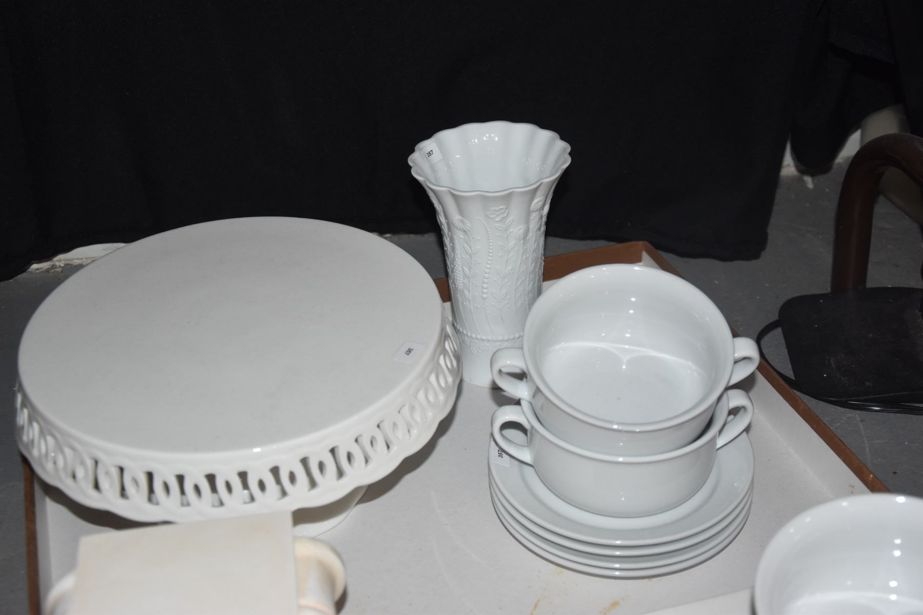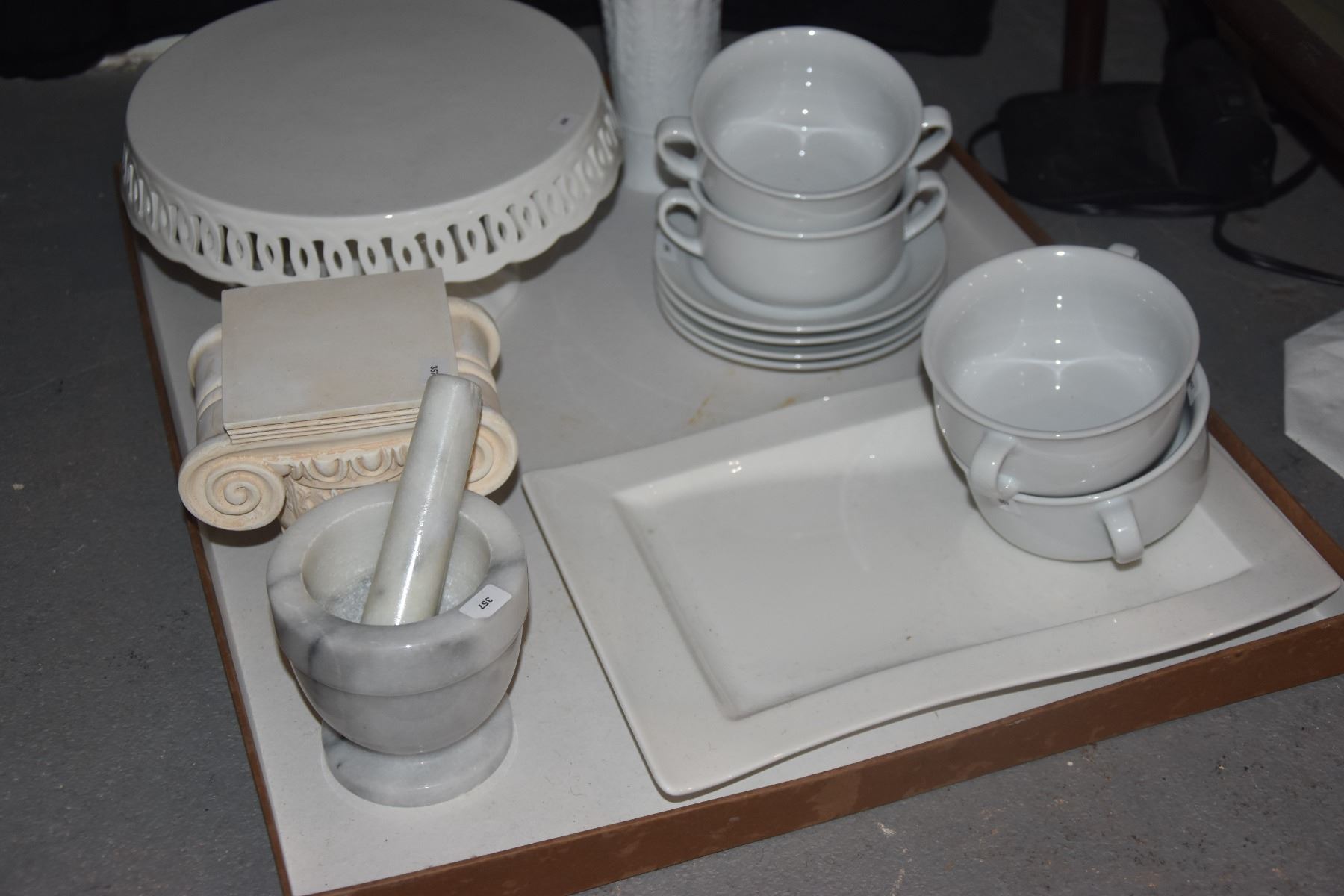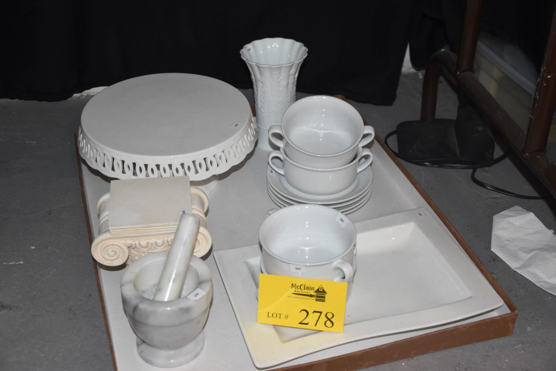 MIXED LOT: BOWLS, PLATES, CAKE STAND, MORTAR & PESTLE (14 PCS)