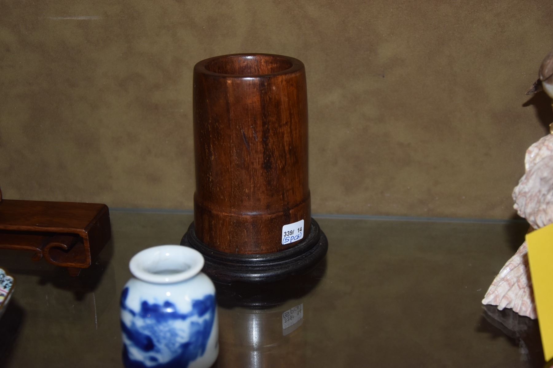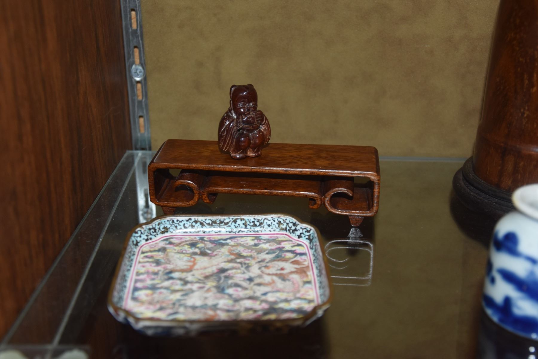 MIXED LOT: CHINESE GINKGO BOY BEAD, SCROLL STAND, BRUSH POT W/STAND, ENAMEL DISH W/DRAGON & BLUE & WHITE INK WASHER (5 PCS)