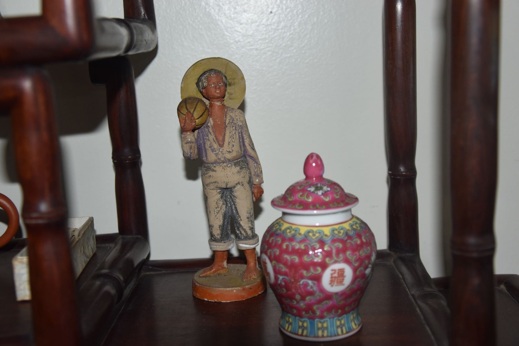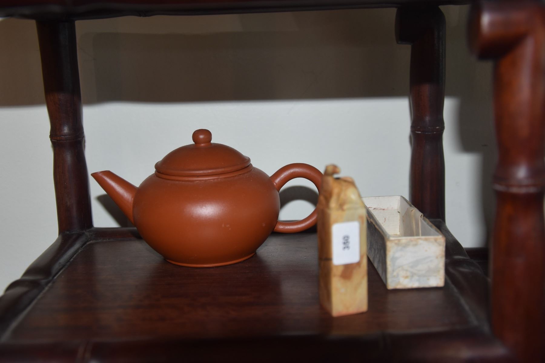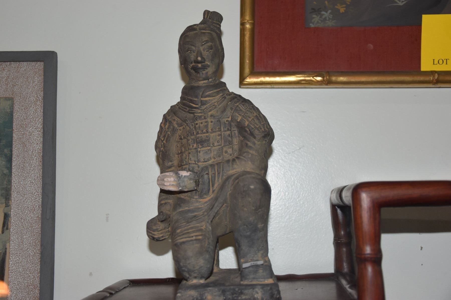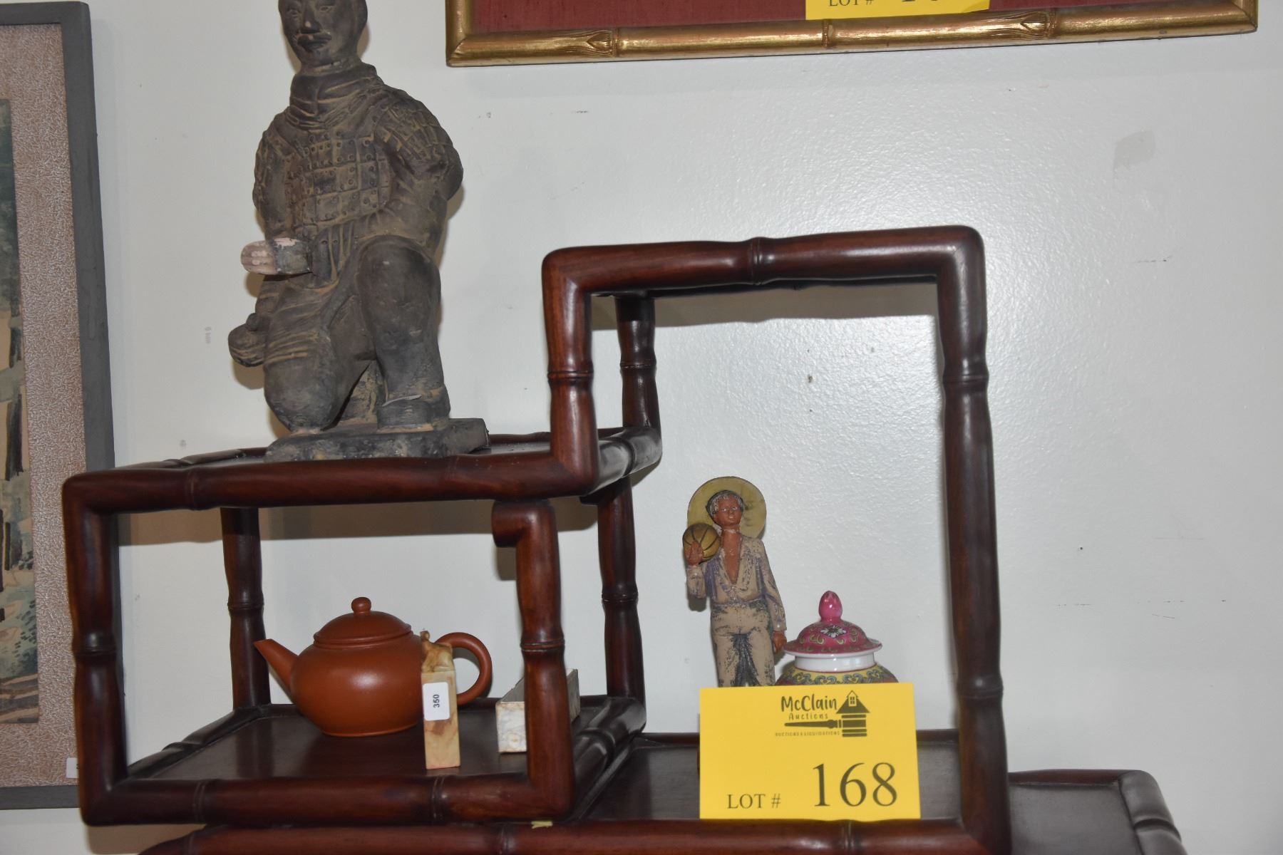 MIXED LOT: CHINESE TERRACOTTA WARRIOR FIGURE, SMALL TEA POT, CHOP & COVERED JAR (4 PCS)