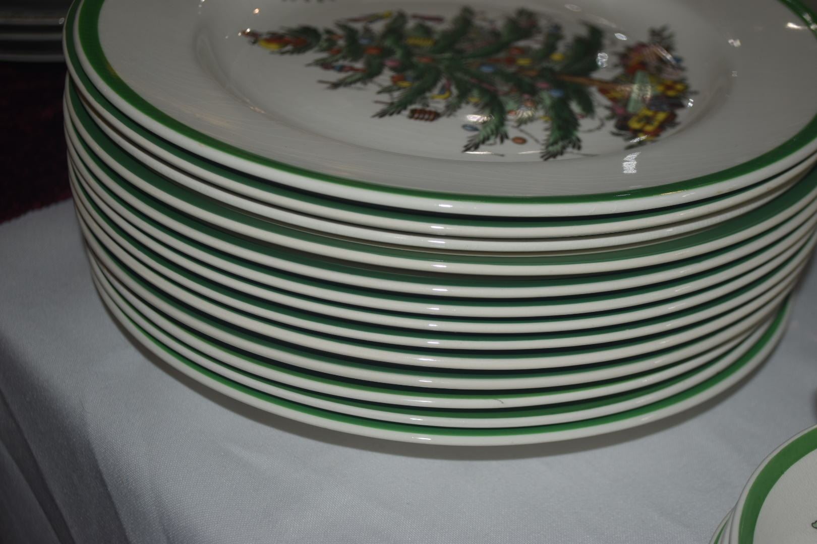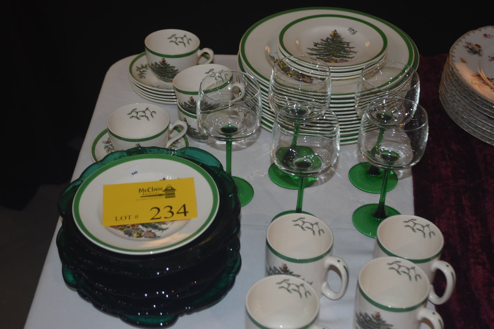 MIXED LOT: COPELAND SPODE CHRISTMAS TREE CHINA, VINTAGE LUMINARC EMERALD GREEN WINE GLASSES & GREEN GLASS DISHES (46 PCS)