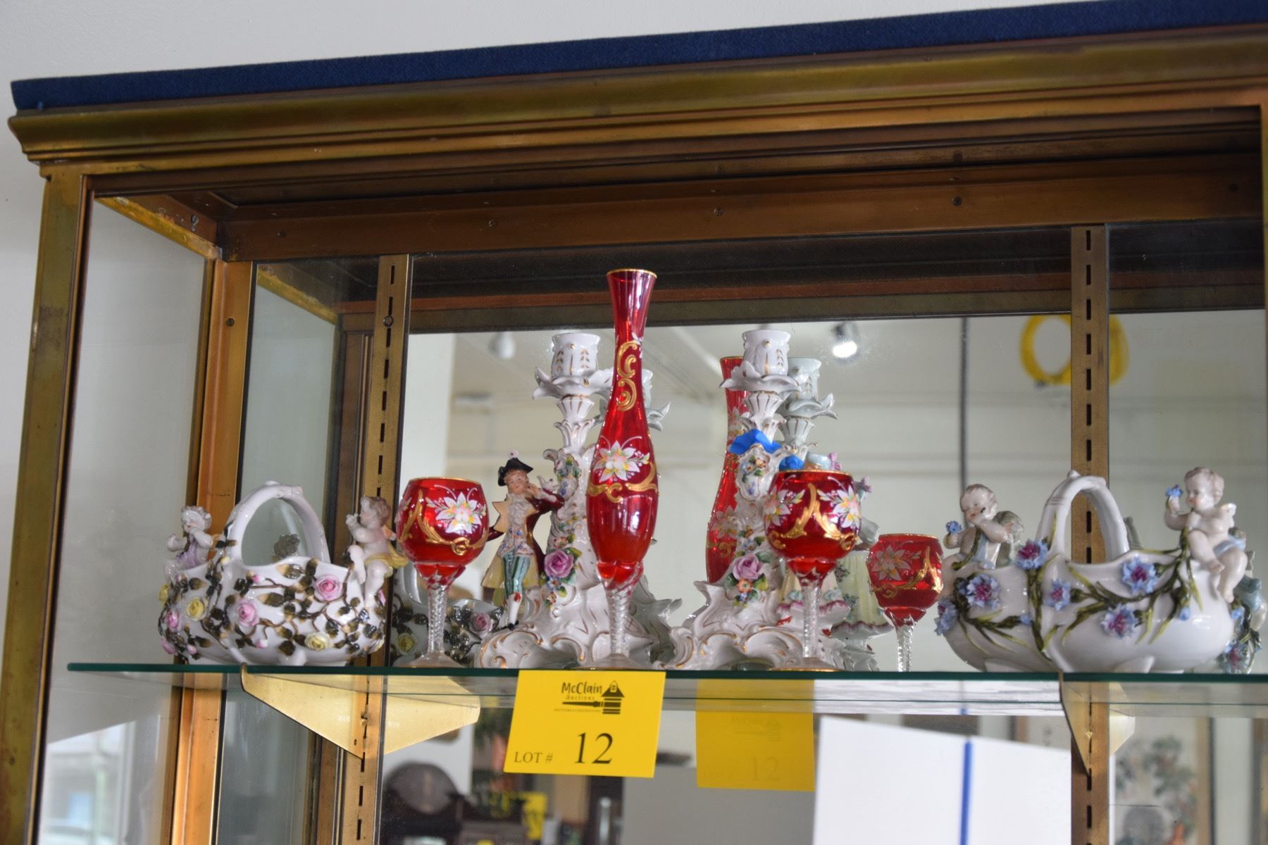 MIXED LOT: GERMAN CANDLE STICKS, EUROPEAN PORCELAIN BASKETS & RUBY GLASS STEMWARE (SOME REPAIRS) (7 PCS)