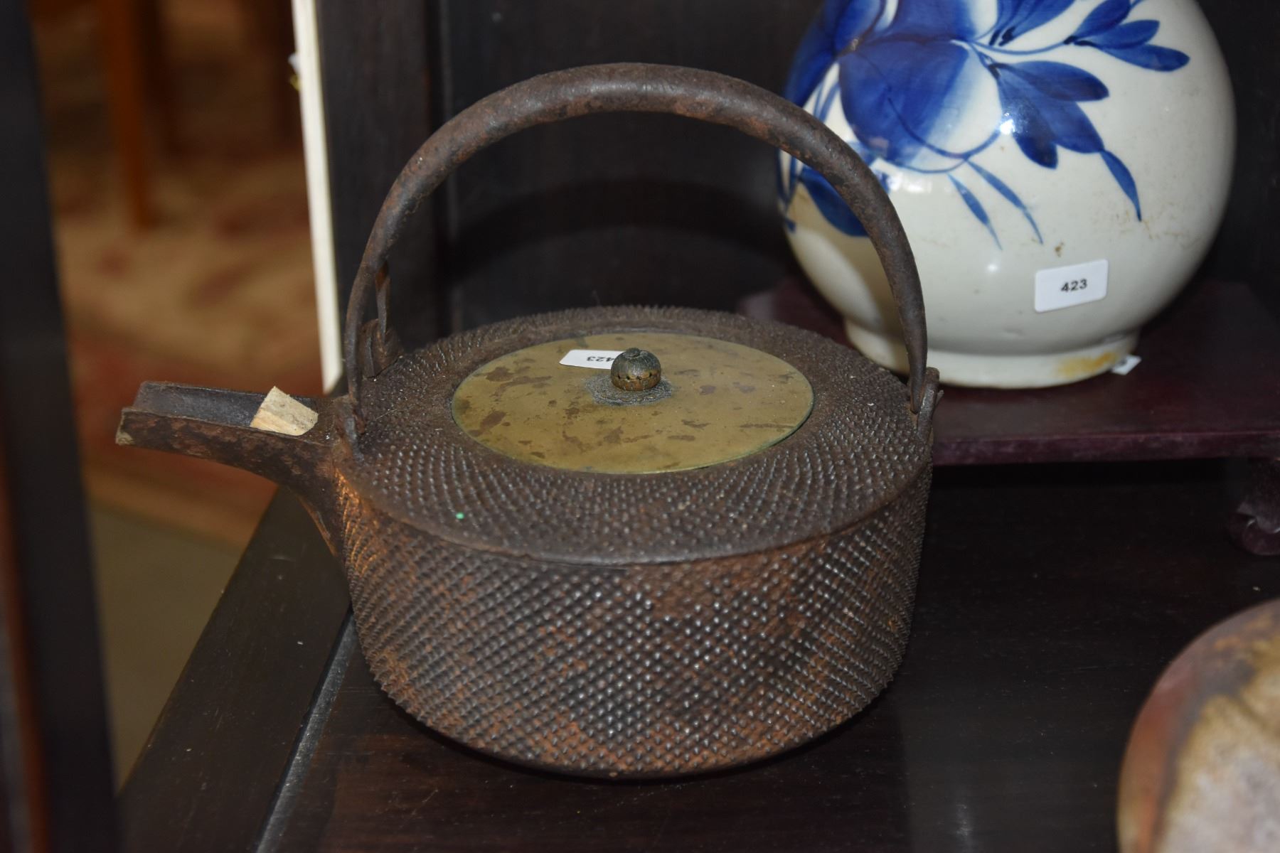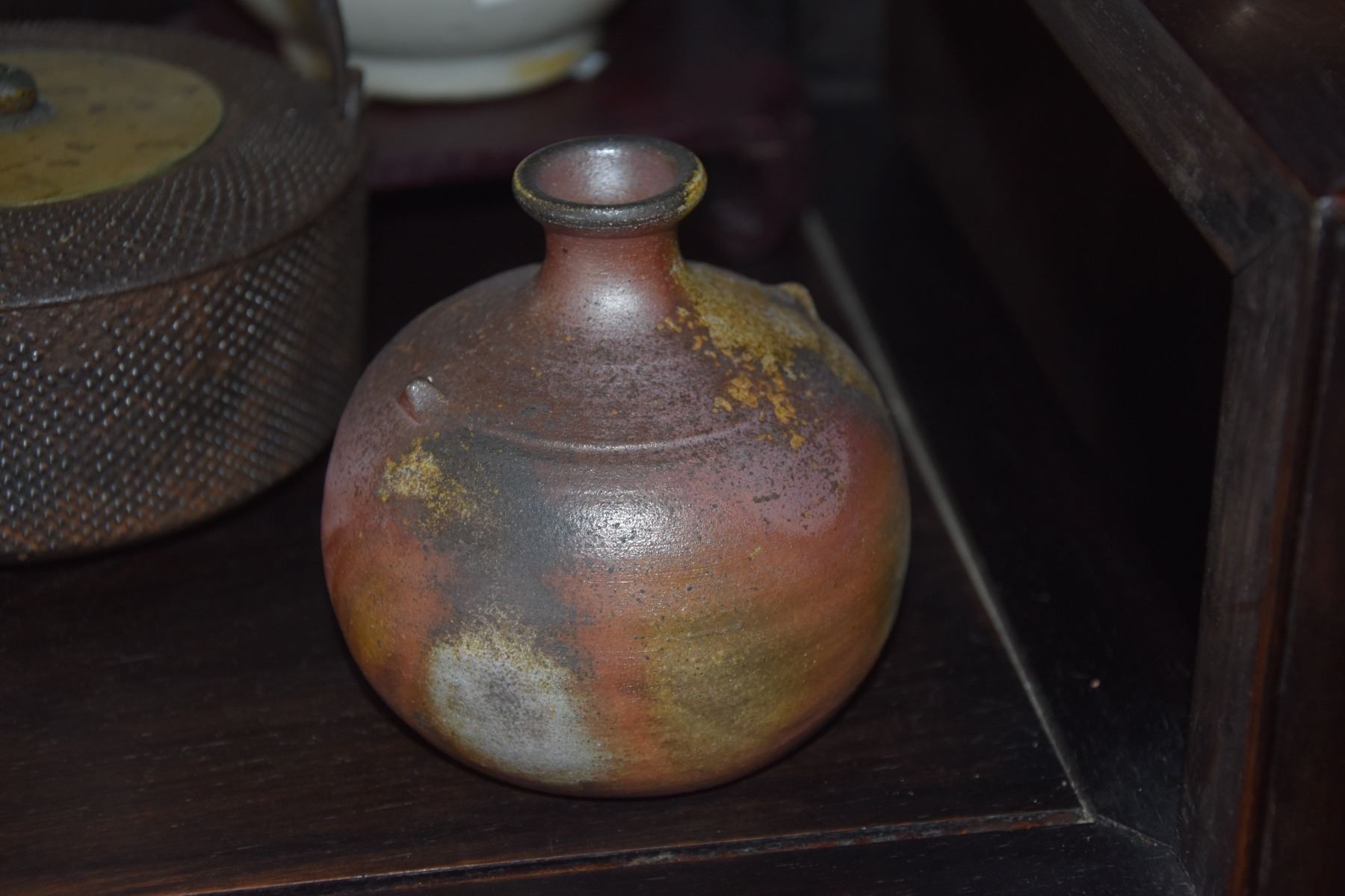 MIXED LOT: JAPANESE BLUE & WHITE SAKE DECANTER, IRON WINE POT & CERAMIC DECANTER; SIGNED (3 PCS)