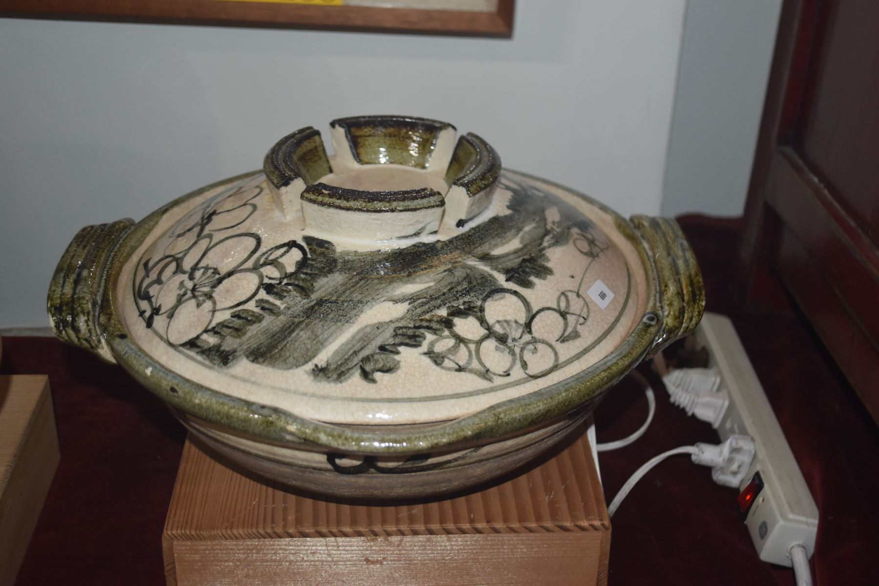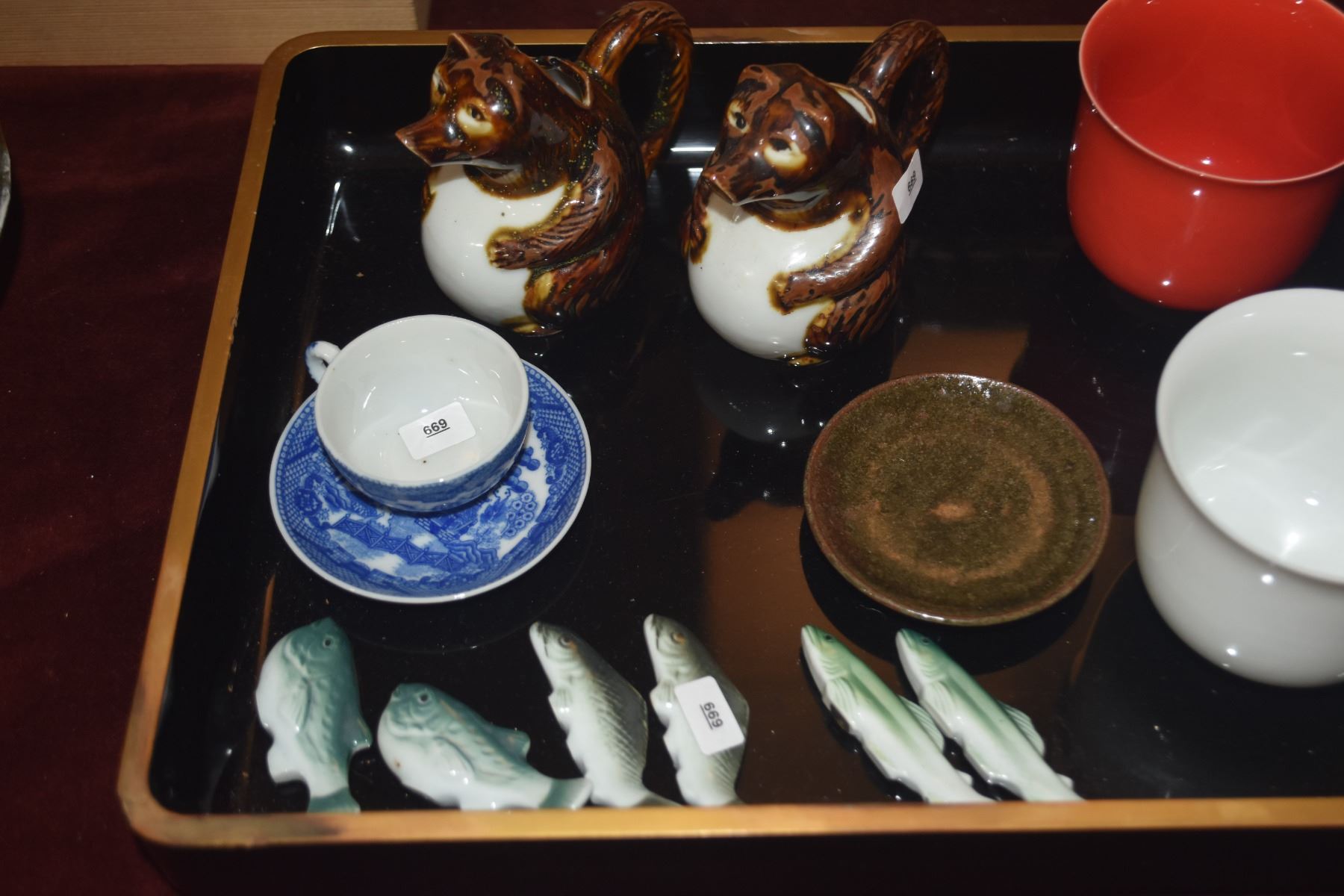 MIXED LOT: JAPANESE DONABE, BOWLS, CUPS, CHOPSTICK RESTS, PORCELAIN BEAR FIGURAL CREAMERS, ETC. (23