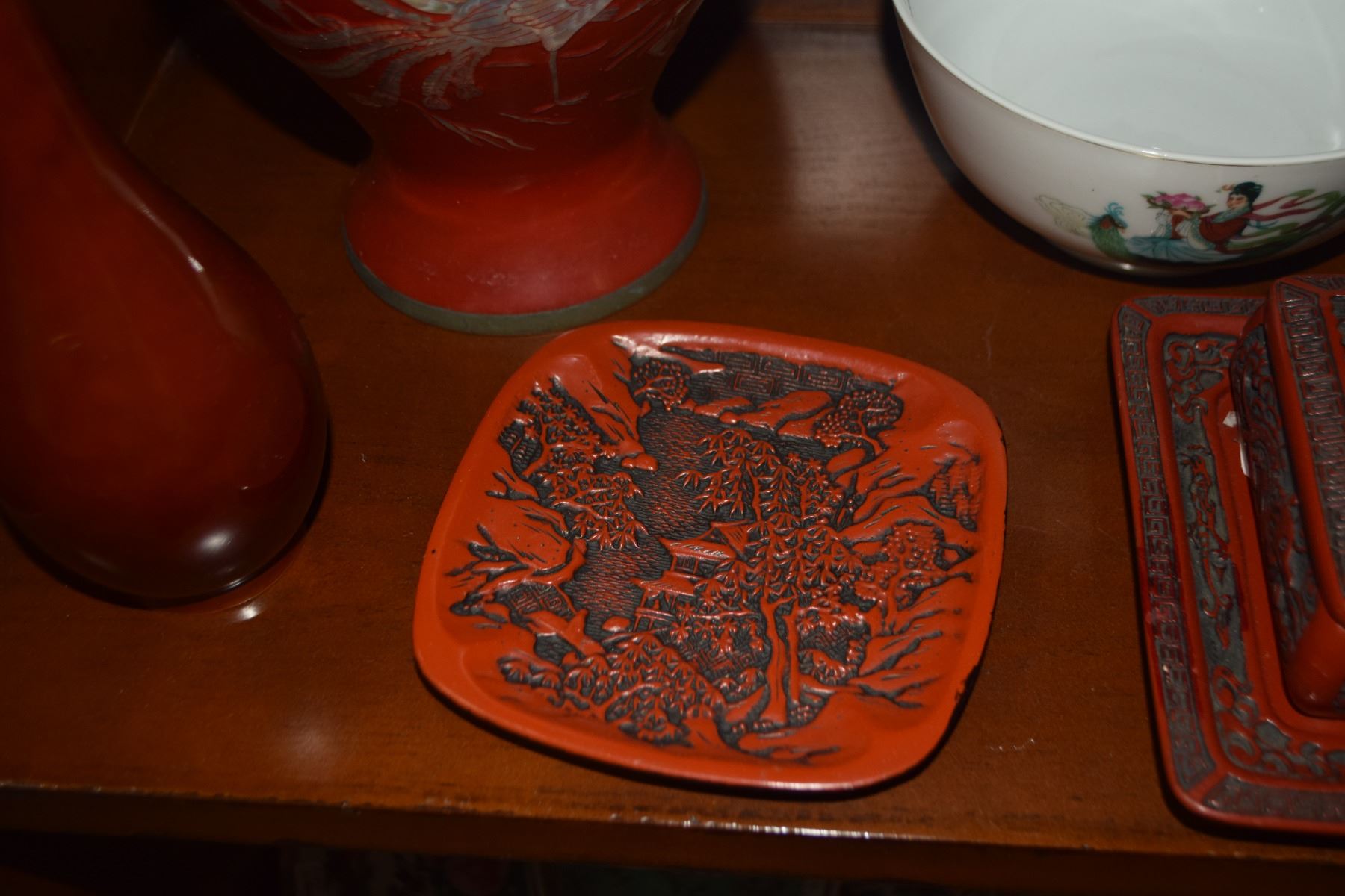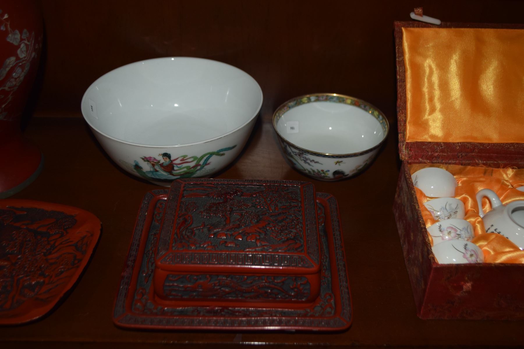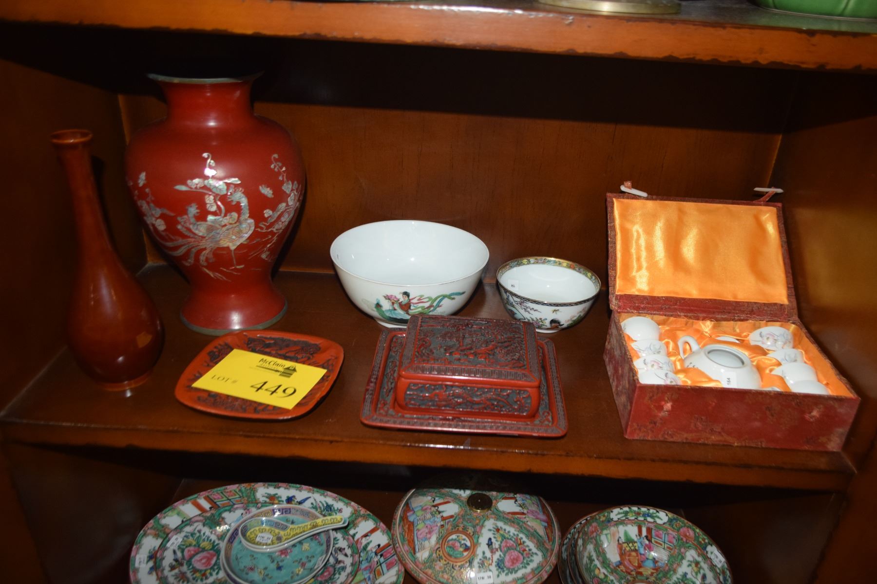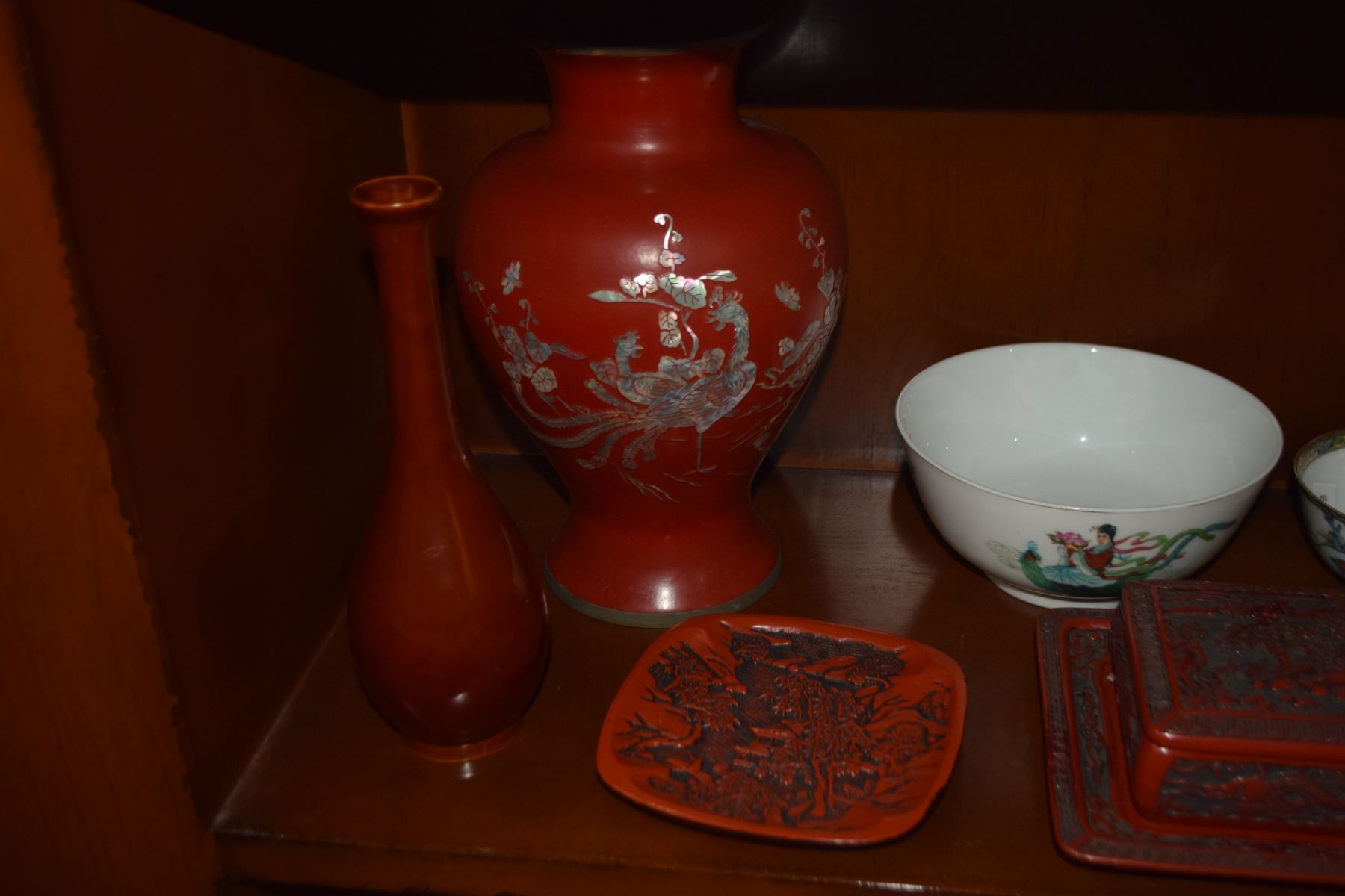 MIXED LOT: KOREAN & CHINESE VASES, BOWLS, TEA POT & CUPS, CINNABAR BOX & TRAYS (8 PCS)