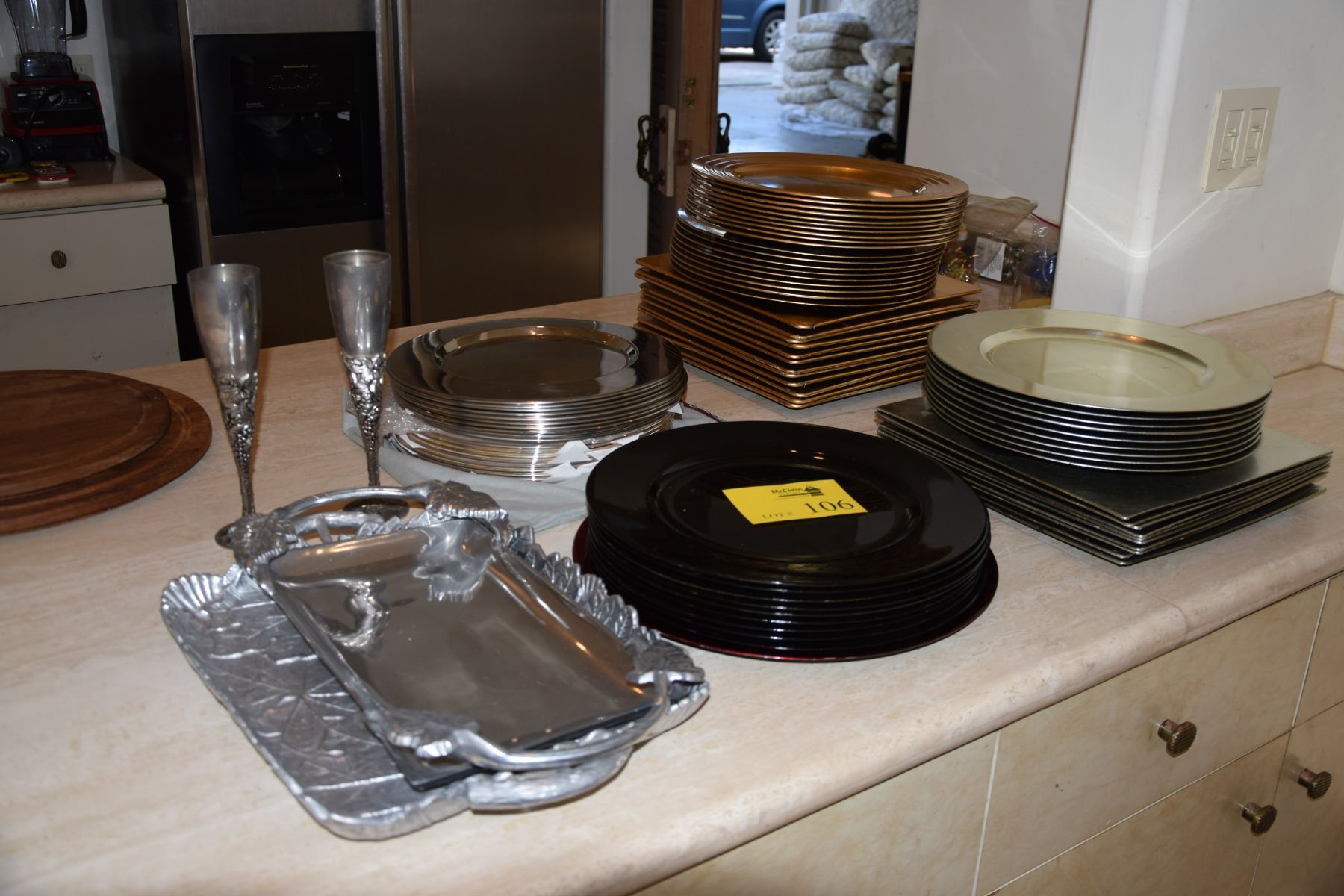 MIXED LOT: LACQUER & STAINLESS PLATES/CHARGERS, GODINGER FLUTES & PUPU TRAYS (83 PCS)