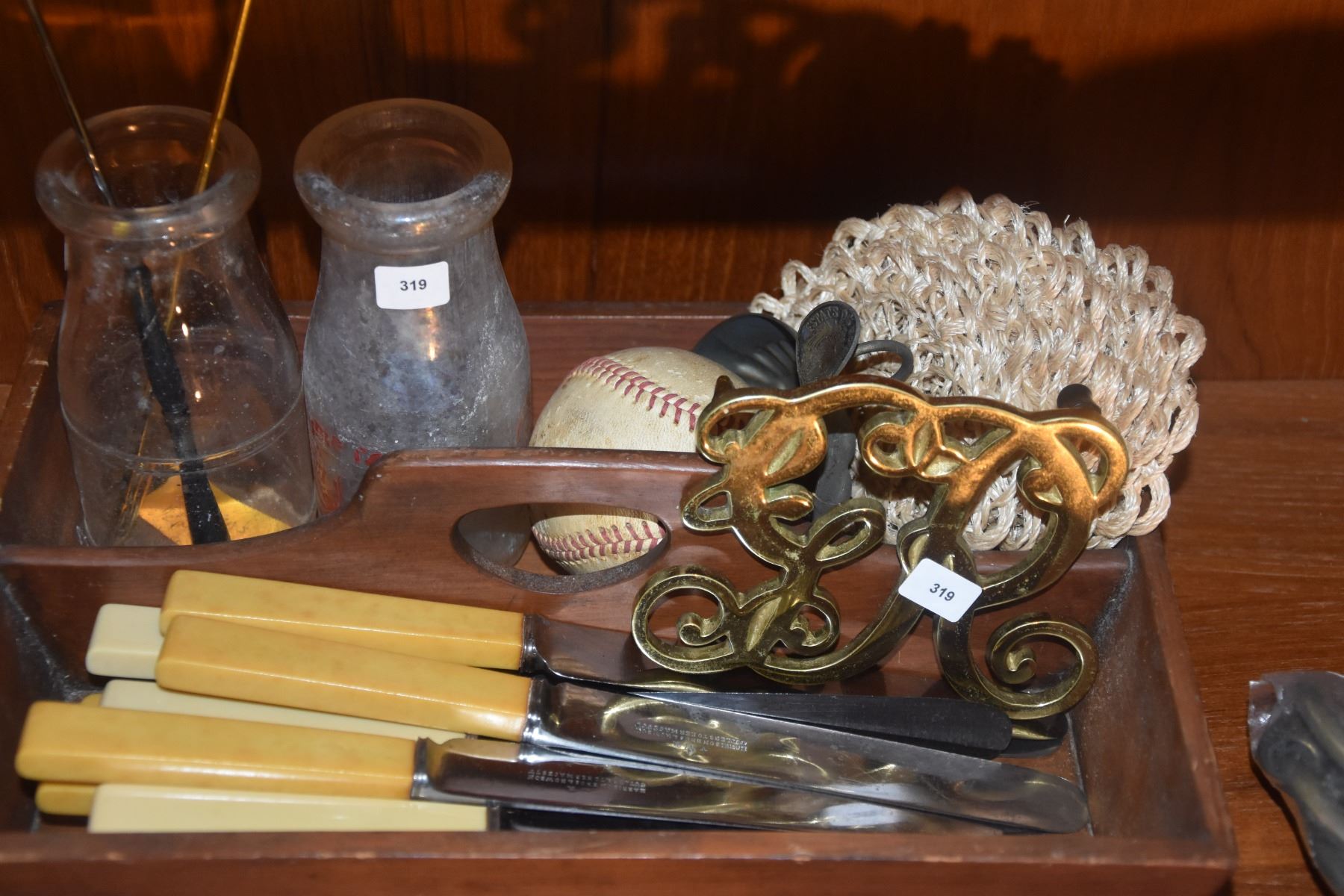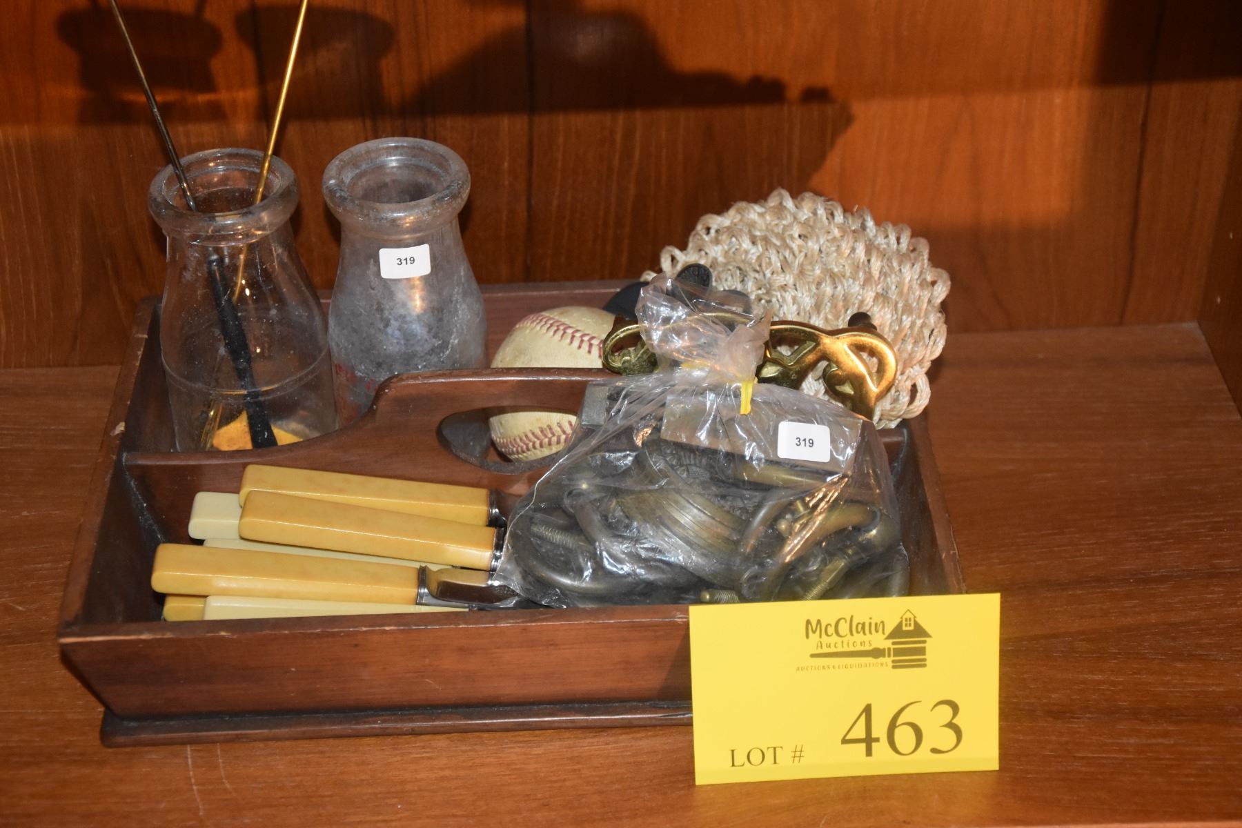 MIXED LOT: MILK BOTTLES, BASEBALL (SIGNED), KNIVES, DRAWER PULLS, COASTERS, WINE CUP & TRAY