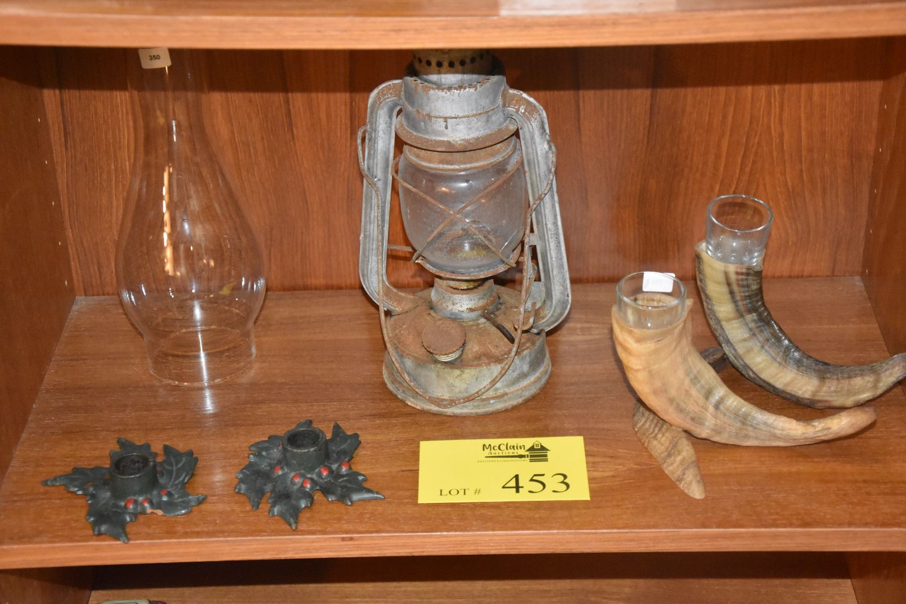 MIXED LOT: OIL LANTERN, GLASS HURRICANE SHADE, GLASSES & CANDLE HOLDERS (6 PCS)