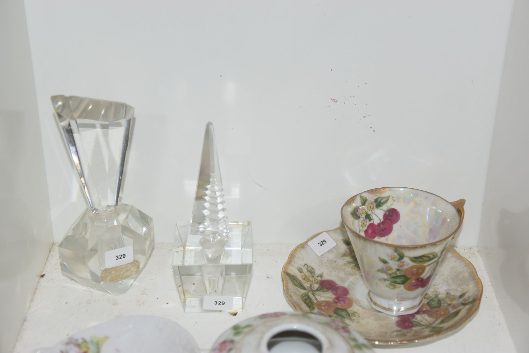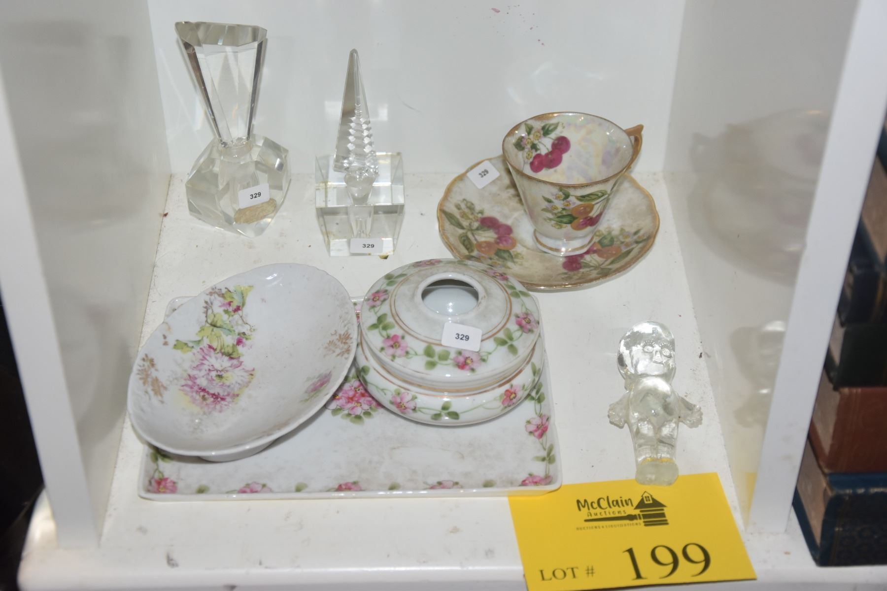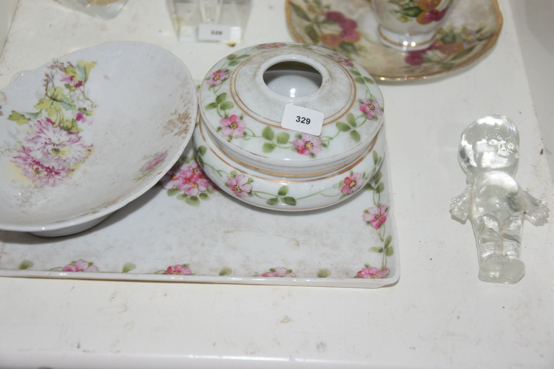 MIXED LOT: PERFUME BOTTLES, NIPPON TRAY & COTTON HOLDER, CUP & SAUCER & GLASS KEWPIE DOLL (7 PCS)