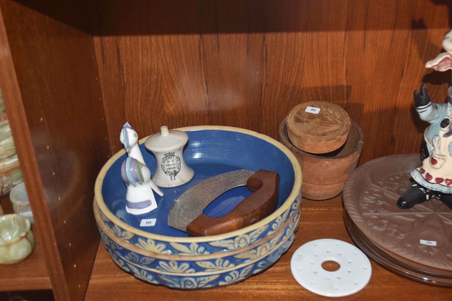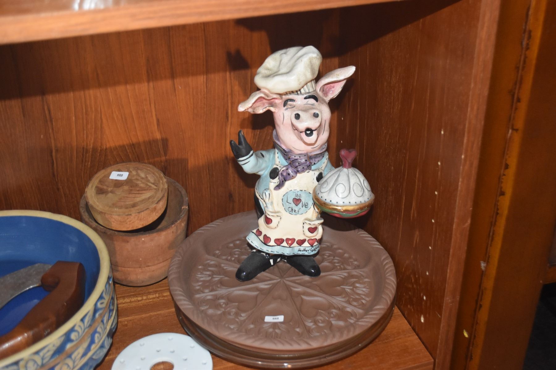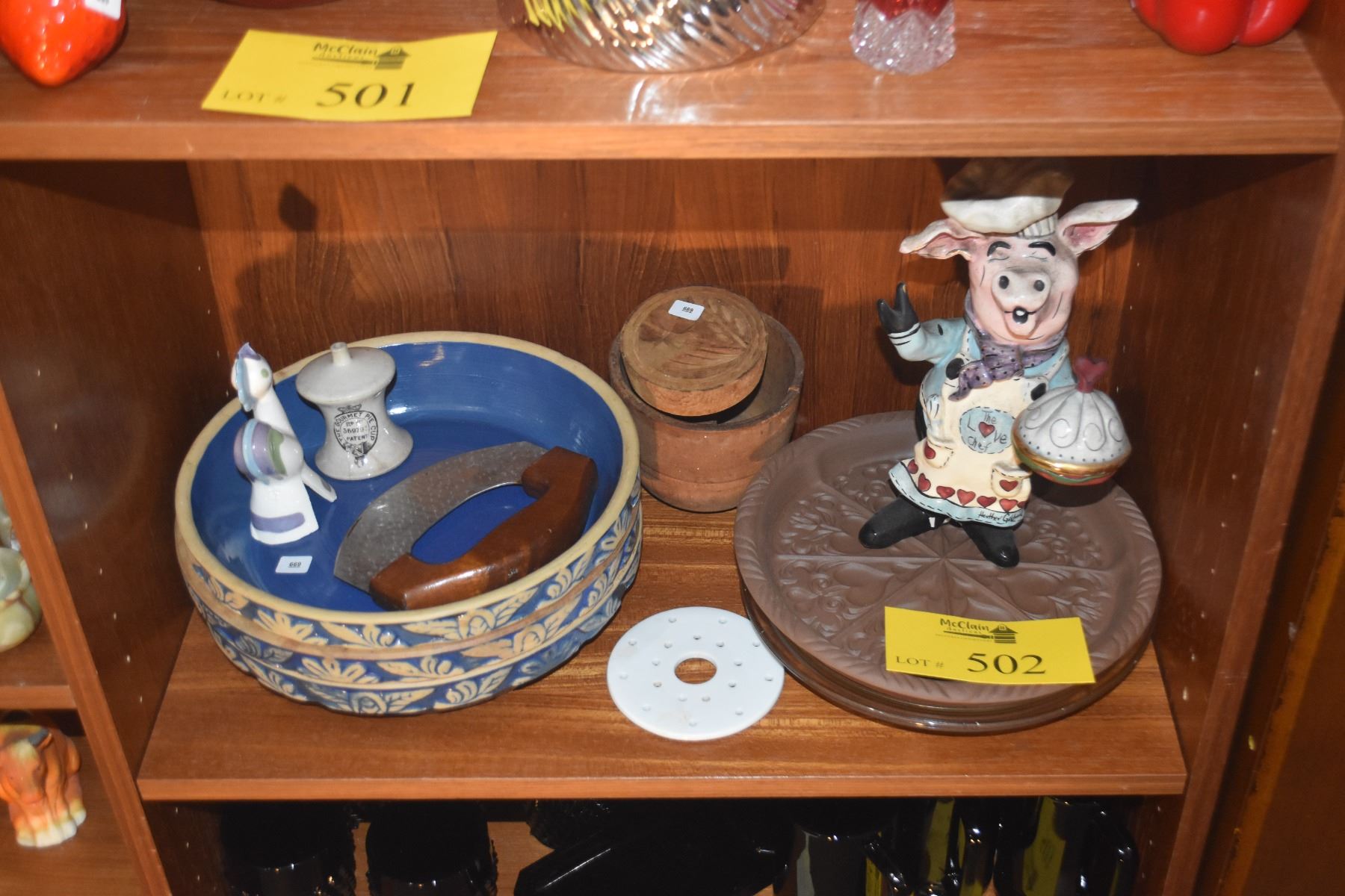 MIXED LOT: PIE PLATES, CUTTER, PIE WHISTLES, COOKIE STAMP & CHEF STATUE (11 PCS)