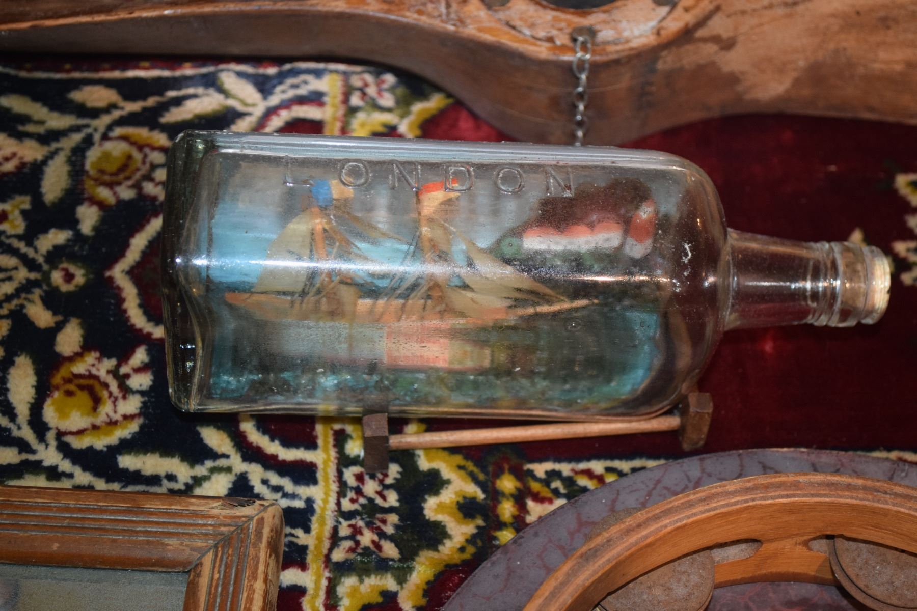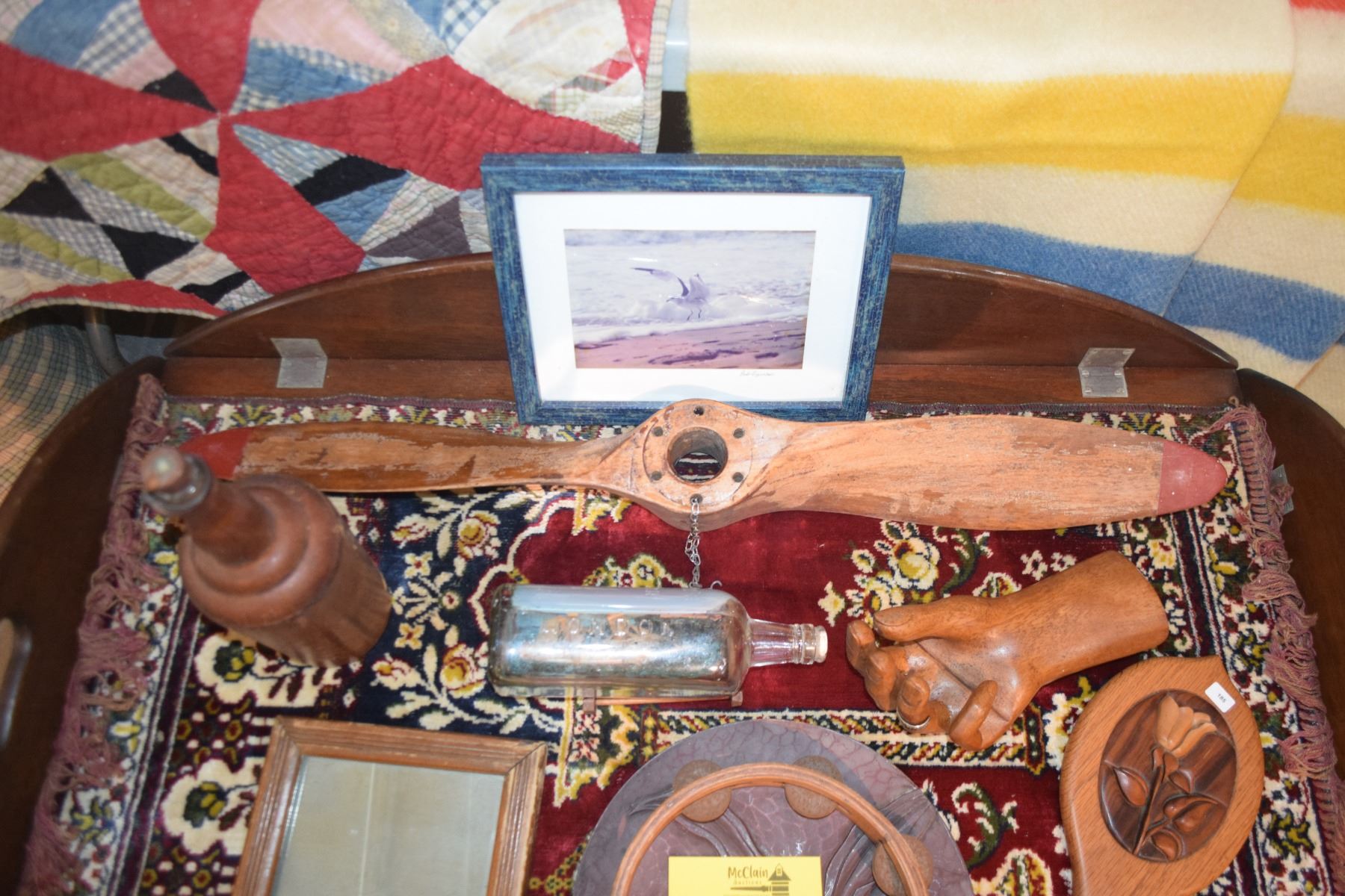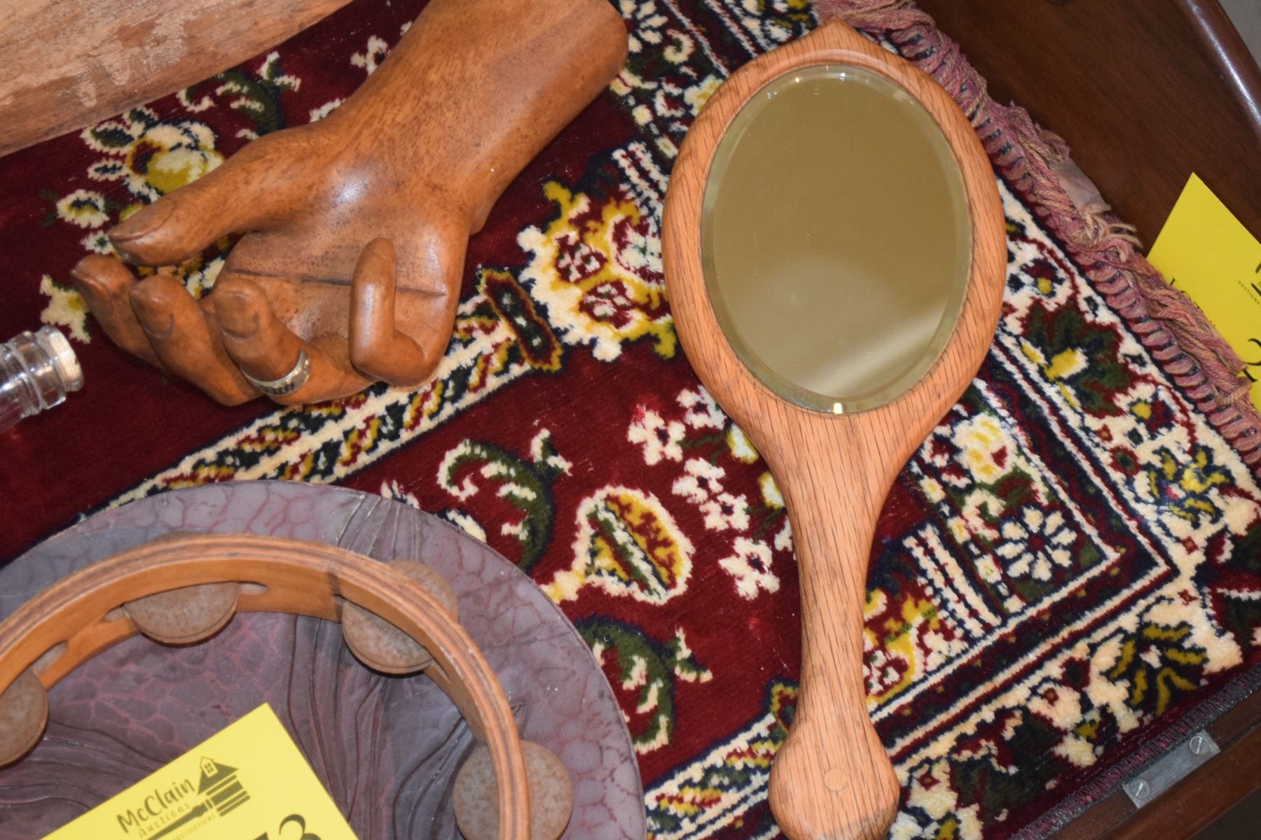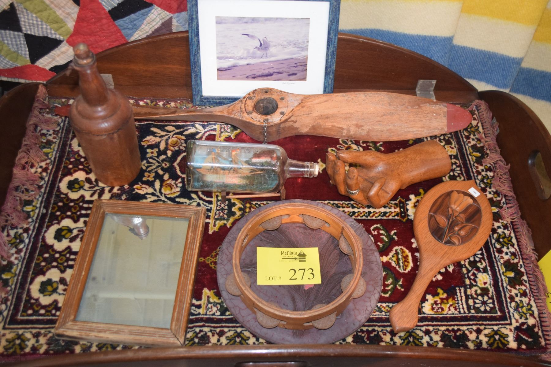 MIXED LOT: TAMBOURINE, MIRRORS, SHIP IN BOTTLE, PROPELLER, PLATE, BOTTLE, WOOD HAND & MAT (9 PCS)