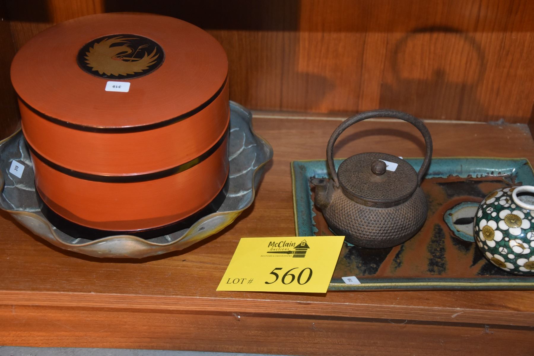 MIXED LOT: TEAPOT, LACQUER BOX, METAL BOWL, TRAY & VASE (5 PCS)