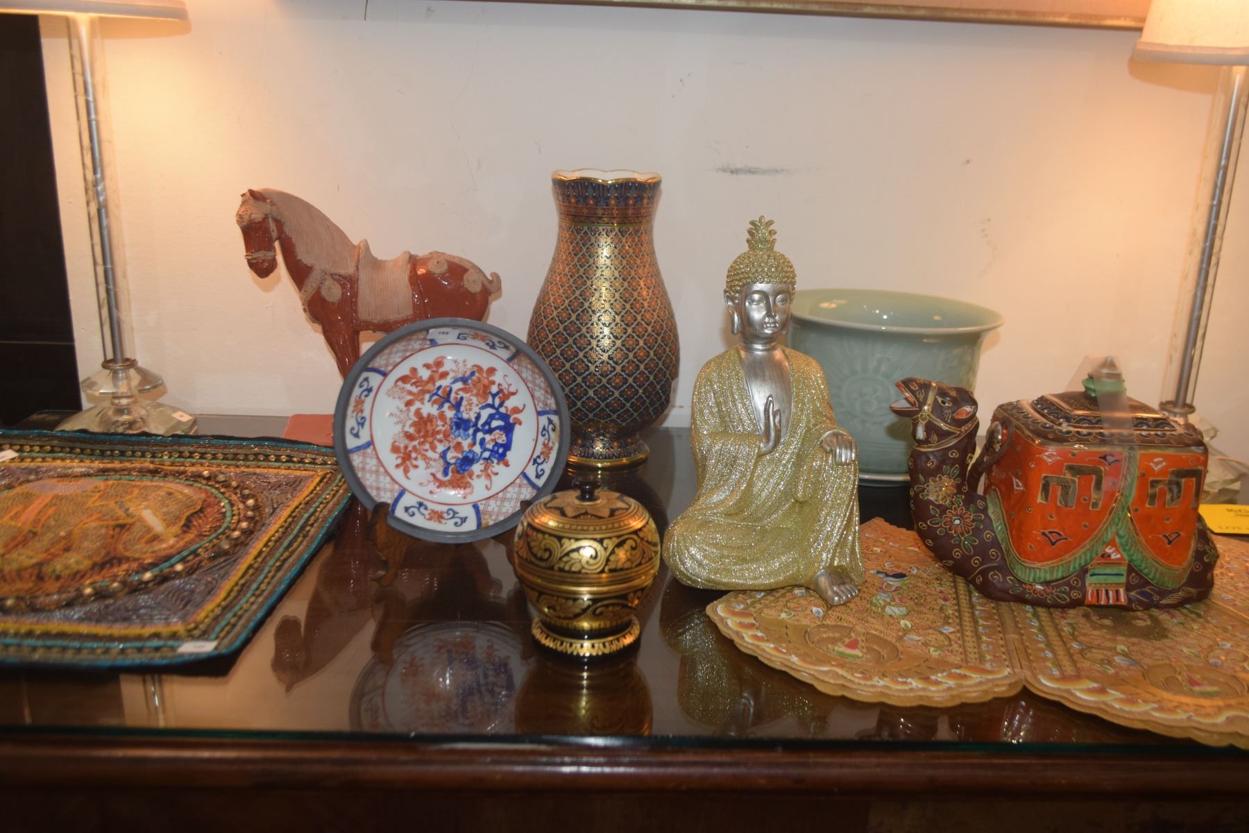 MIXED LOT: TEAPOT, VASE, TANG STYLE HORSE, PLANTER, PLATE & THAI BUDDHA (9 PCS)