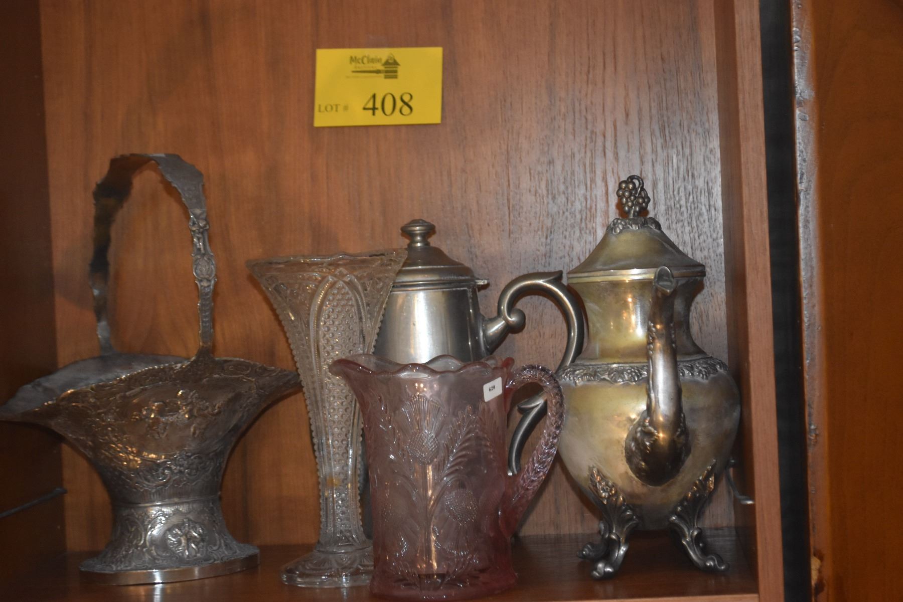 MIXED LOT: TEAPOTS, GLASS VASE, MOSSER GLASS INVERTE THISTLE PITCHER & ANTIQUE VICTORIAN BRIDES BASK