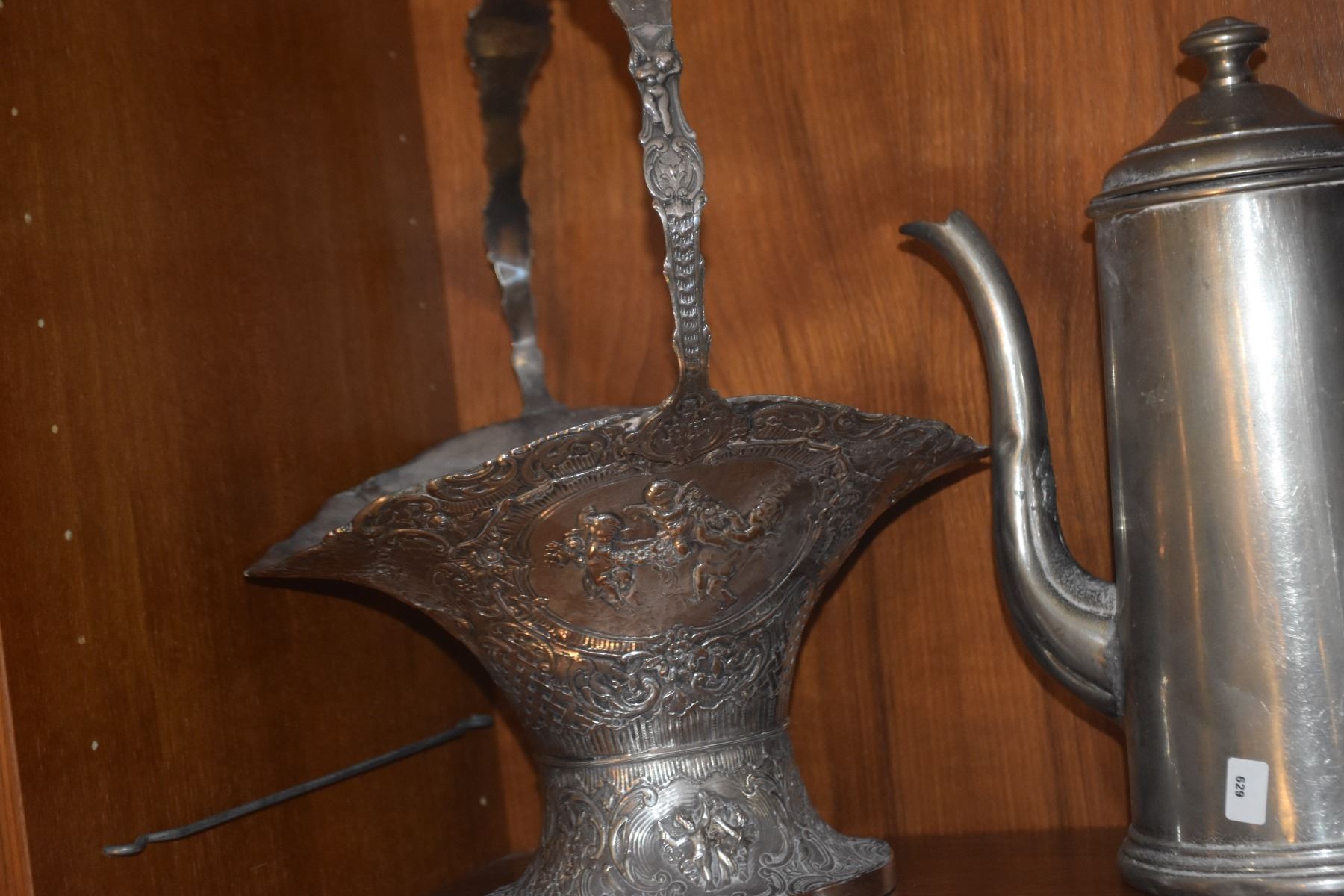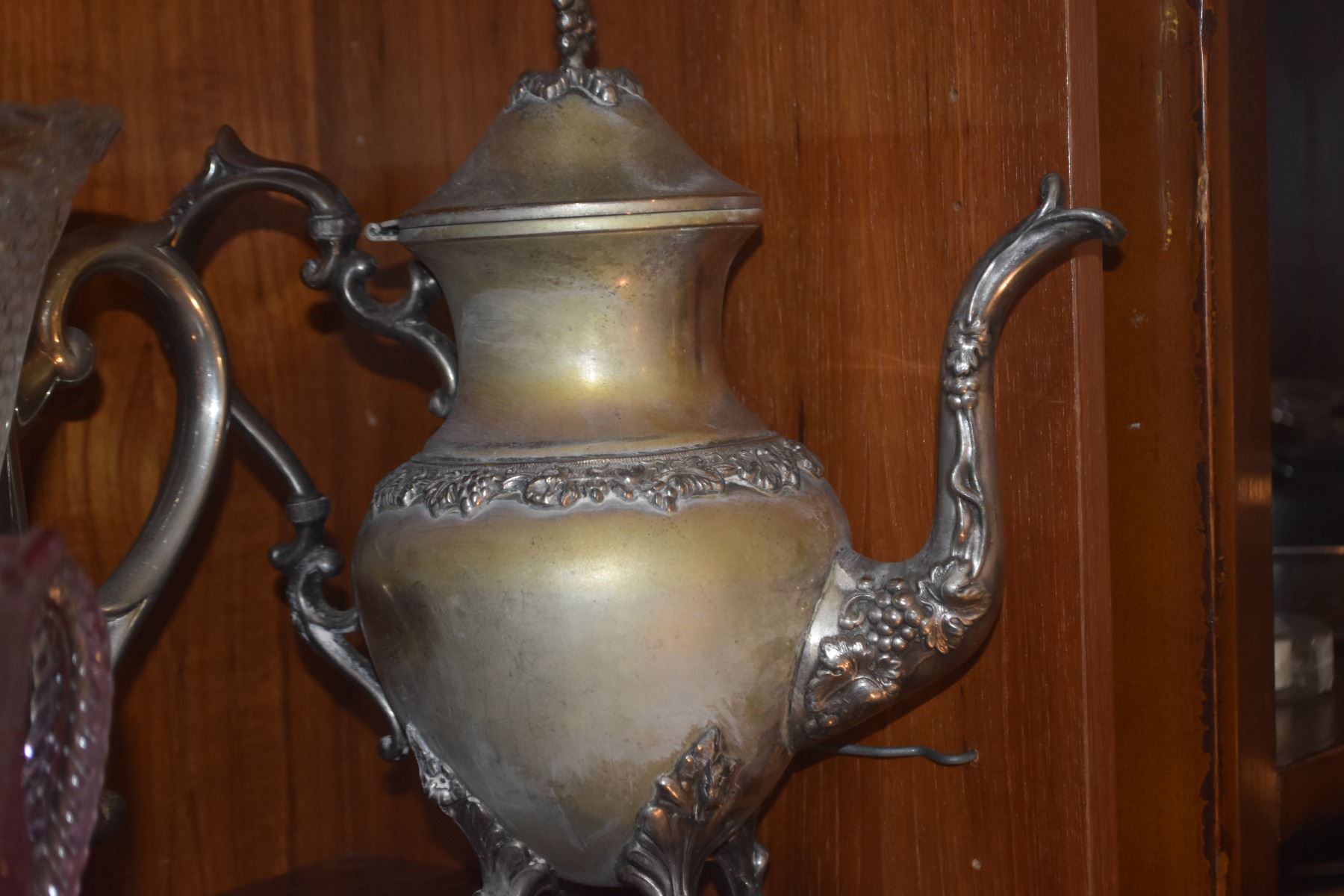 MIXED LOT: TEAPOTS, GLASS VASE, MOSSER GLASS INVERTE THISTLE PITCHER & ANTIQUE VICTORIAN BRIDES BASKET (5 PCS)