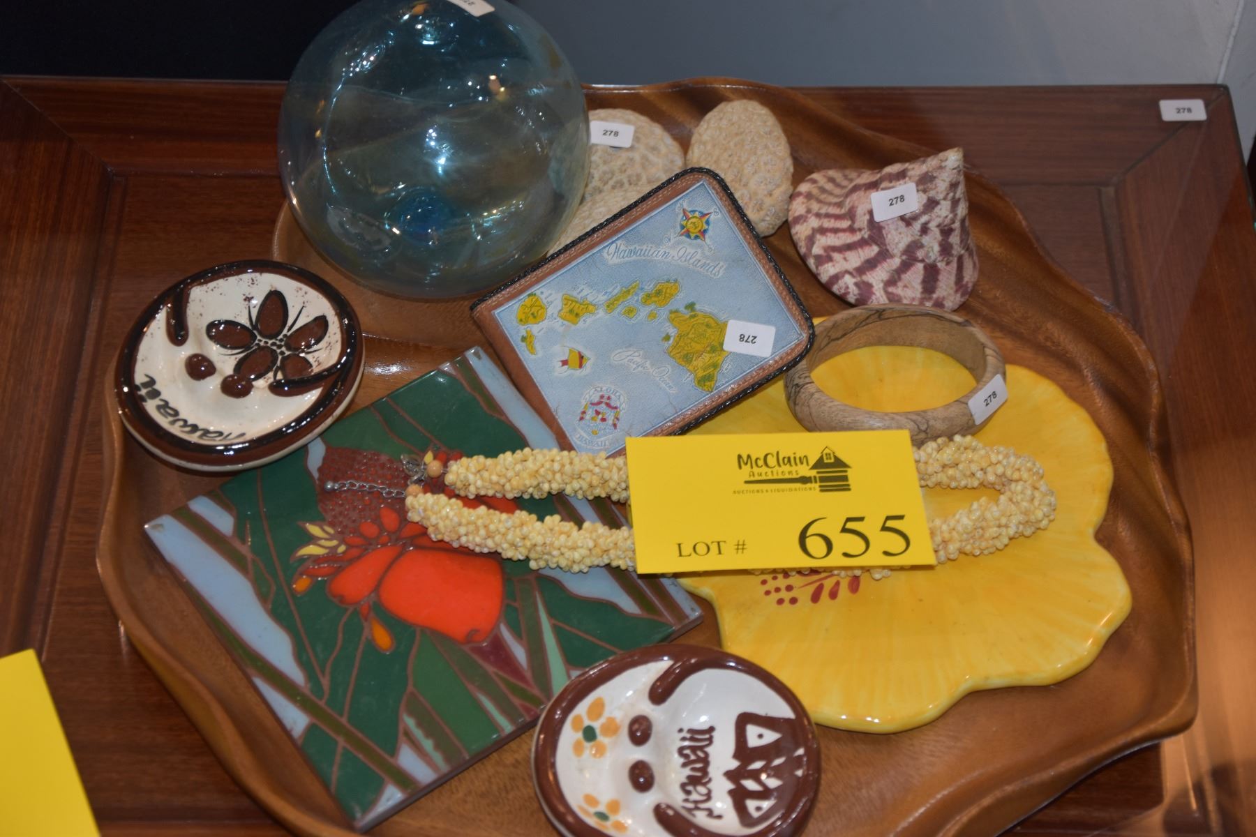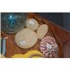 MIXED LOT: TRIVETS, CORAL SHELLS, WALLET, GLASS FLOAT, WOOD TRAY & SHELL NECKLACE