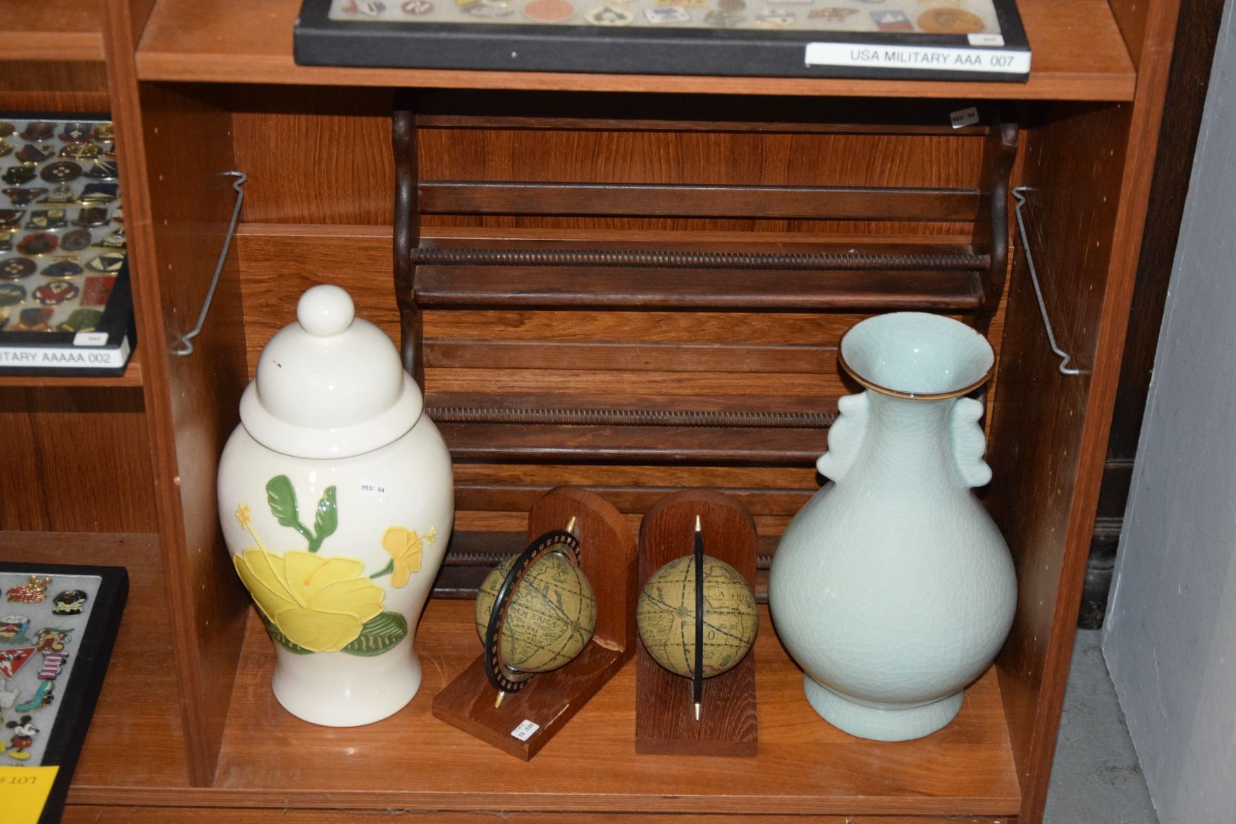 MIXED LOT: VASE, CERAMIC JAR W/LID, BOOK ENDS & SPICE RACK (5 PCS)