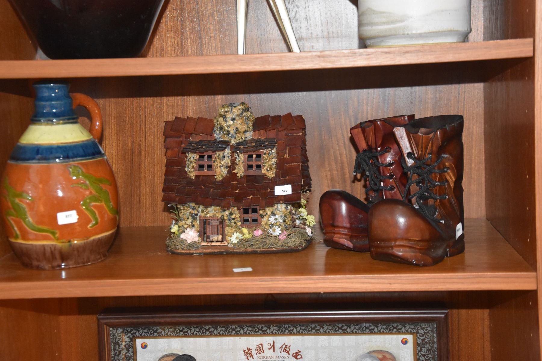 MIXED LOT: VASE, HOUSE & WOOD SHOES (4 PCS)